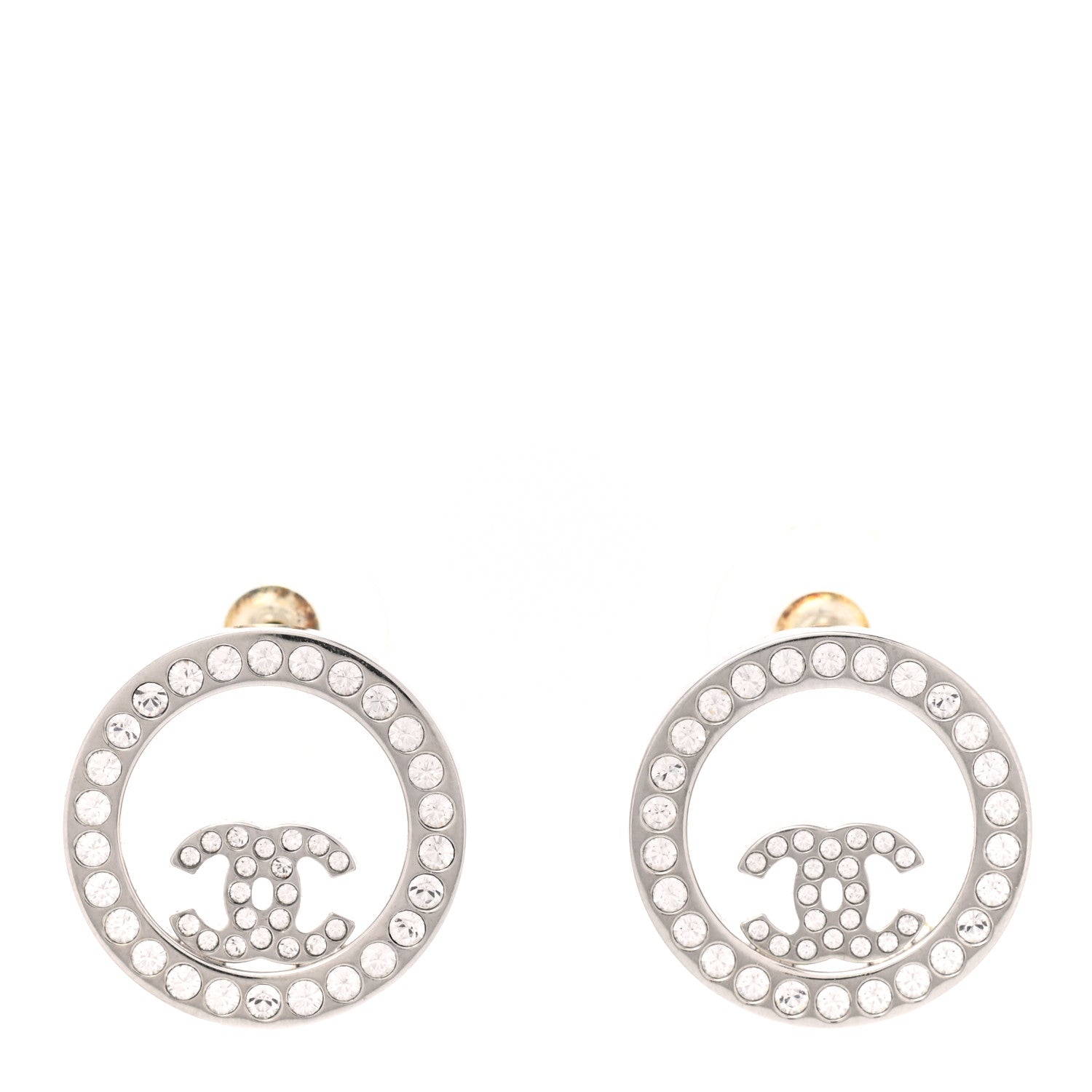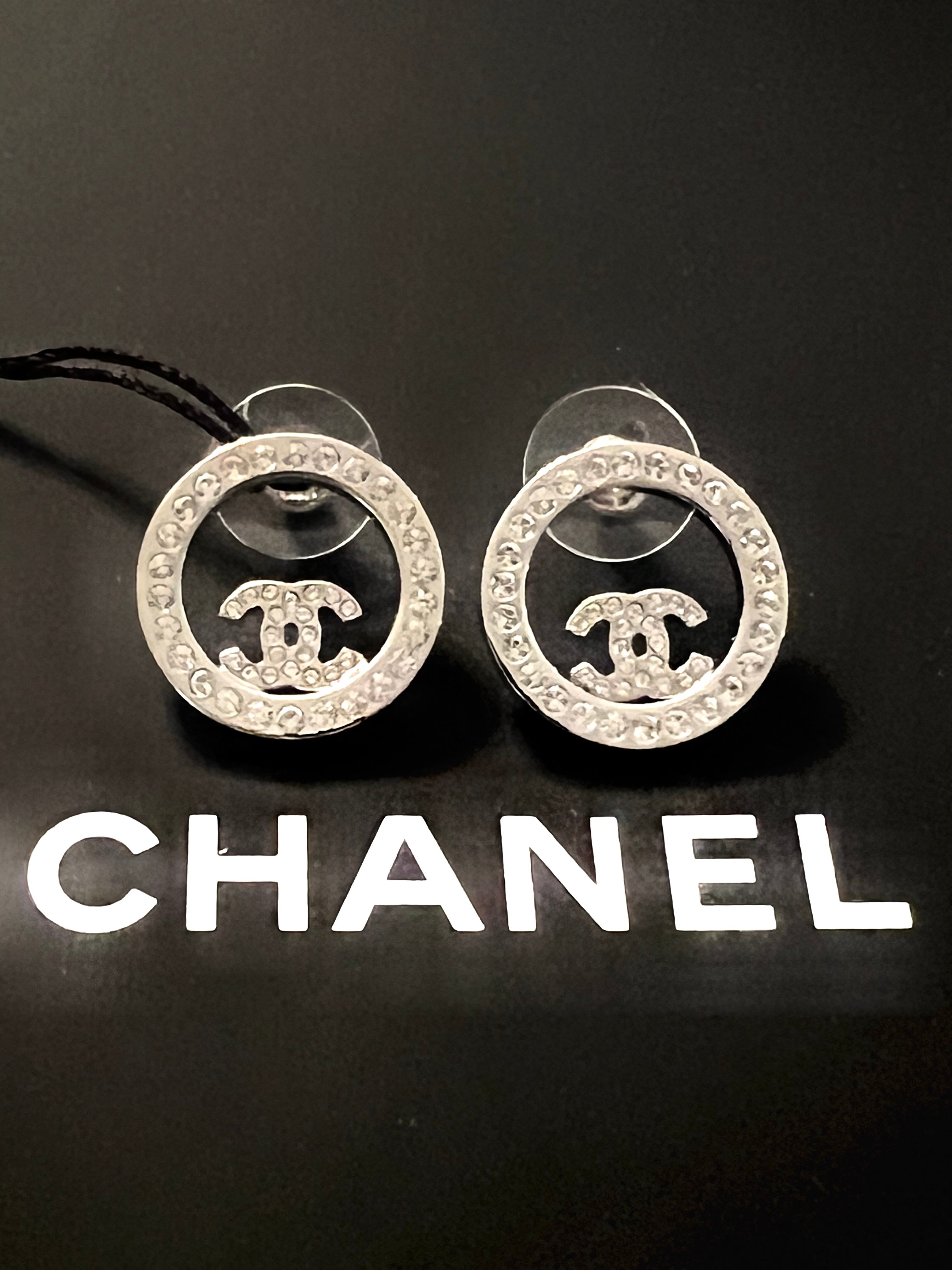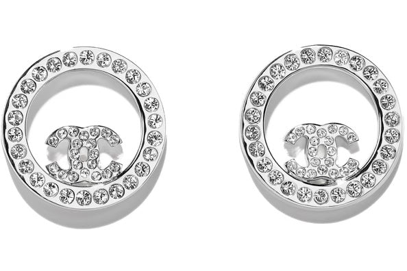 Stylish circular earrings feature a crystal-embellished silver CC logo in the center.