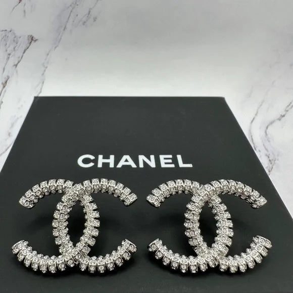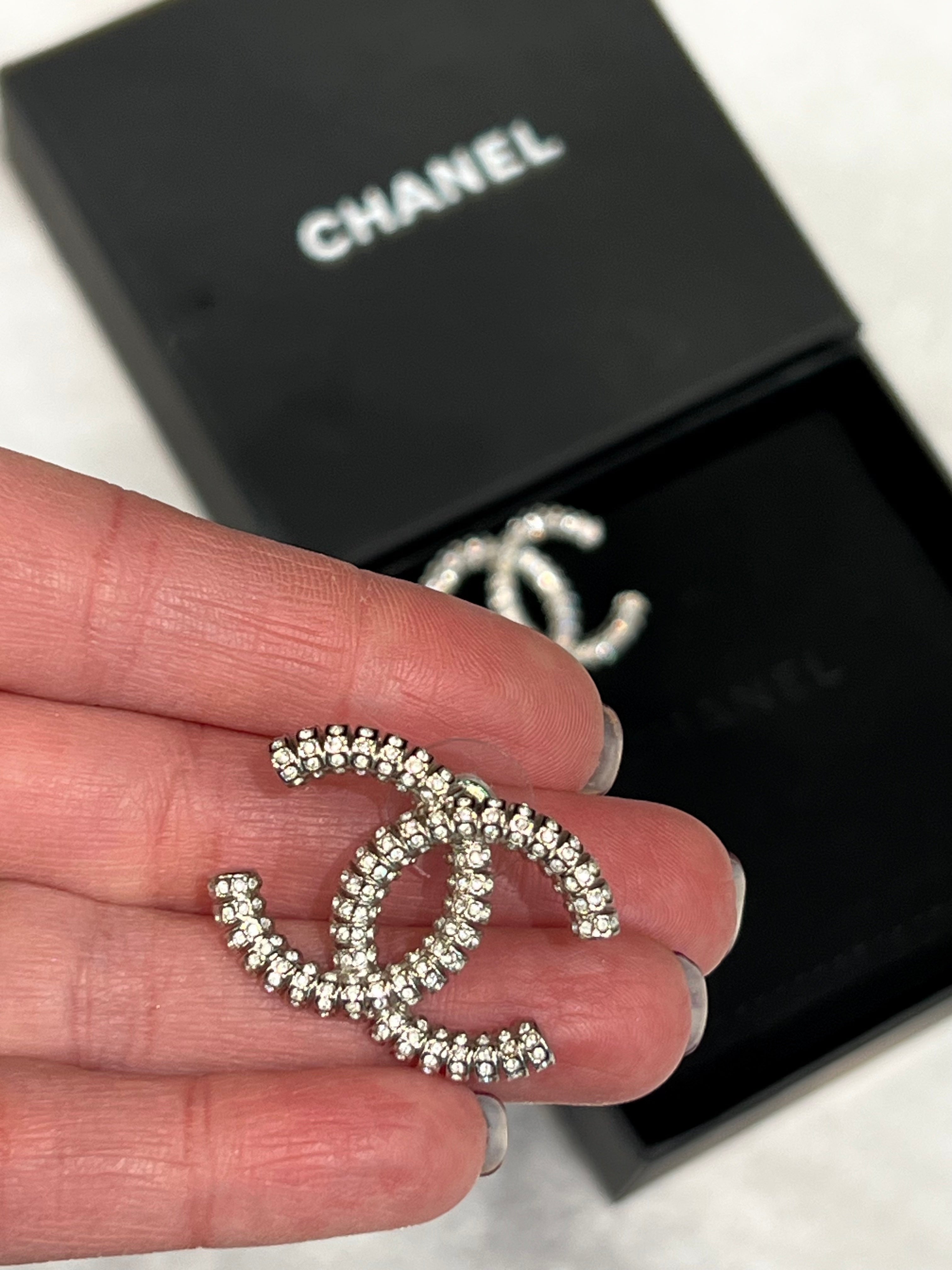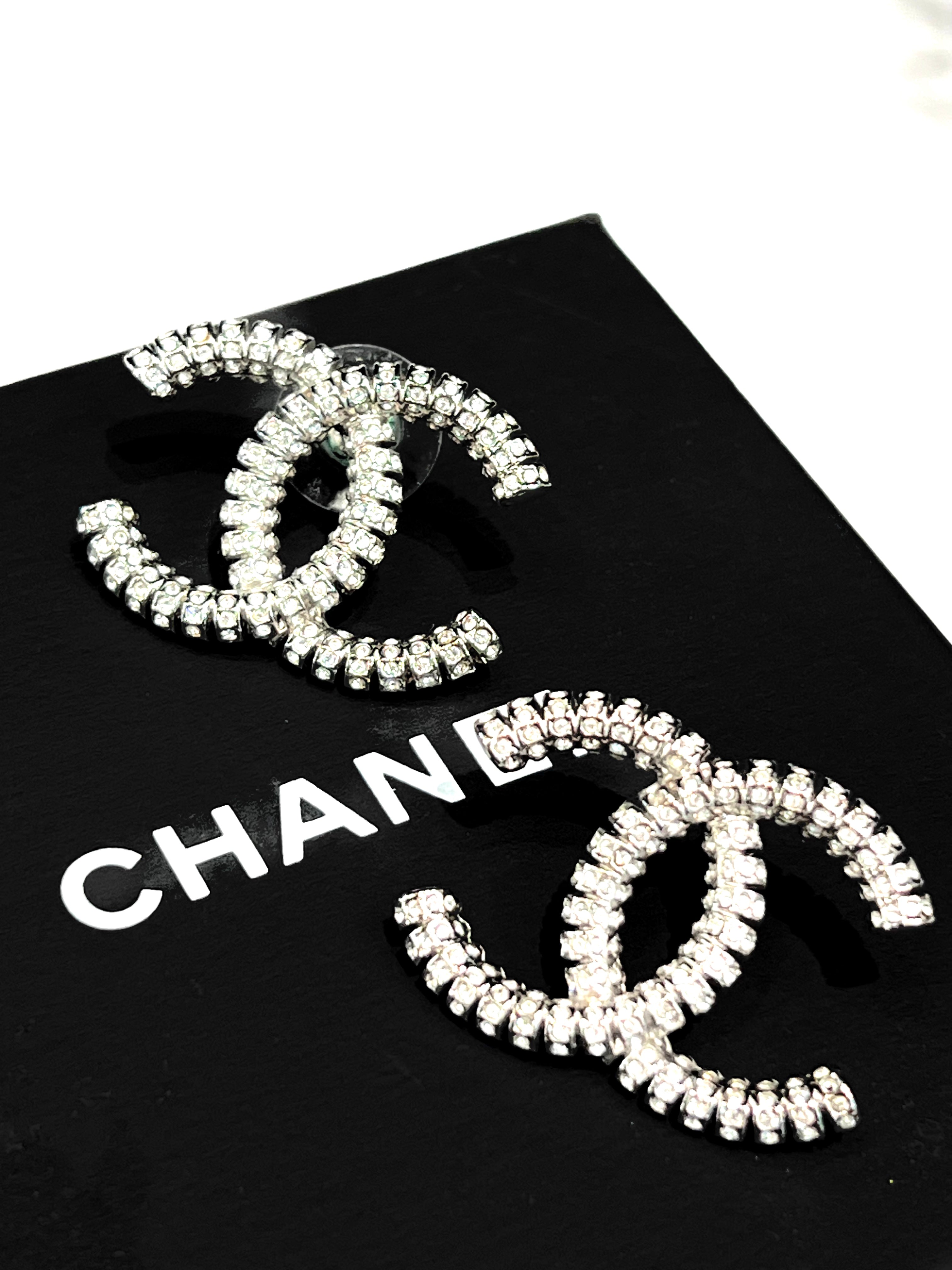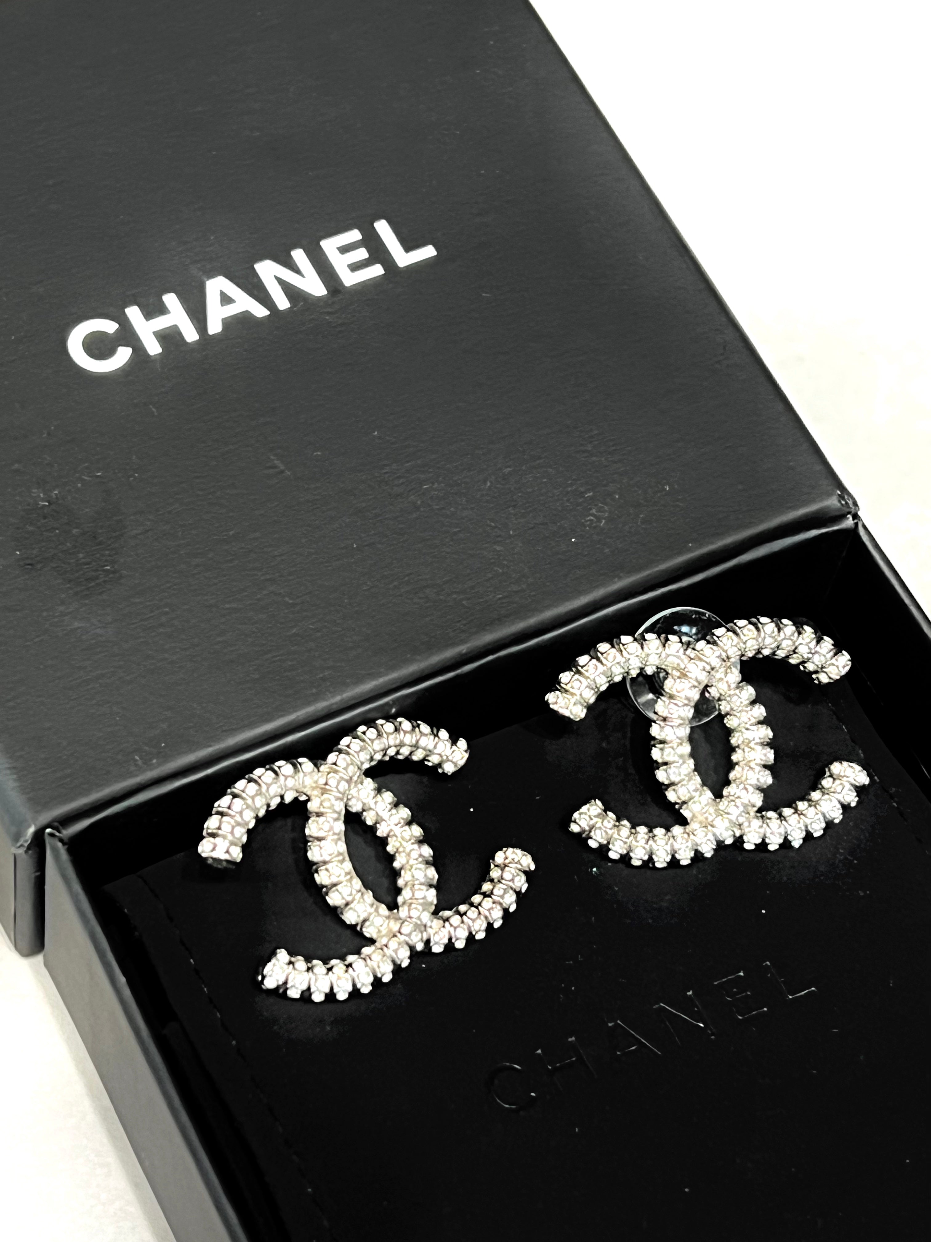CHANEL CC Earrings Crystal Silver Large Stud Statement Earrings