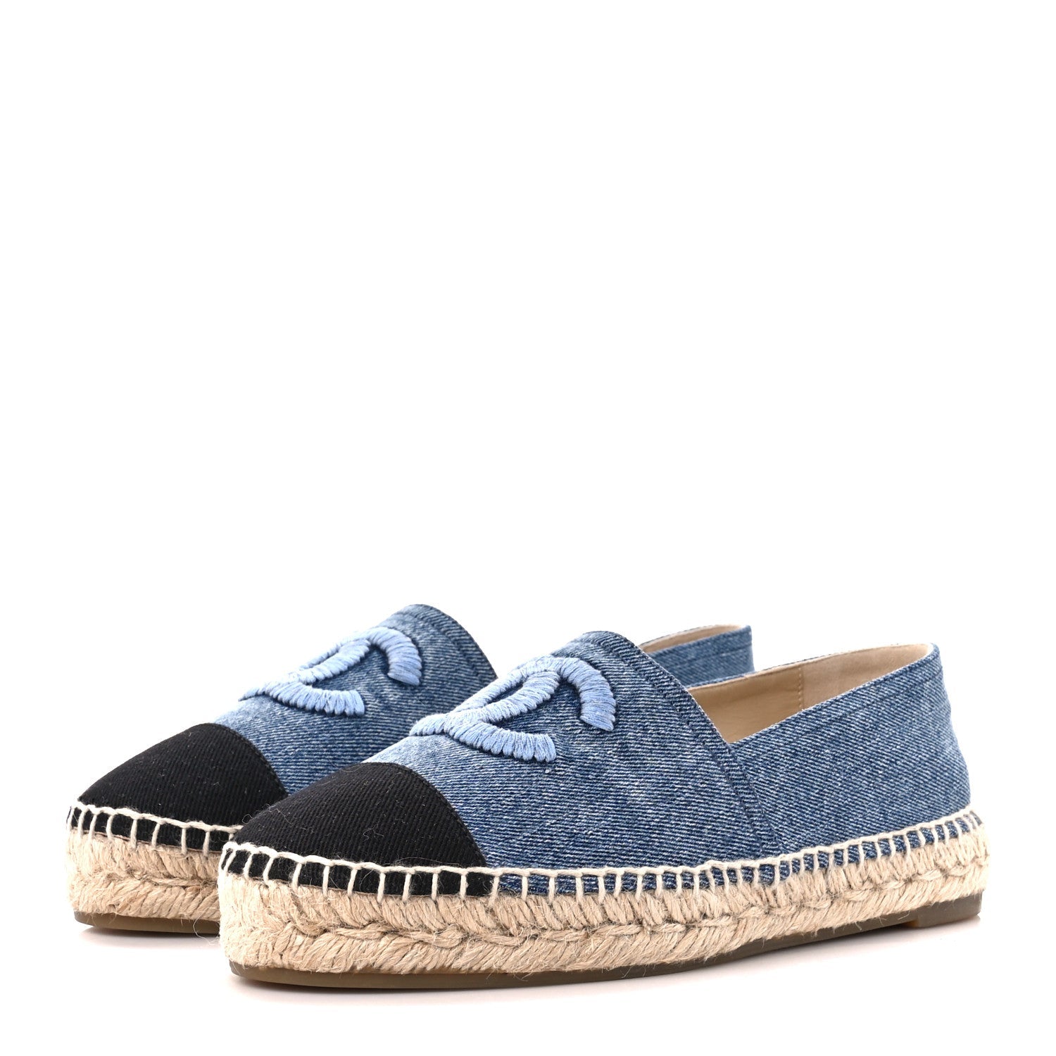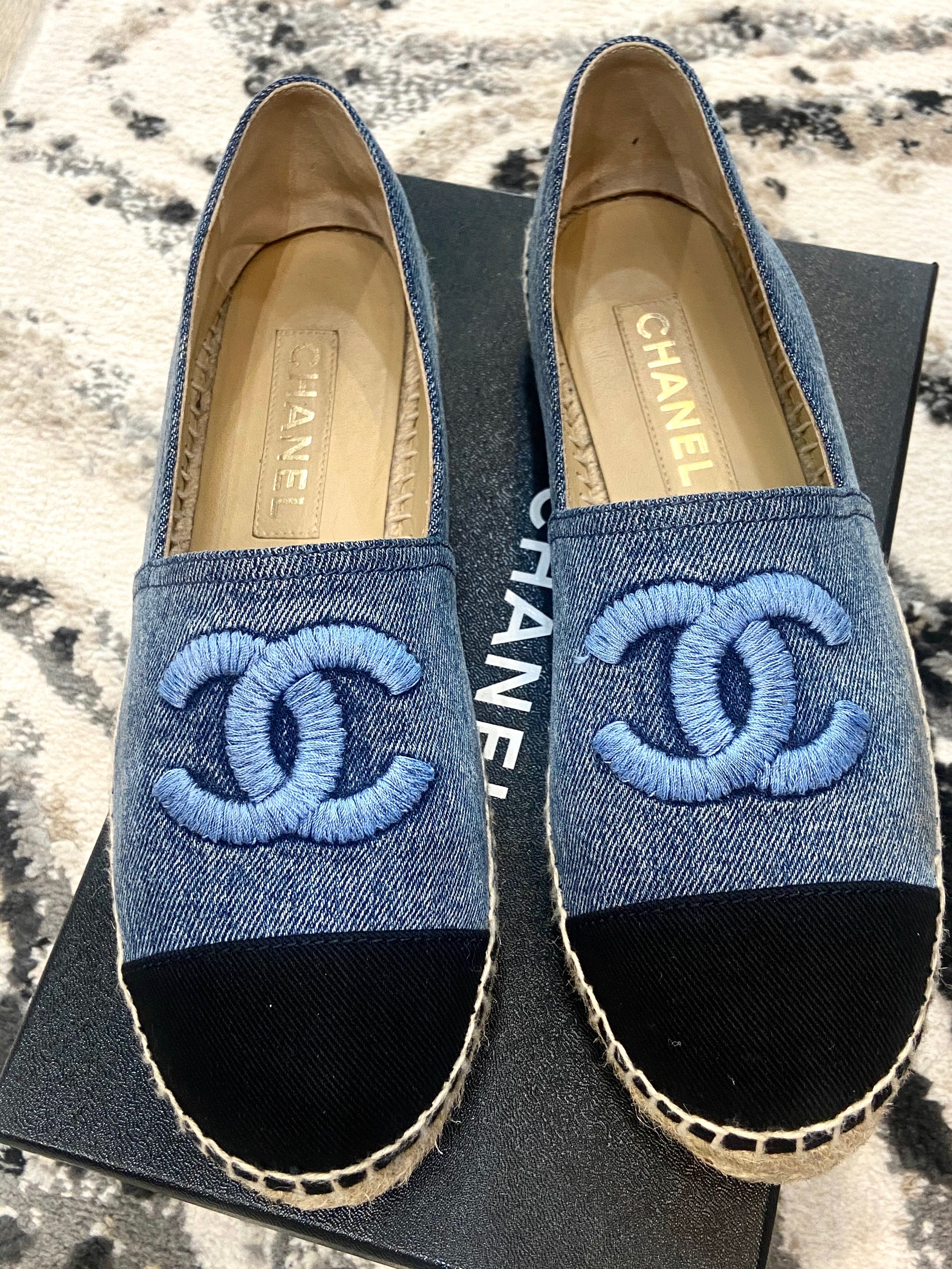 These Stylish Espadrilles have a slim midsole with uppers of black and blue denim. Feature a prominently stitched Chanel CC logo at the front of each shoe and have a black fabric toe cap.