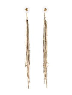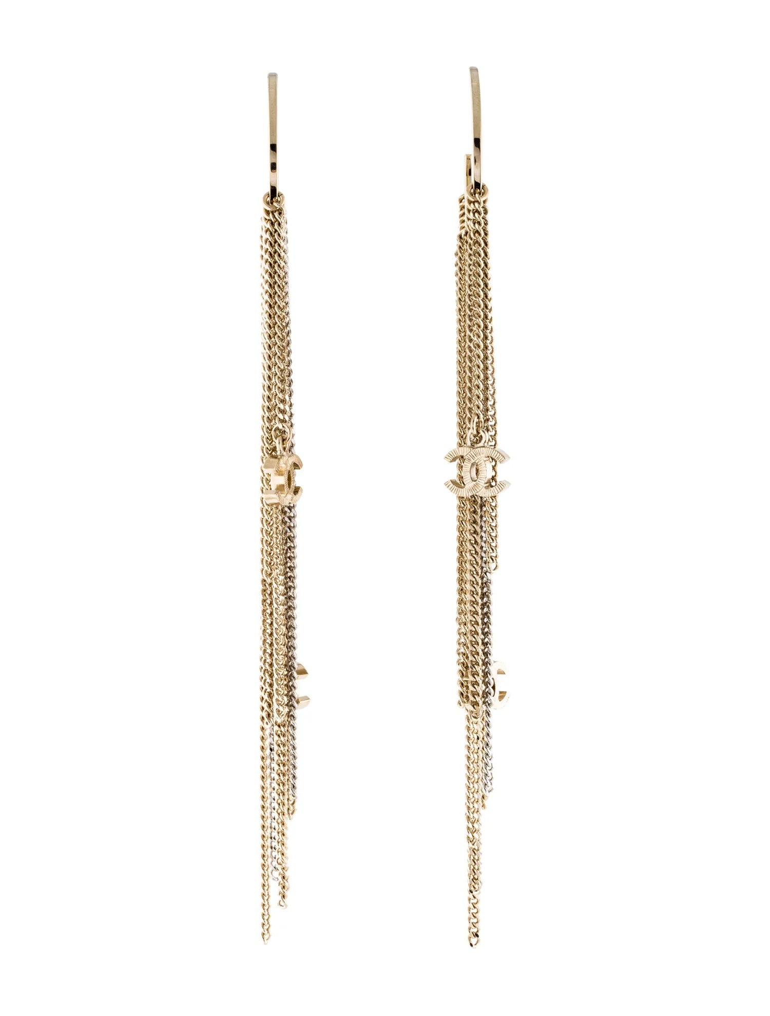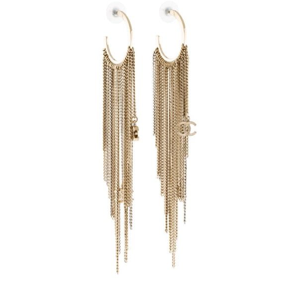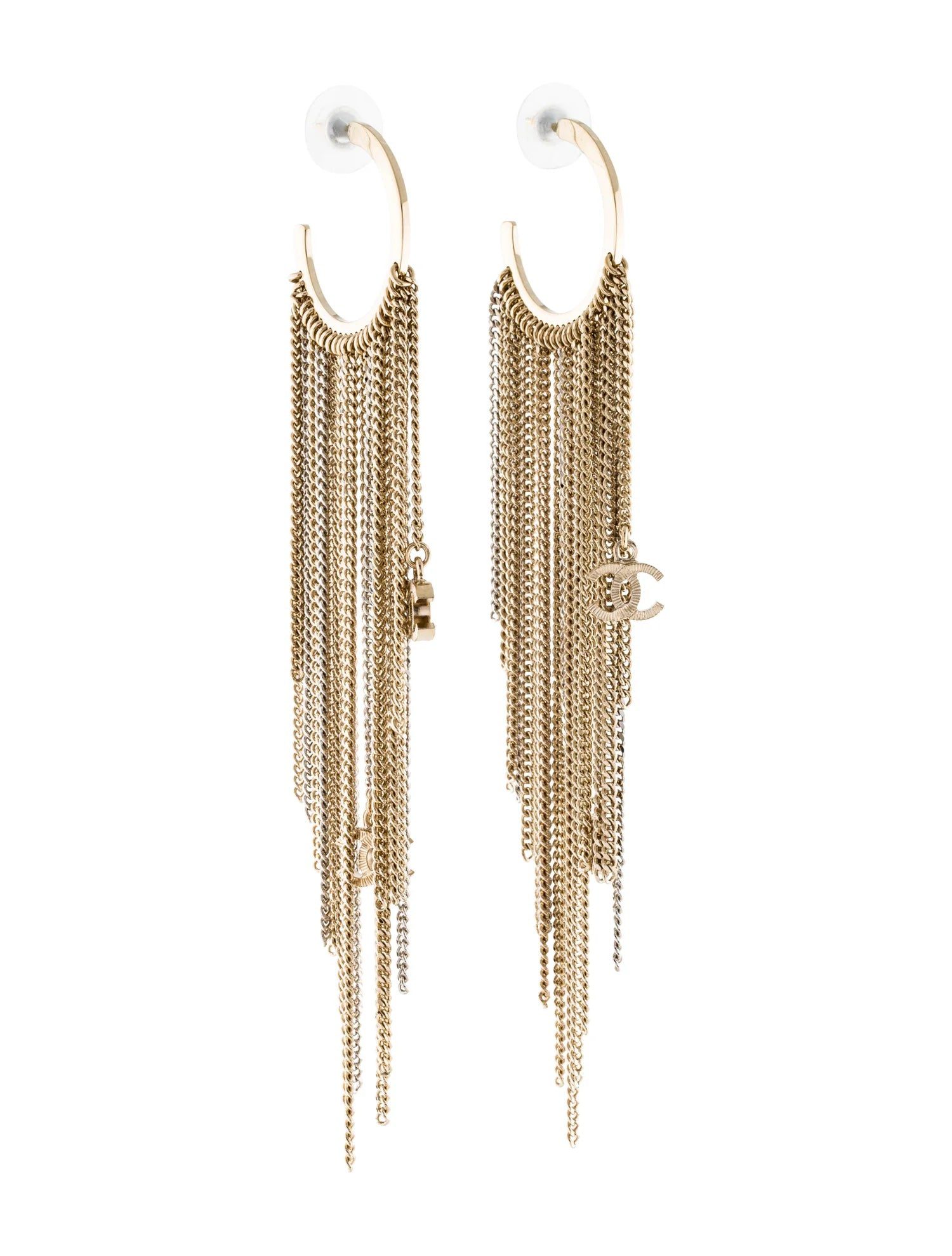 Gold-tone and silver-tone Chanel hoop fringe earrings featuring curb chain fringe with textured CC logo ornaments and clutch back closures. Metal Type: Gold-Tone Metal, Silver-Tone Metal.