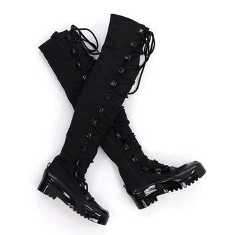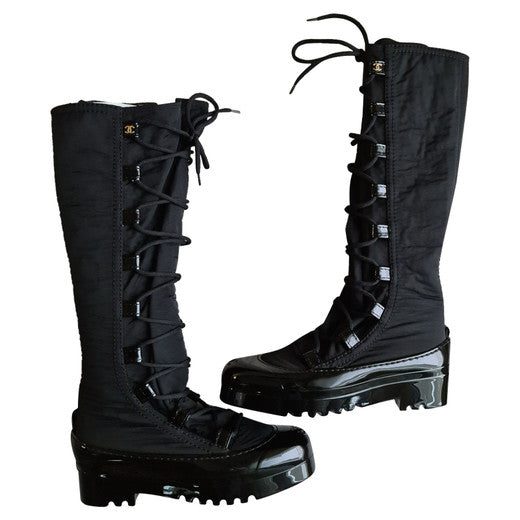 Black lace-up knee-high snow boots by Chanel.