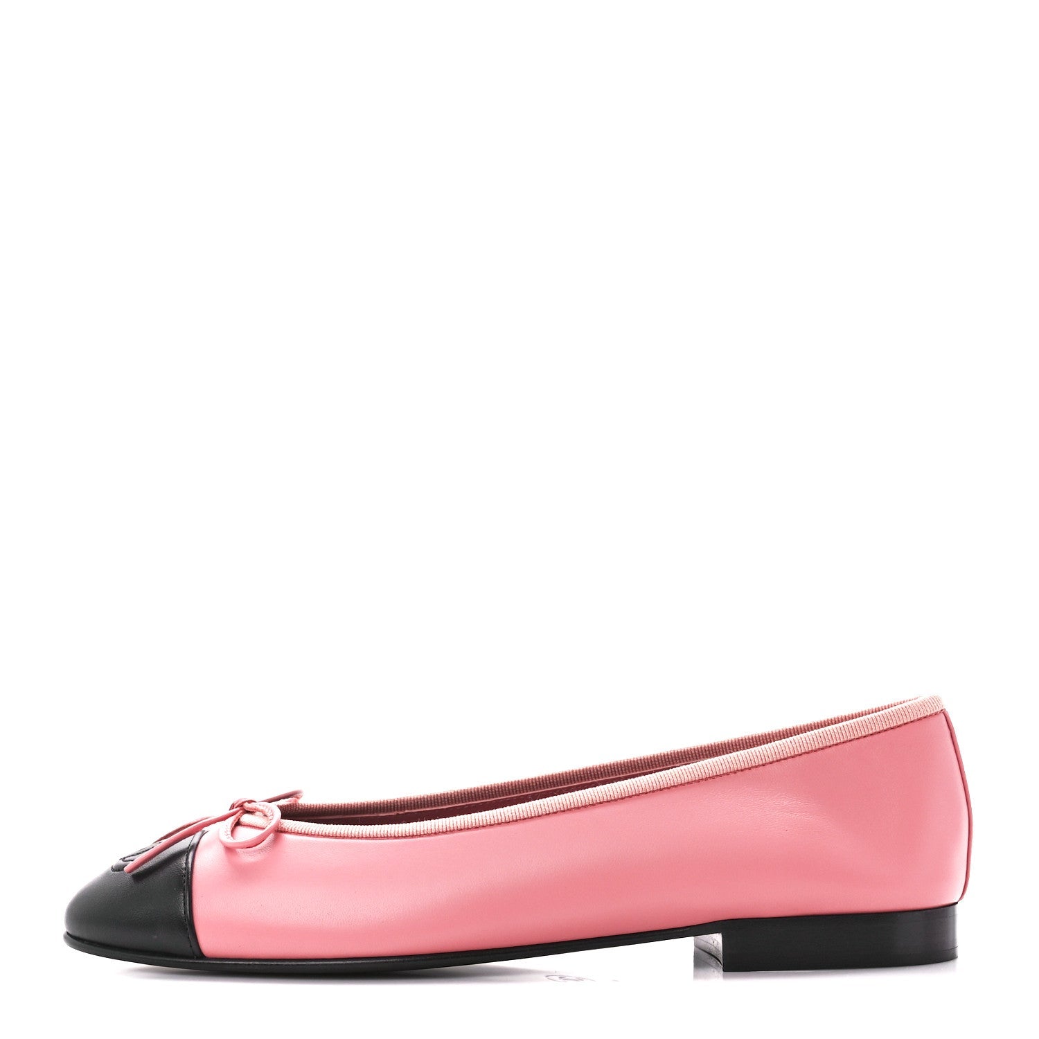 These Pink Lambskin leather flats shoes feature a half-inch stacked wooden heel, a black cap toe with a CC logo, and a leather bow.