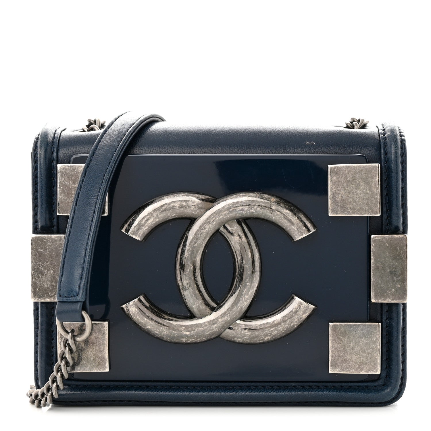 This stunning crossbody is Crafted of smooth dark blue Lambskin leather with a plexiglass and ruthenium block CC logo on the crossover flap.