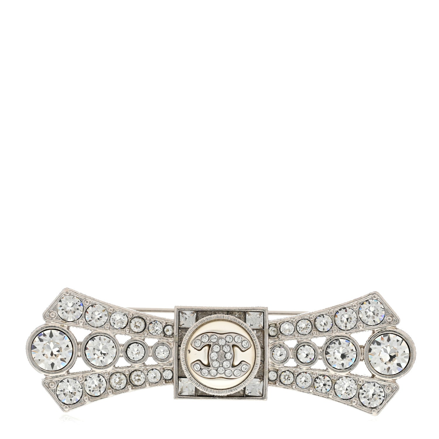 This Elegant Versatile Chanel accessory features a Silver-tone Bow Design Adorned with Shimmering Crystals and centered with the iconic CC logo.