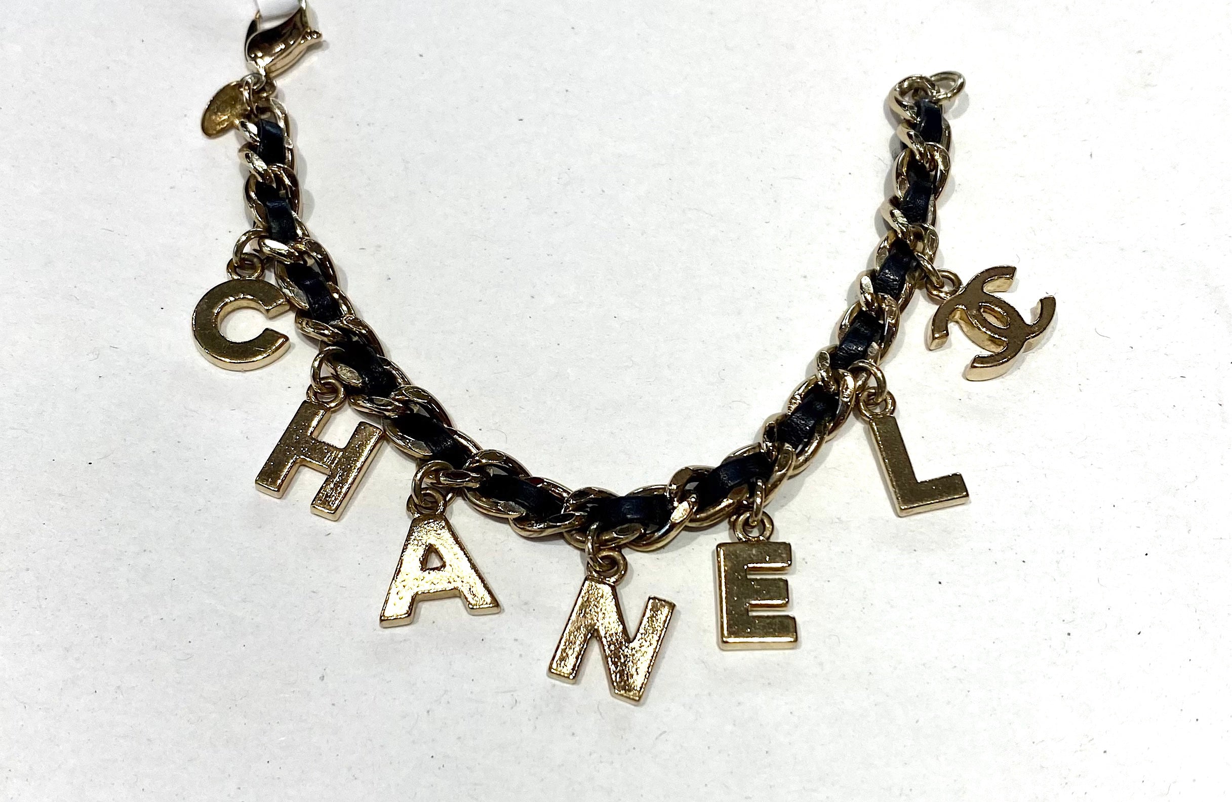 A chunky golden chain bracelet dangles with ‘C-H-A-N-E-L’ charms and the CC logo.