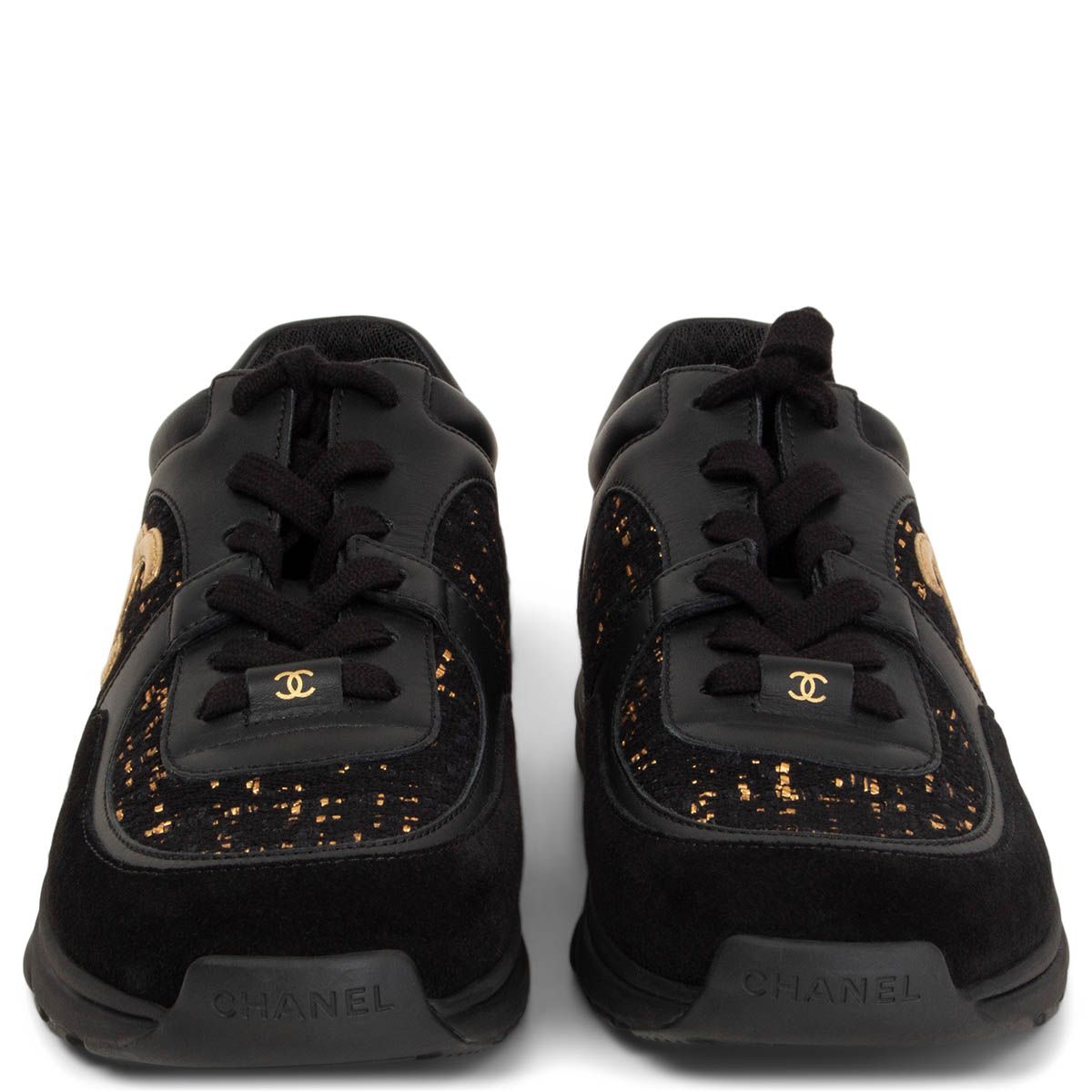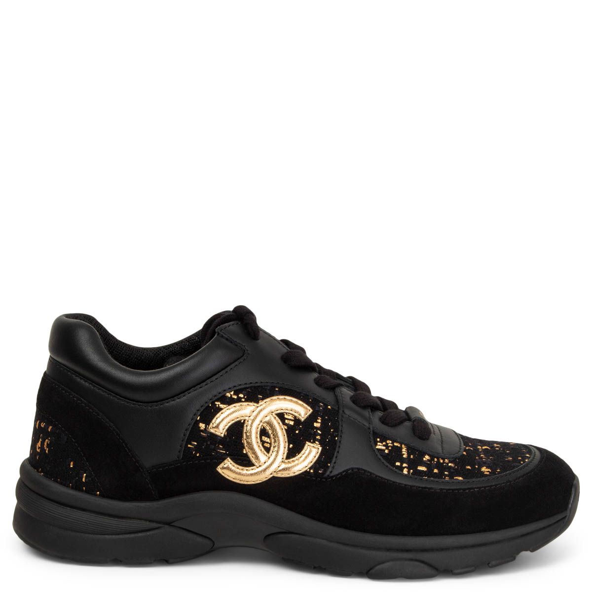Chanel low-top CC suede sneakers in gold and black tweed, suede, and calfskin. Features CC logo in gold-tone calfskin on the side and a black rubber sole.