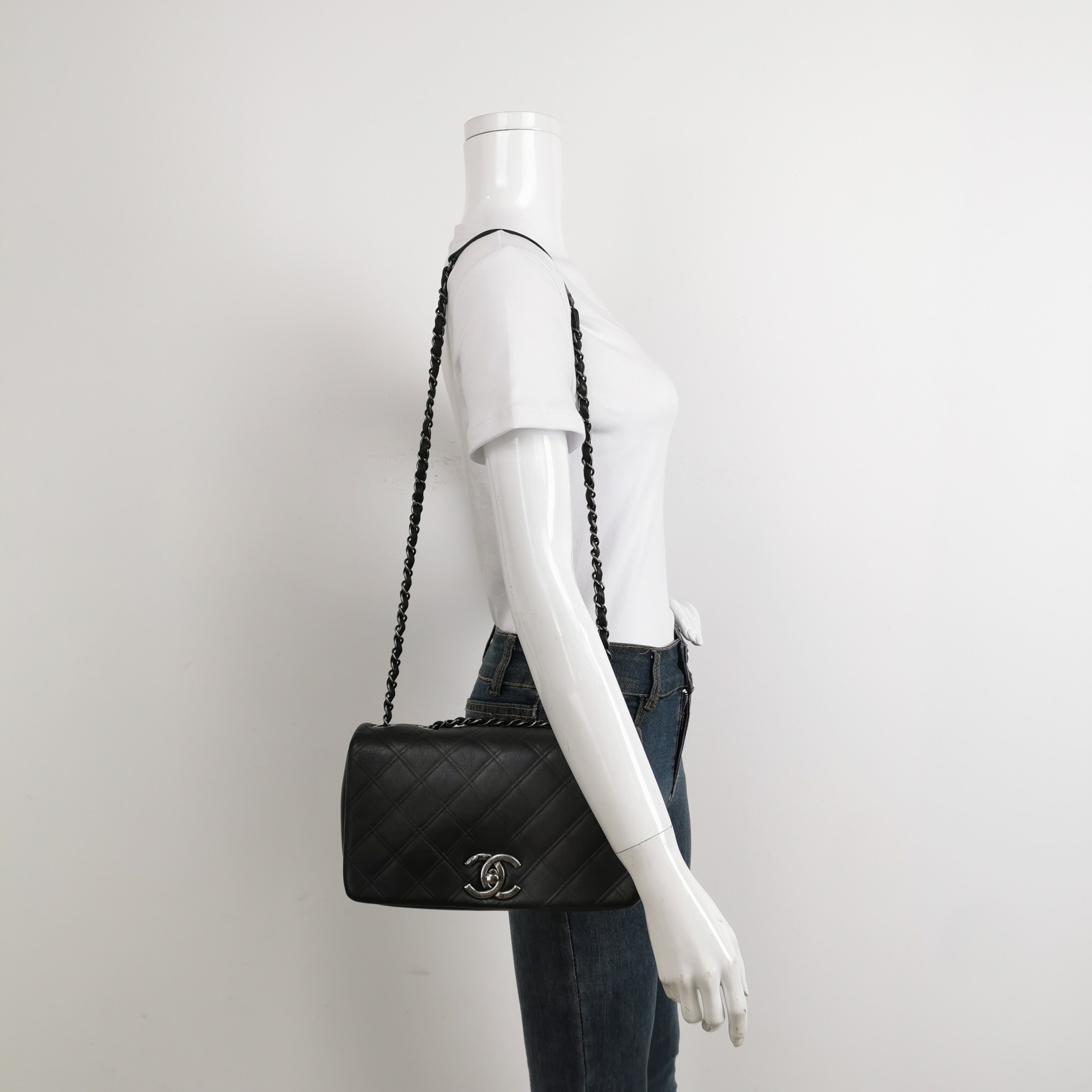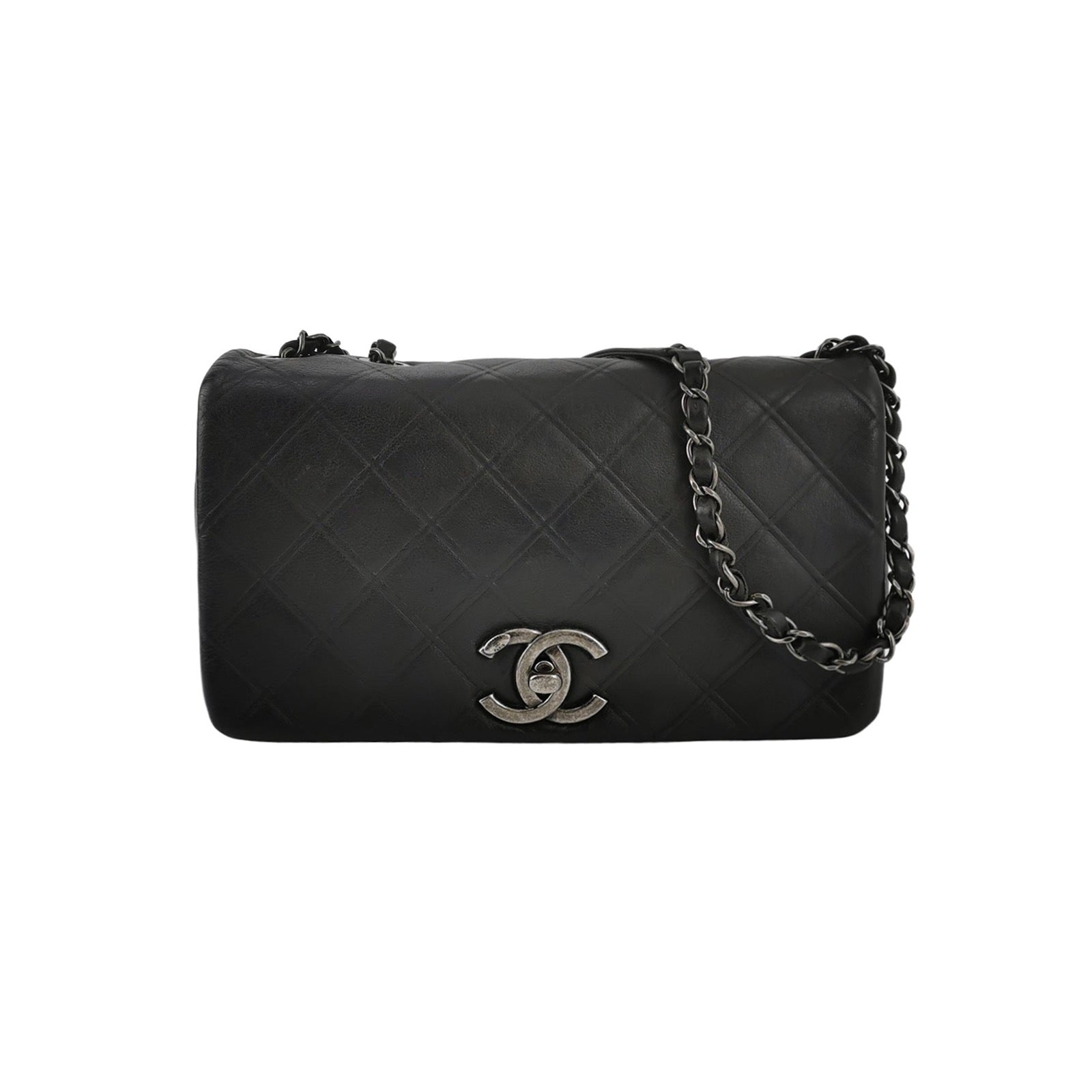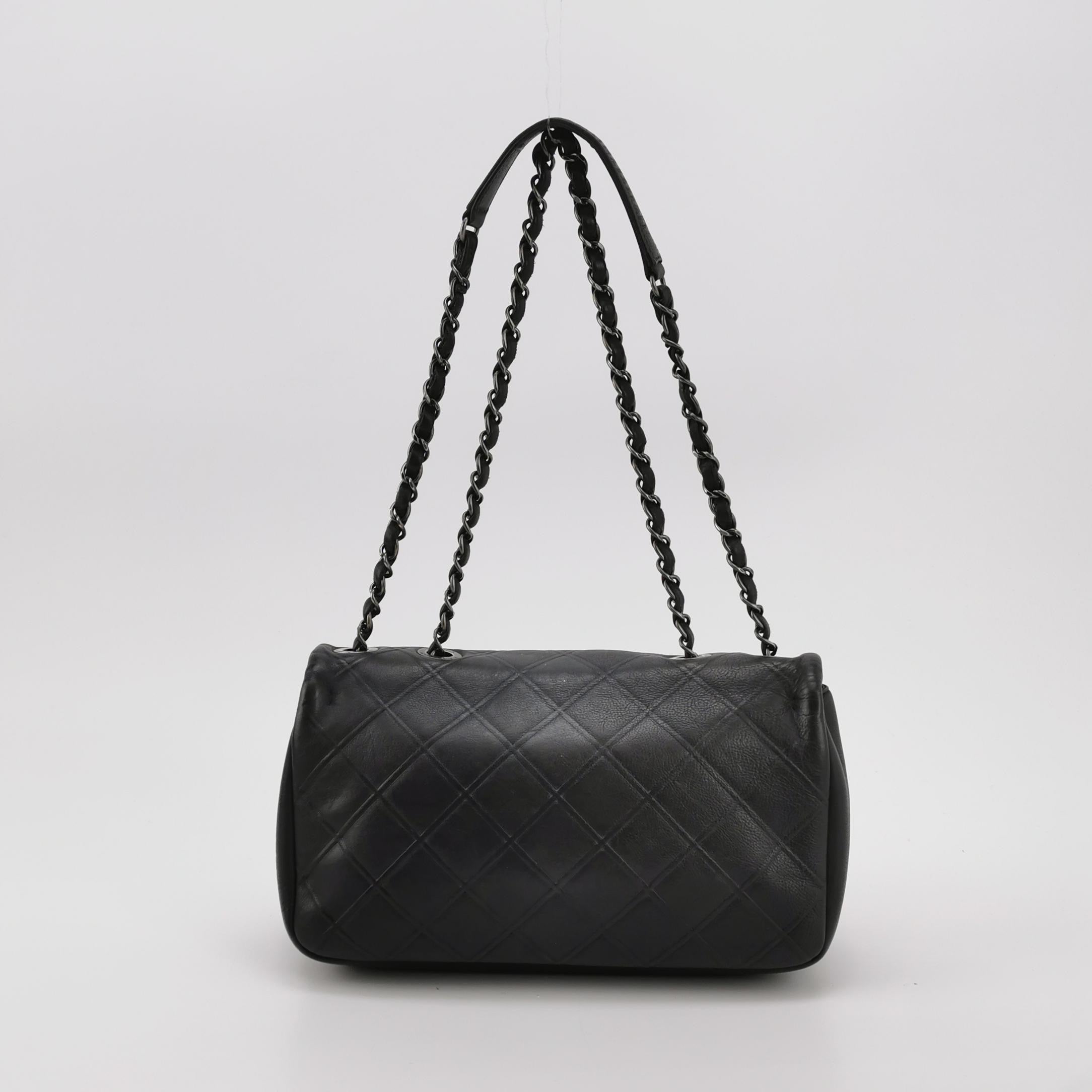 Constructed from black lambskin and adorned with silver gunmetal chains, this Chanel Enchained Boy Bag boasts both style and functionality. The iconic boy lock and famous Chanel Diamond quilting adorn the exterior, while the interior offers ample storage with two pockets and a zipped compartment. With a chain and leather shoulder strap, this bag is a perfect blend of edgy and practical for smart casual wear.