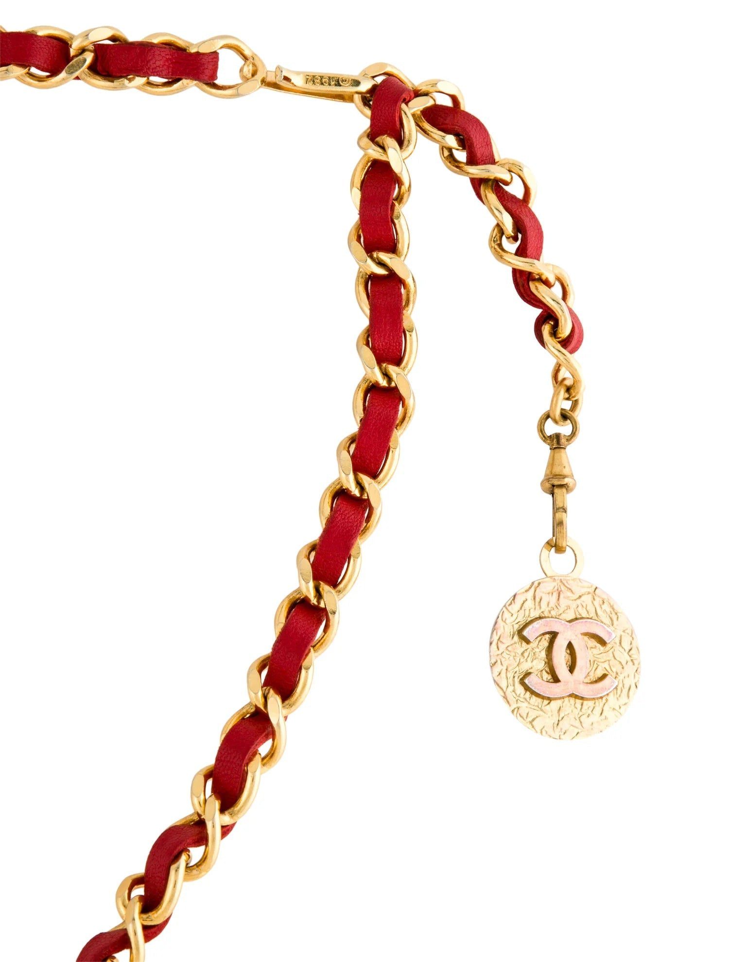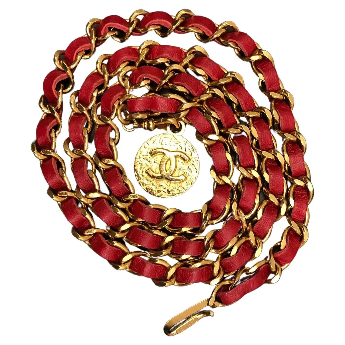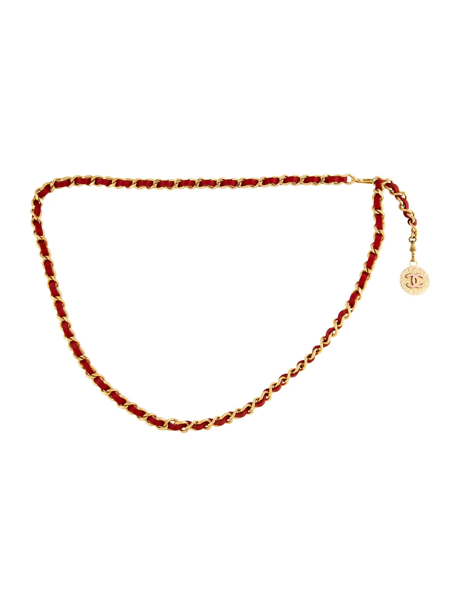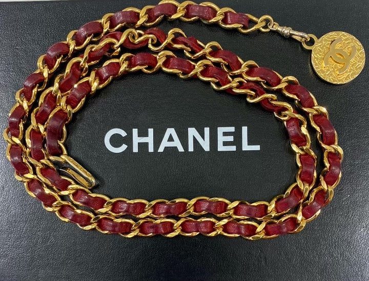 This vintage Chanel leather chain belt is crafted of slim gold toned chain interlaced with red leather featuring a CC coin. Adjustable hook fastening.