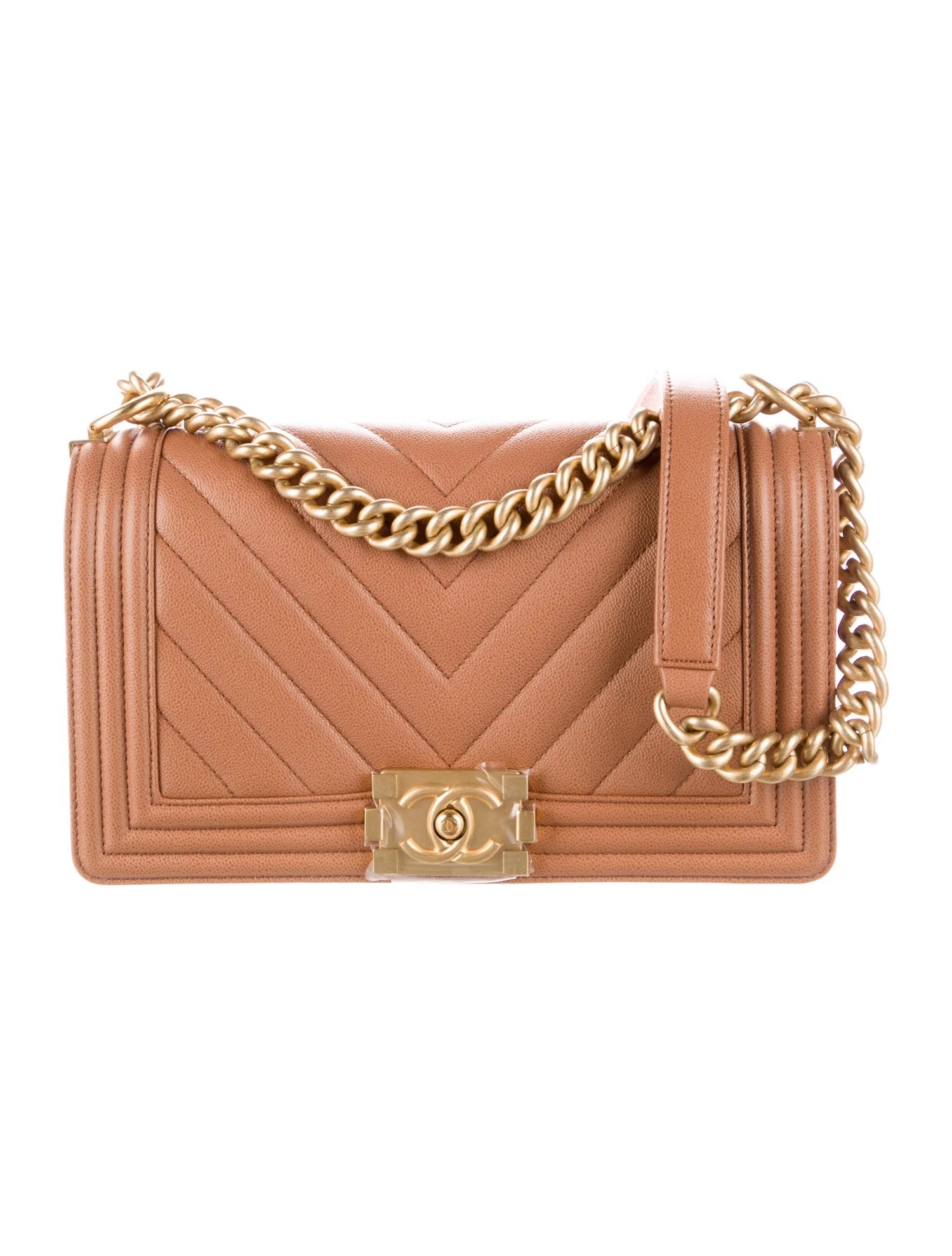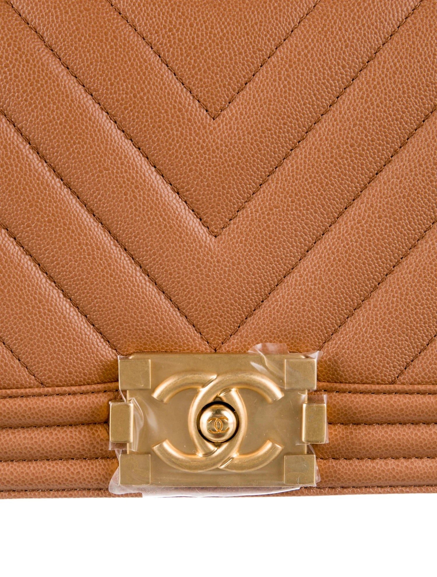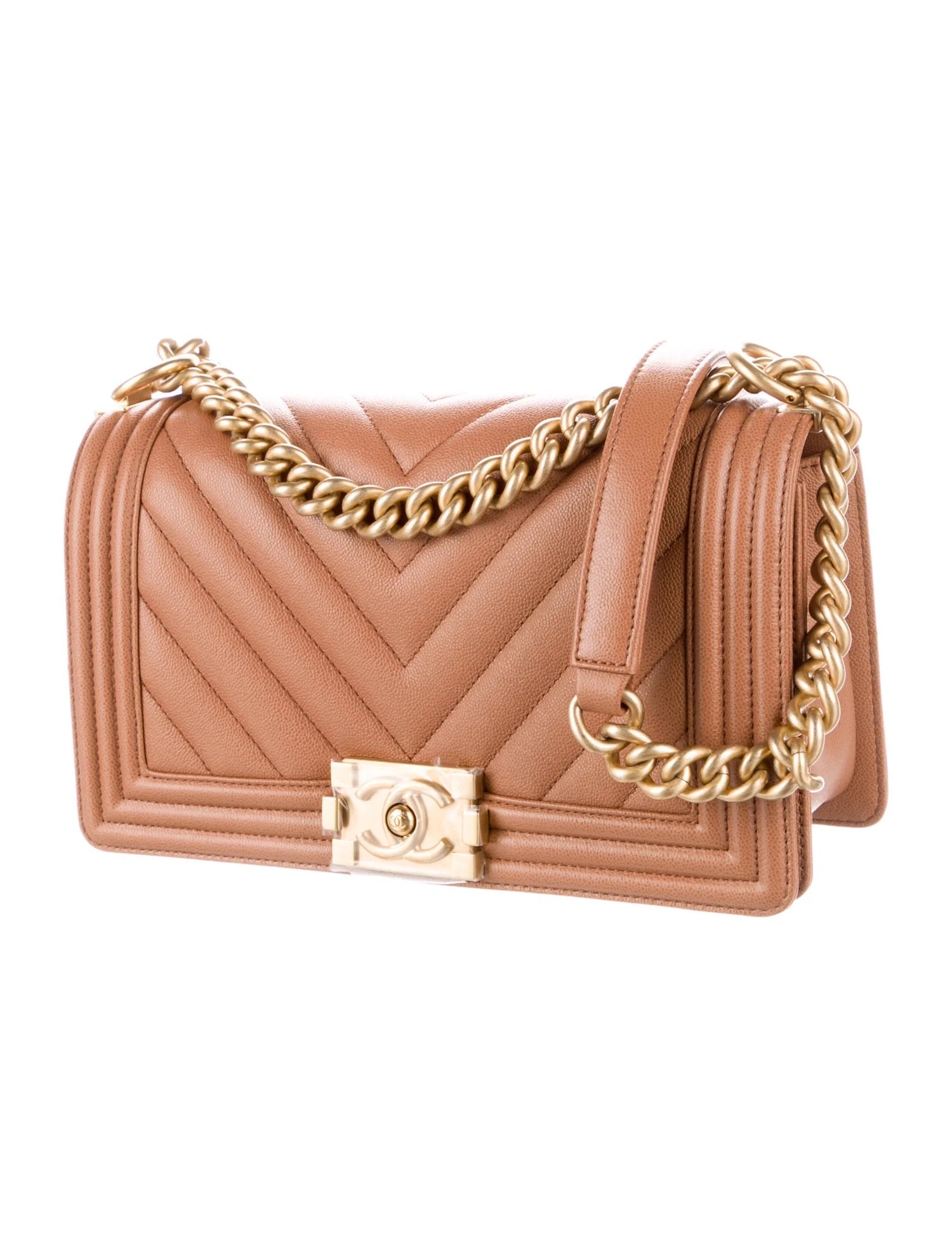 This Stunning shoulder bag is crafted of chevron padded quilted calfskin leather with a border frame of linear quilted soft leather. The medium sized bag features a waist length cross body thickly linked aged gold chain with a shoulder pad and facing aged gold squared Chanel Boy press lock. This opens the facing flap to a beige fabric interior with a patch pocket.