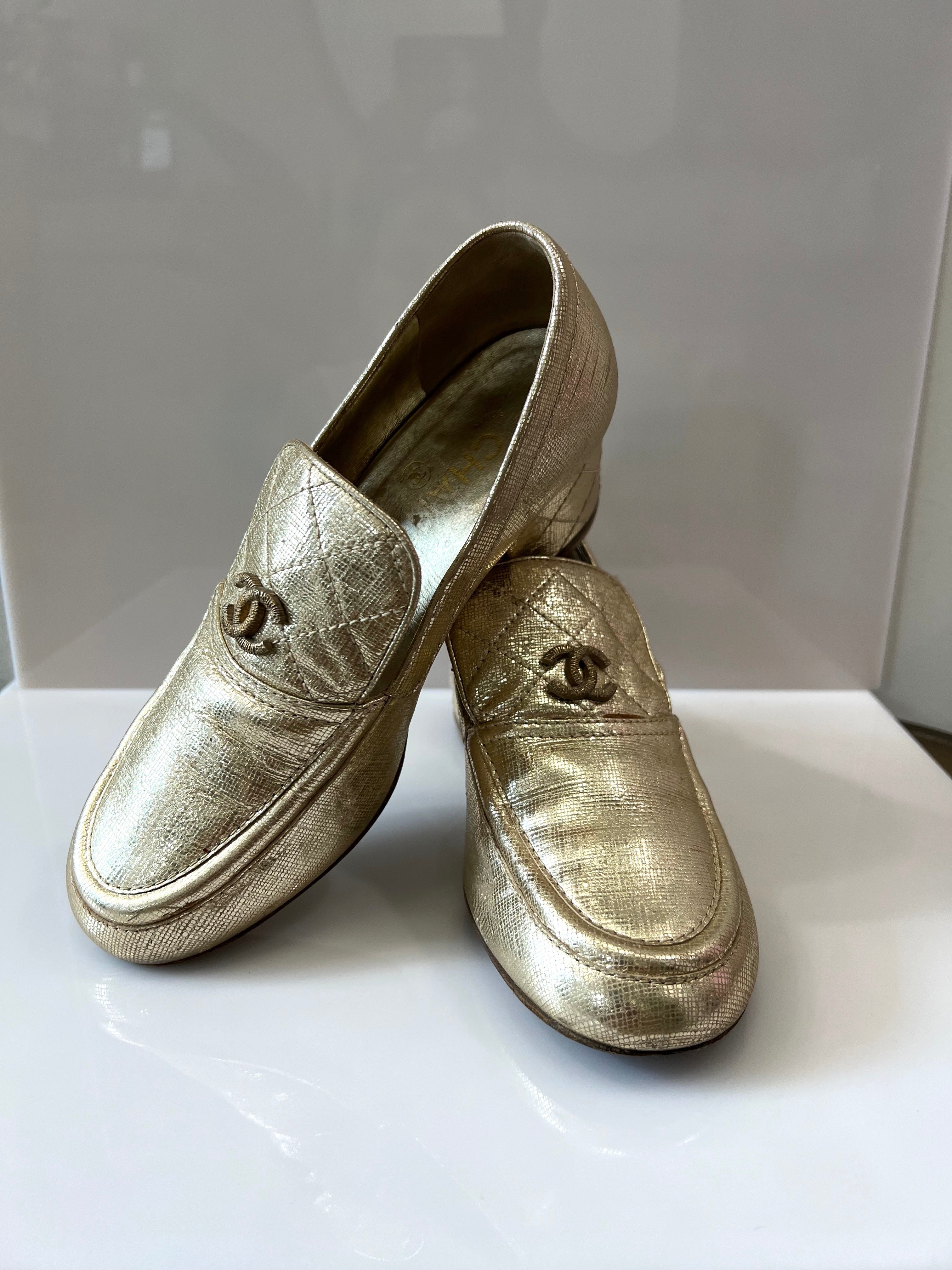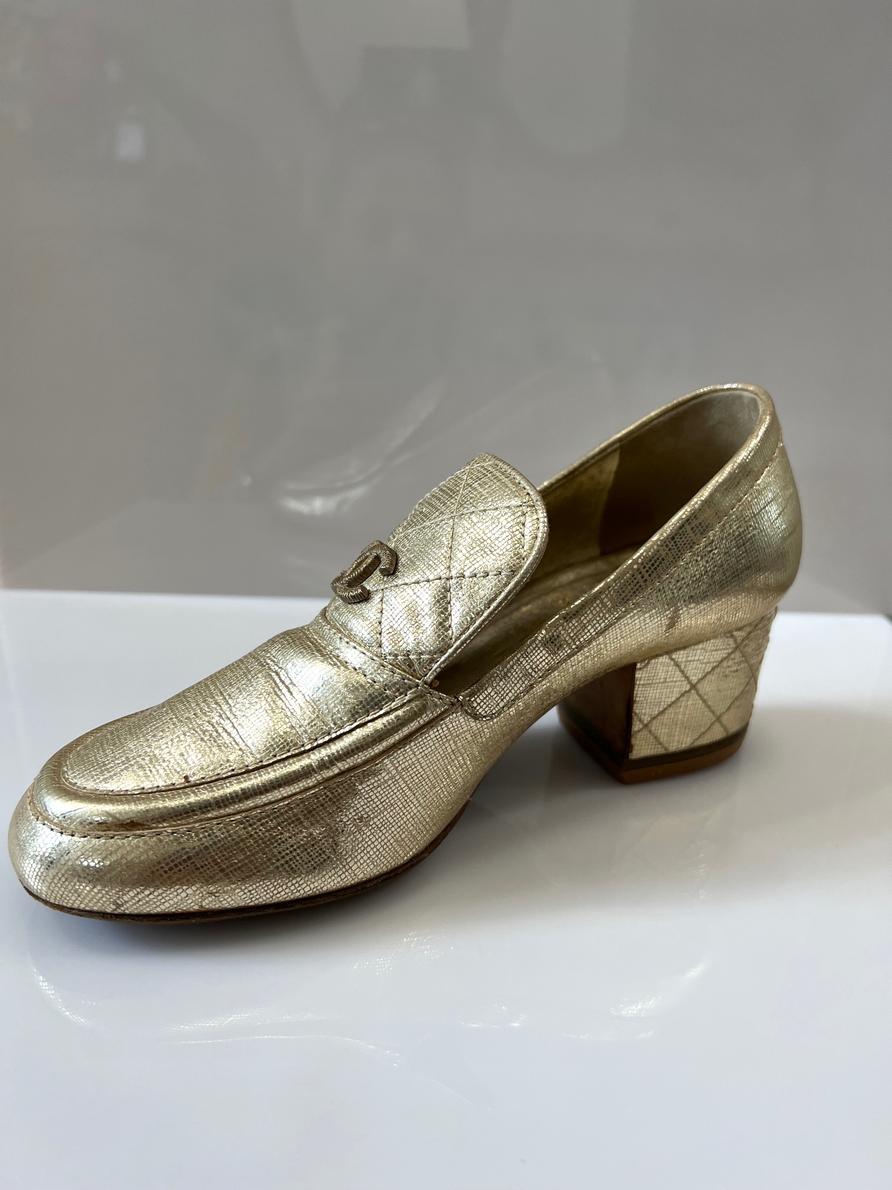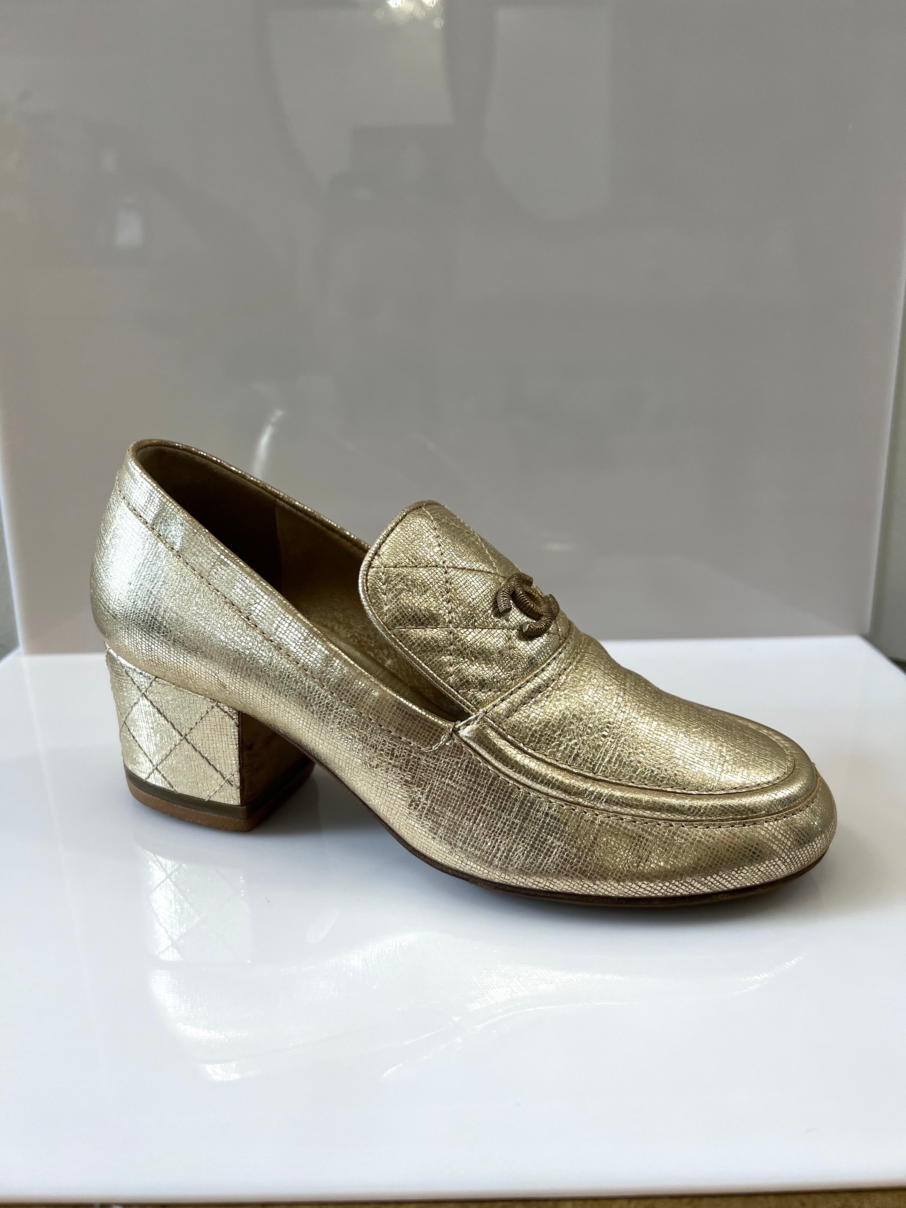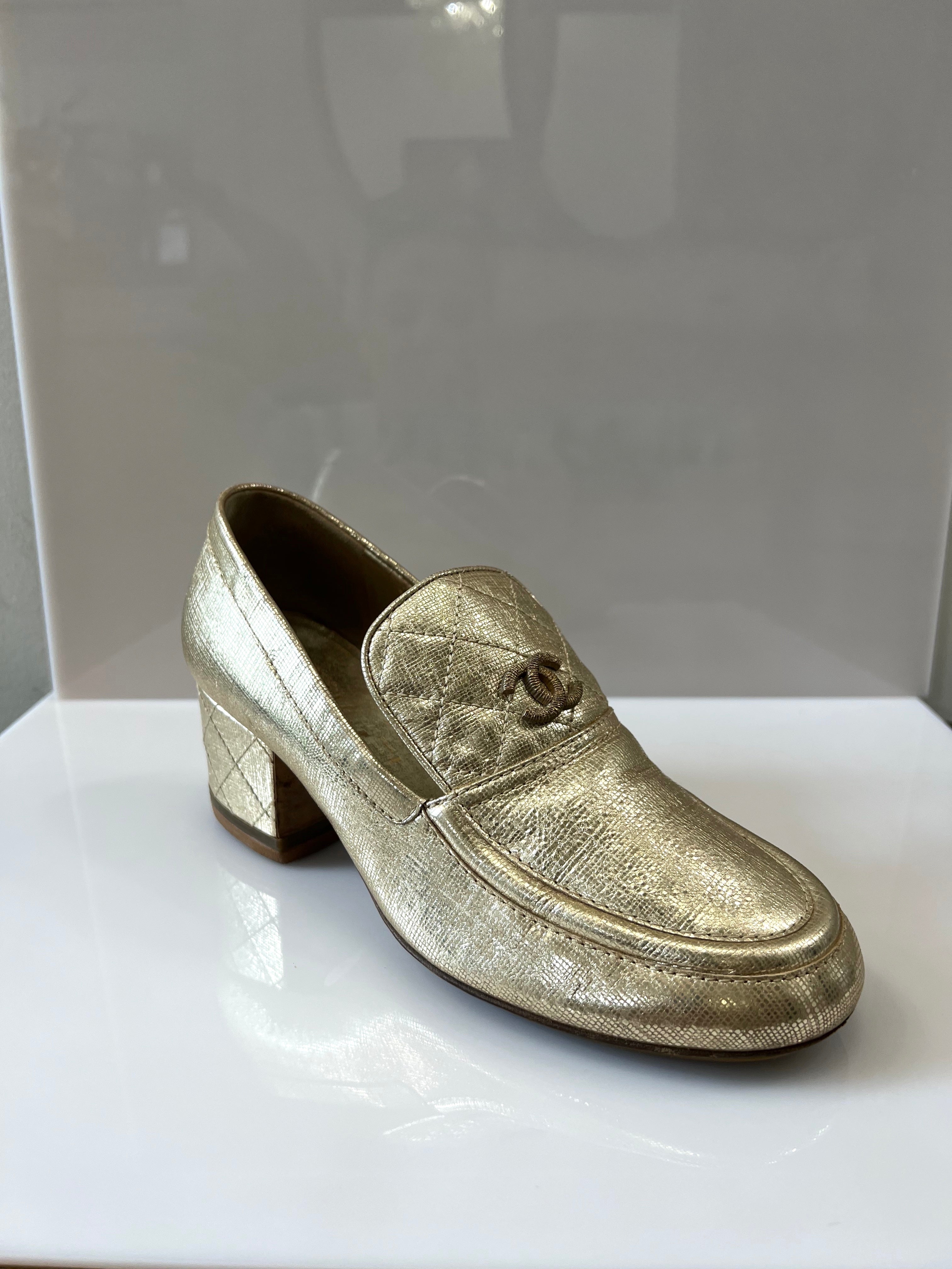 CHANEL CC METALLIC GOLD TEXTURED LEATHER STACKED HEEL LOAFERS