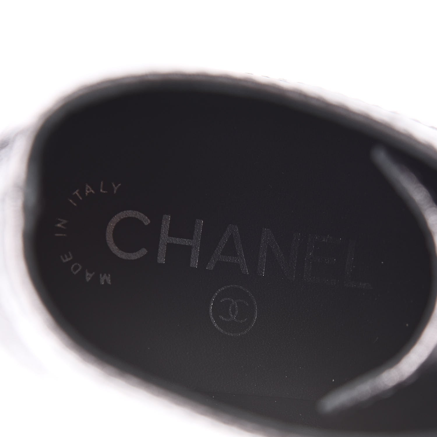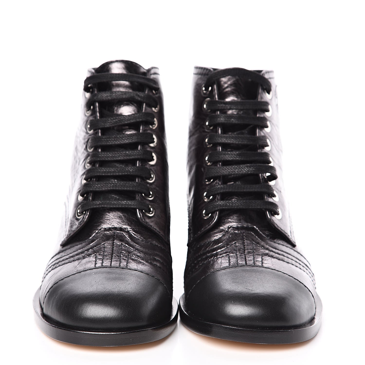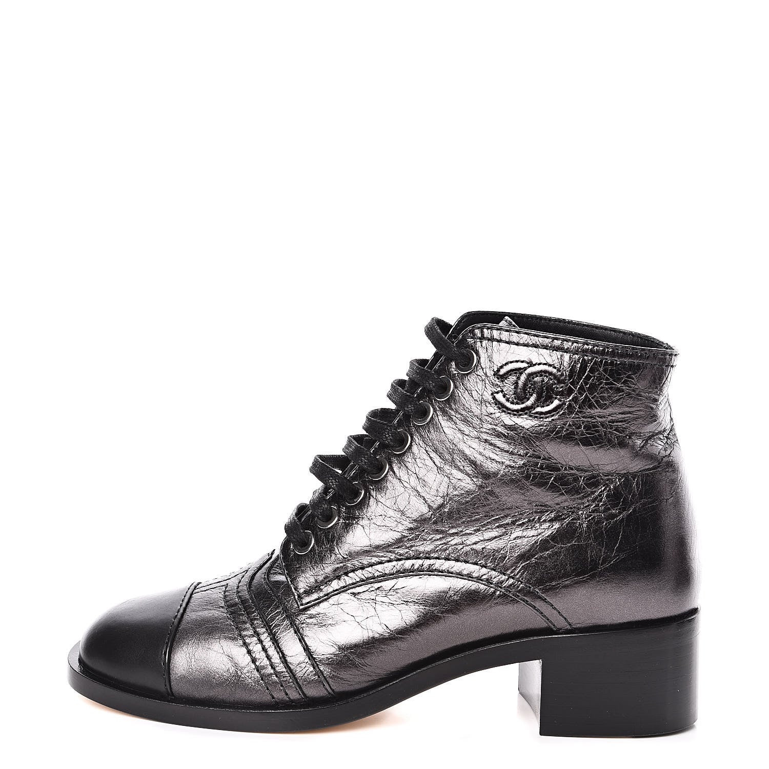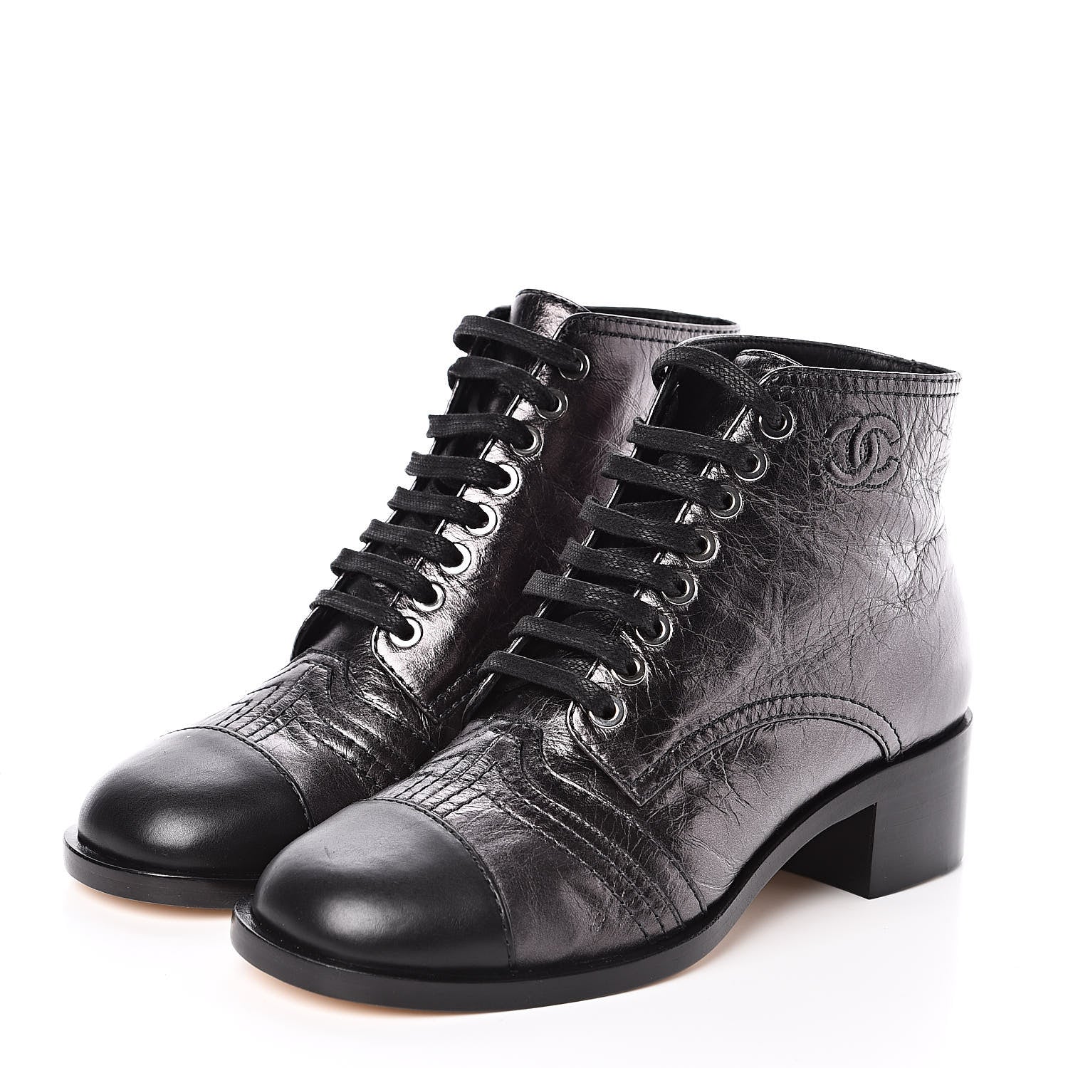 These stylish lace-up boots are crafted of crumpled shiny black lambskin leather. They feature rounded black, smooth leather cap toes, a 1.5-inch heel, a small embroidered Chanel CC along the top outer edge, thin leather shoelaces, and side zippers for easy foot insertion.