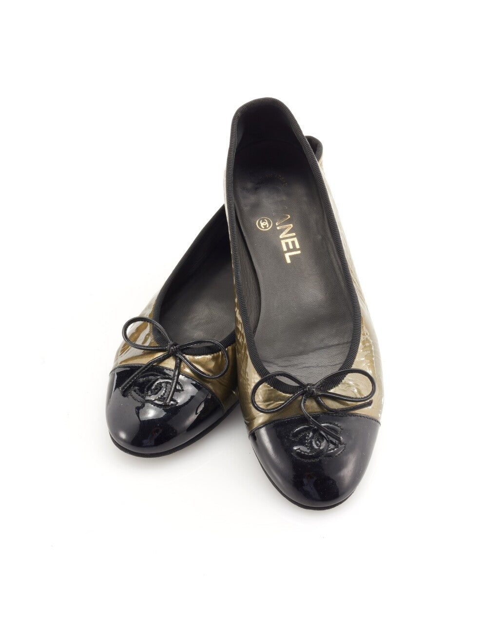 Crafted from quilted patent leather and feature little bows and the CC logo on the toes.