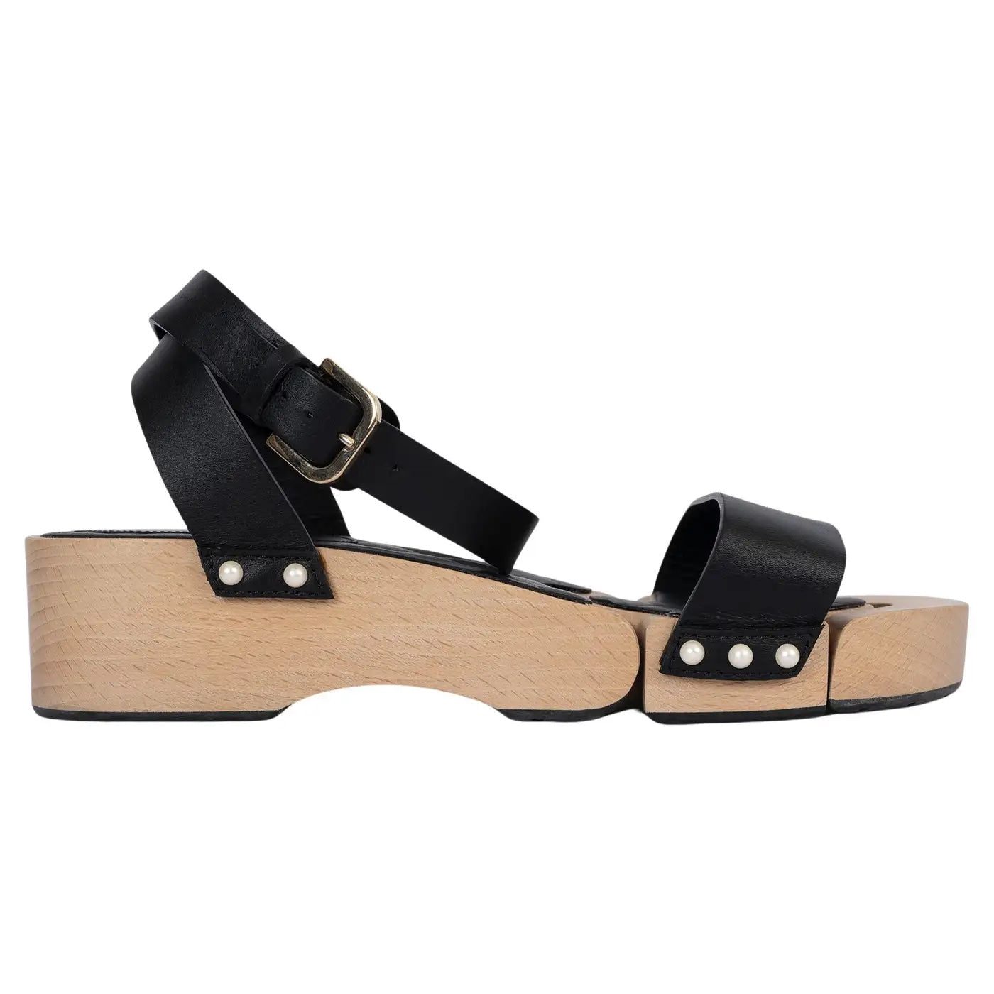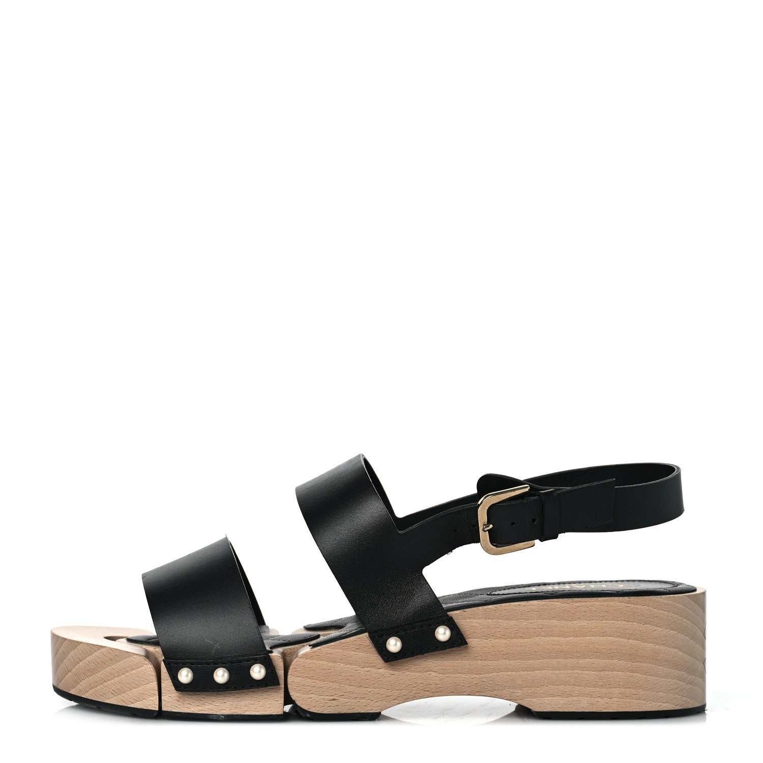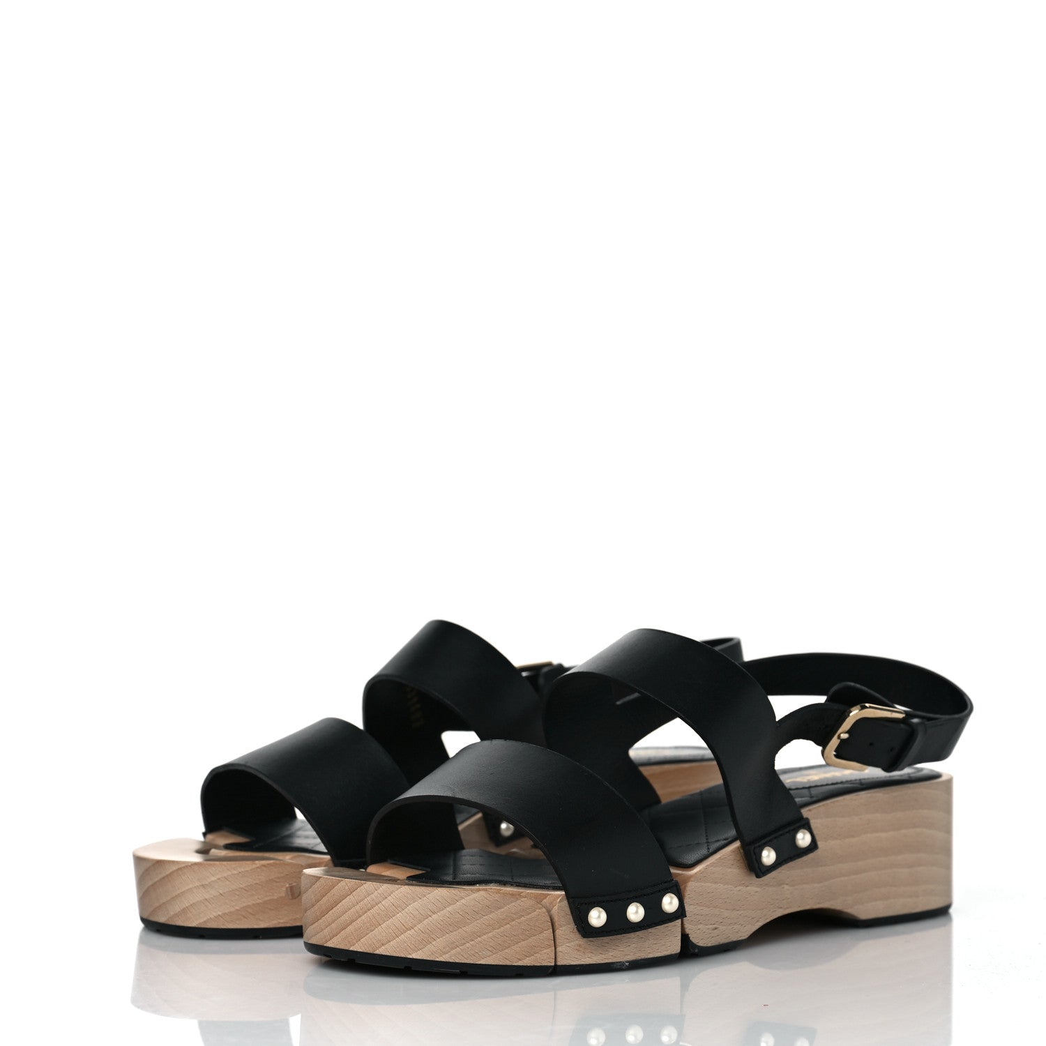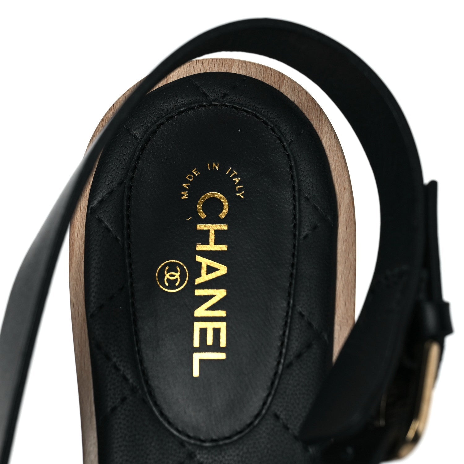 These Super Stylish Wooden Sandals Feature Black Calfskin leather straps in black and feature a 1.5-inch wooden heel with an engraved CC logo.