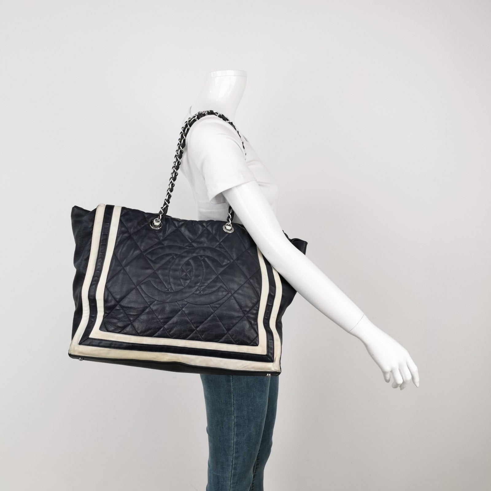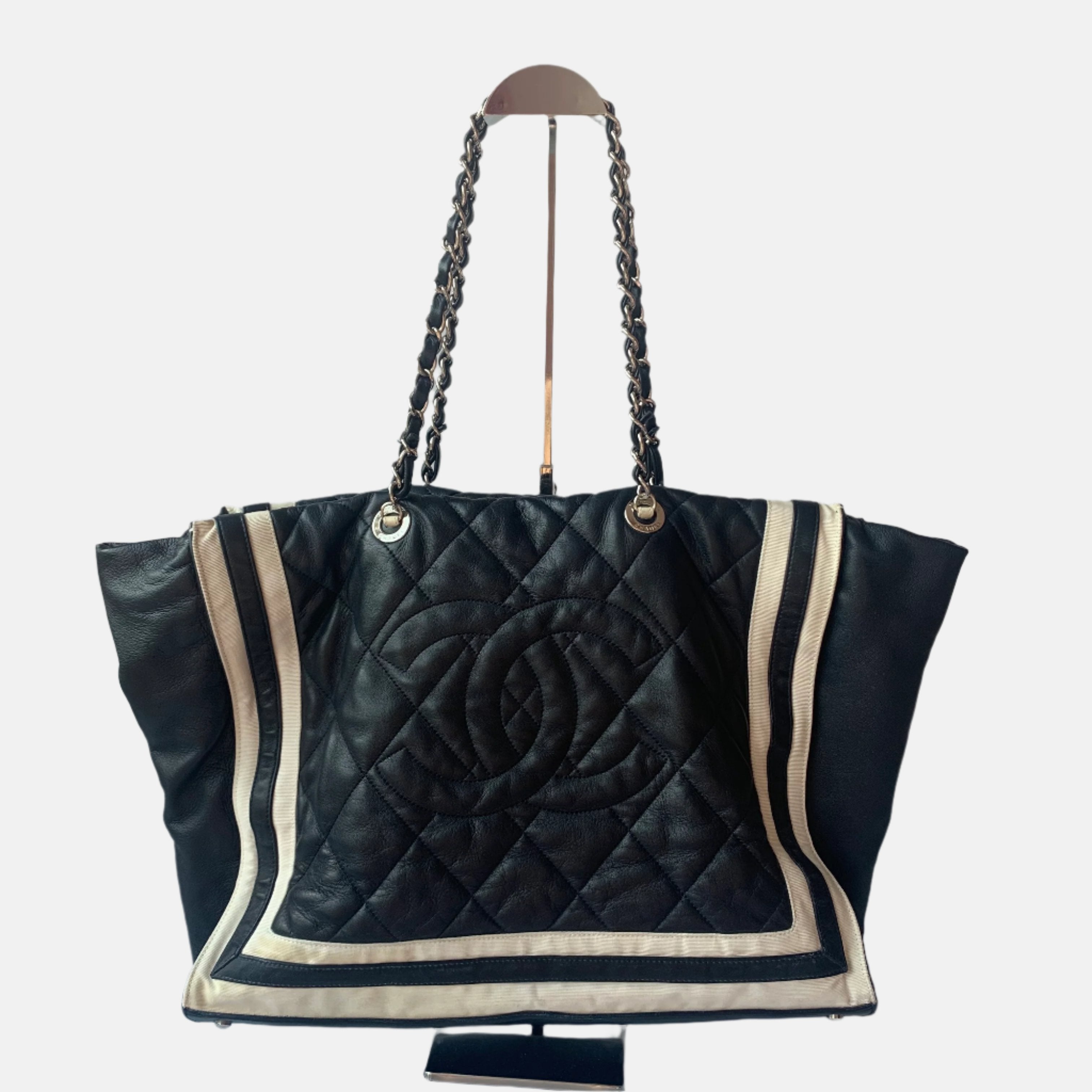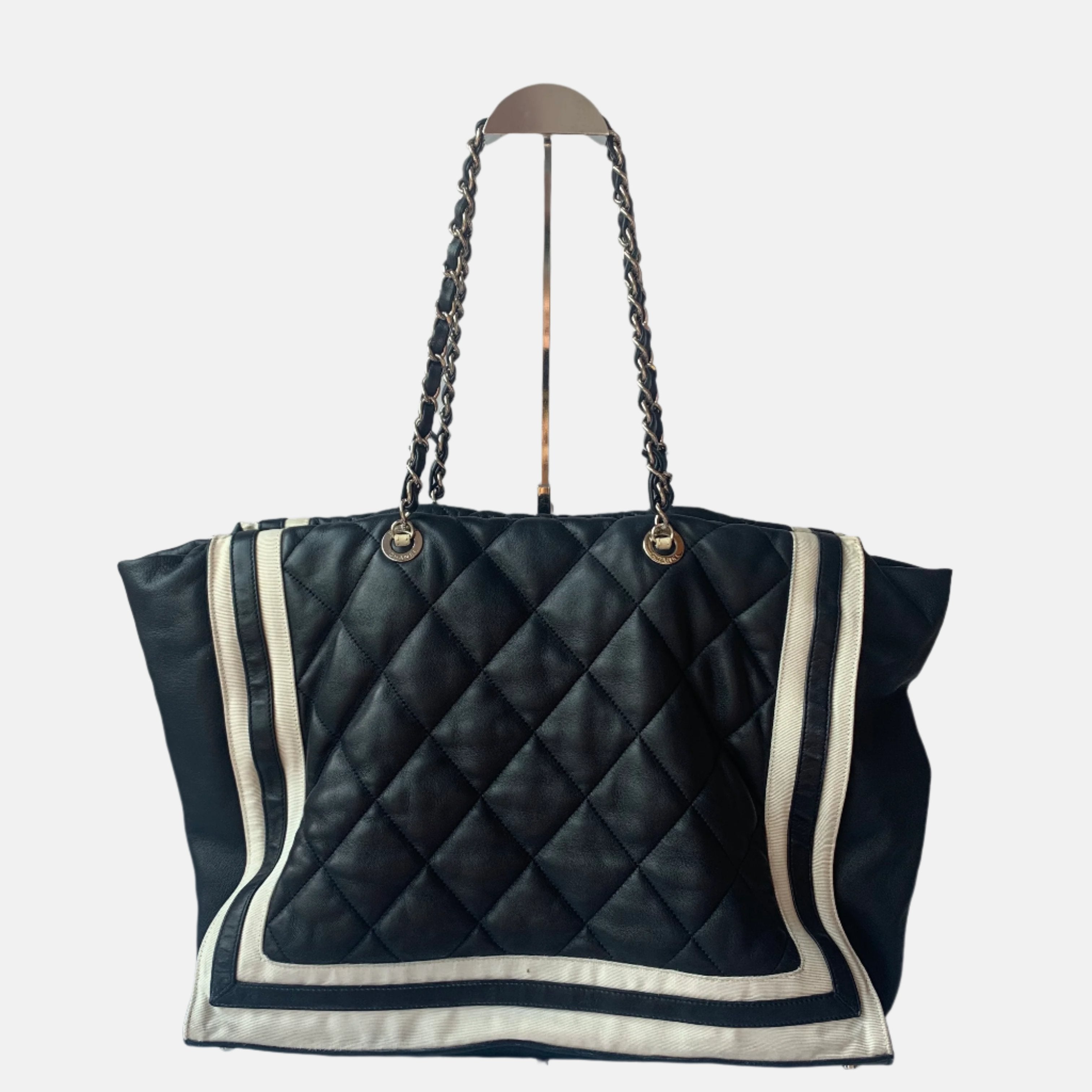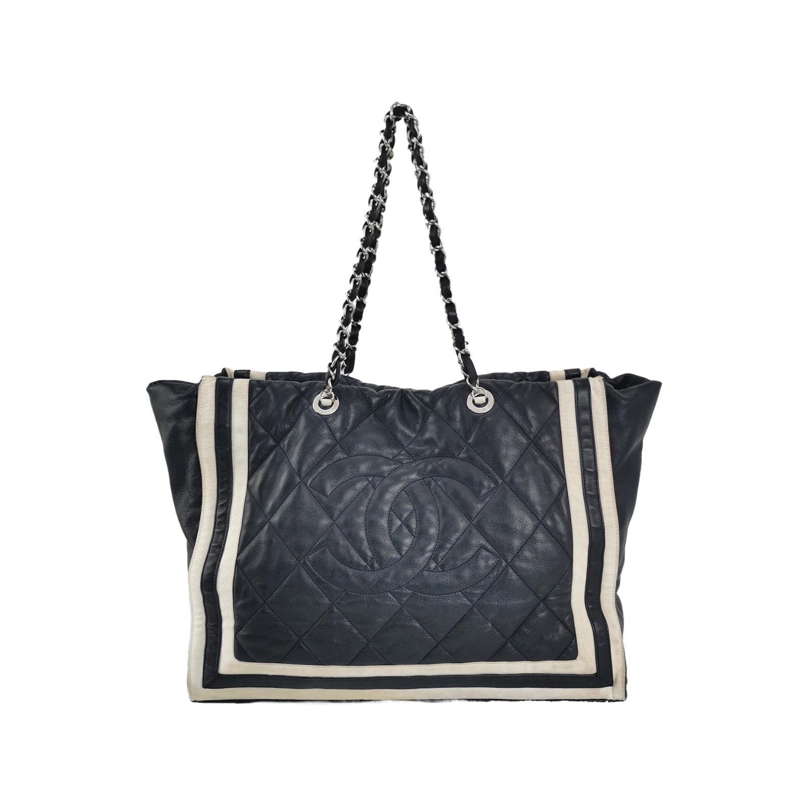 Chanel CC Shopping Tote Medium Cannage Lambskin Leather Navy with White StripesChanel CC Shopping Tote Medium Cannage Lambskin Leather Navy with White Stripes