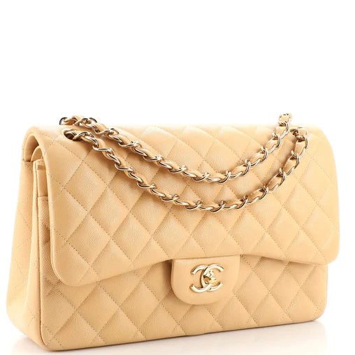 The Jumbo Double Flap Bag is a larger version of the Classic Flap Bag and features two main compartments, as well as a back pocket, providing ample space for all your essentials. The bag is also equipped with a gold-tone chain strap that can be worn over the shoulder or crossbody, and the iconic interlocking CC logo on the front of the bag adds a touch of elegance and sophistication.