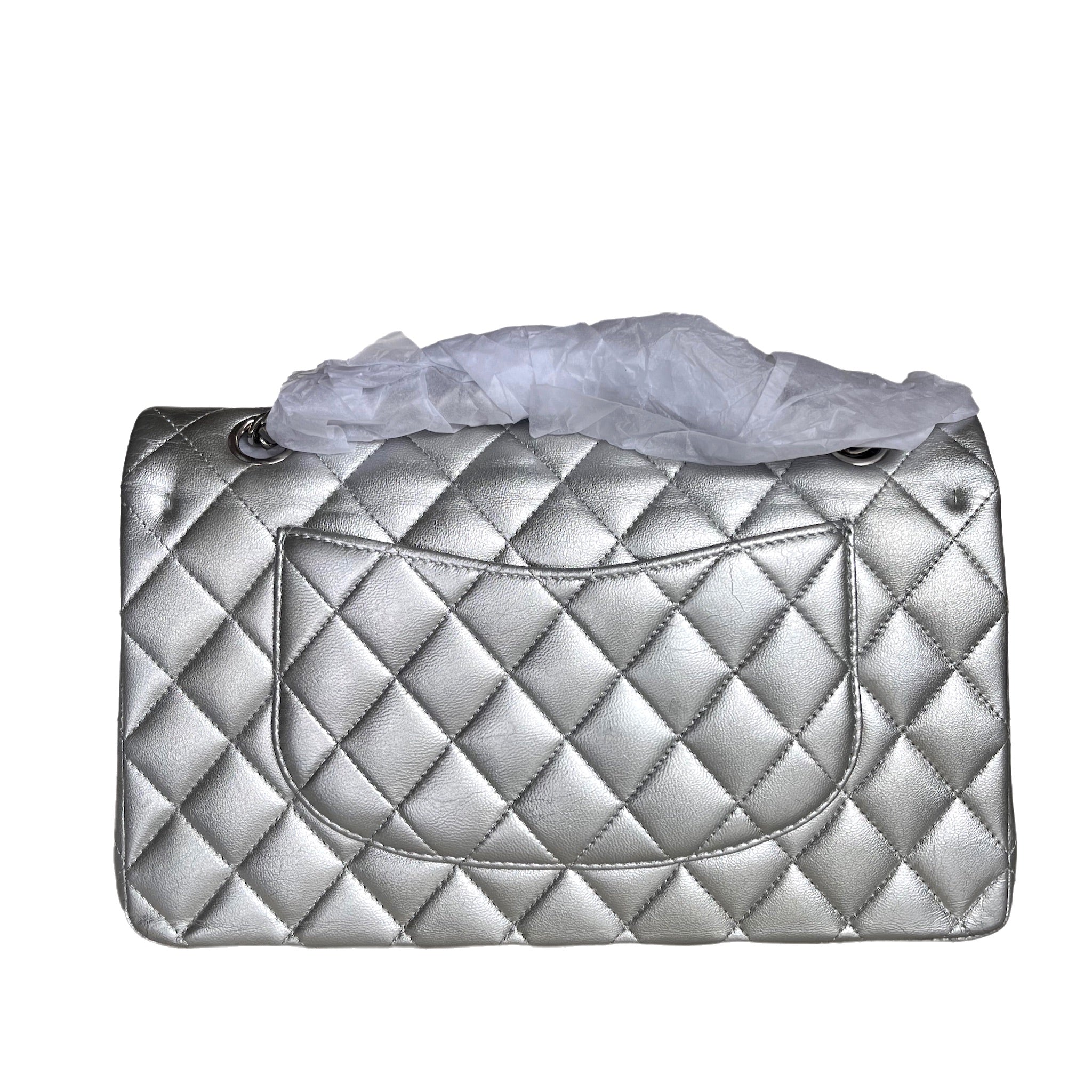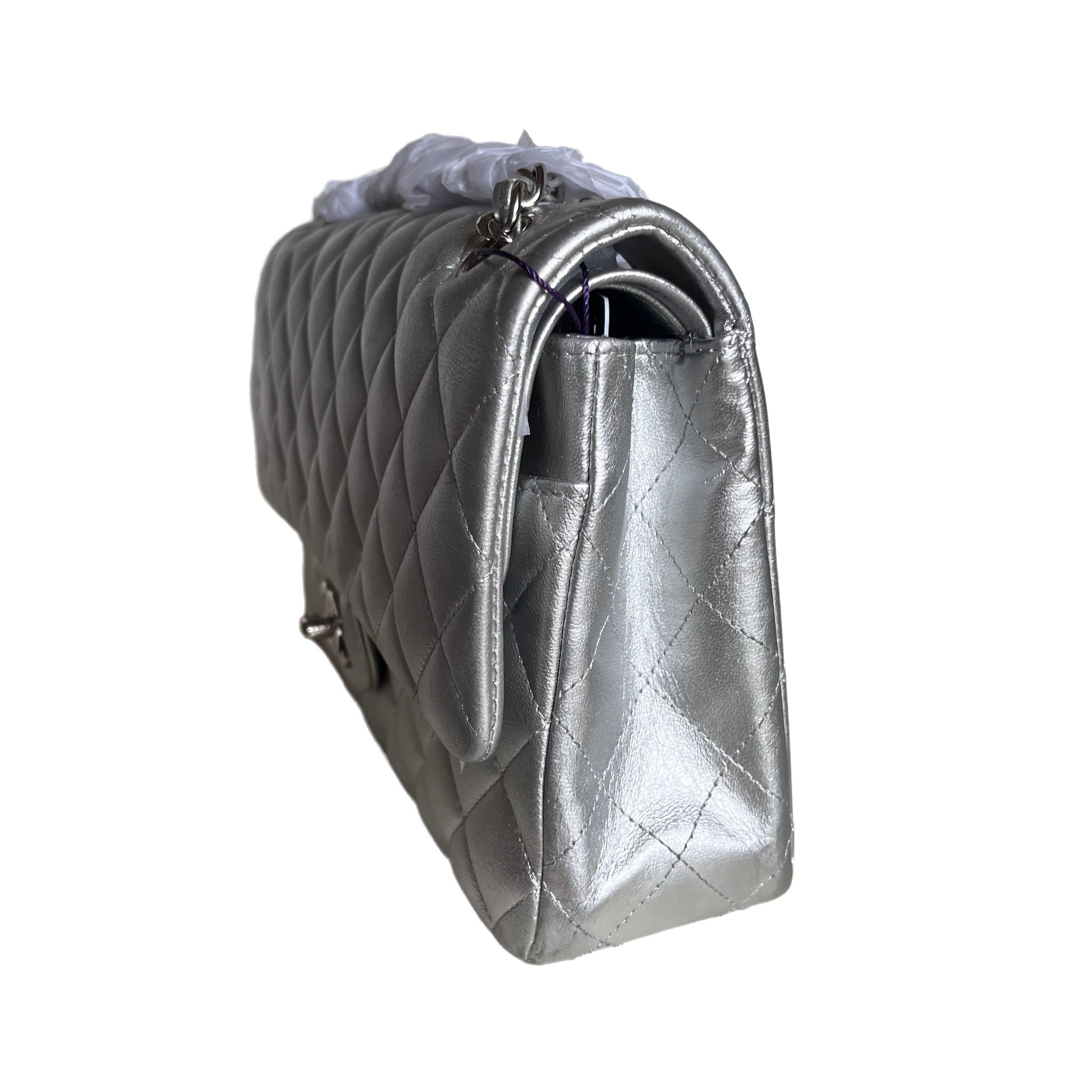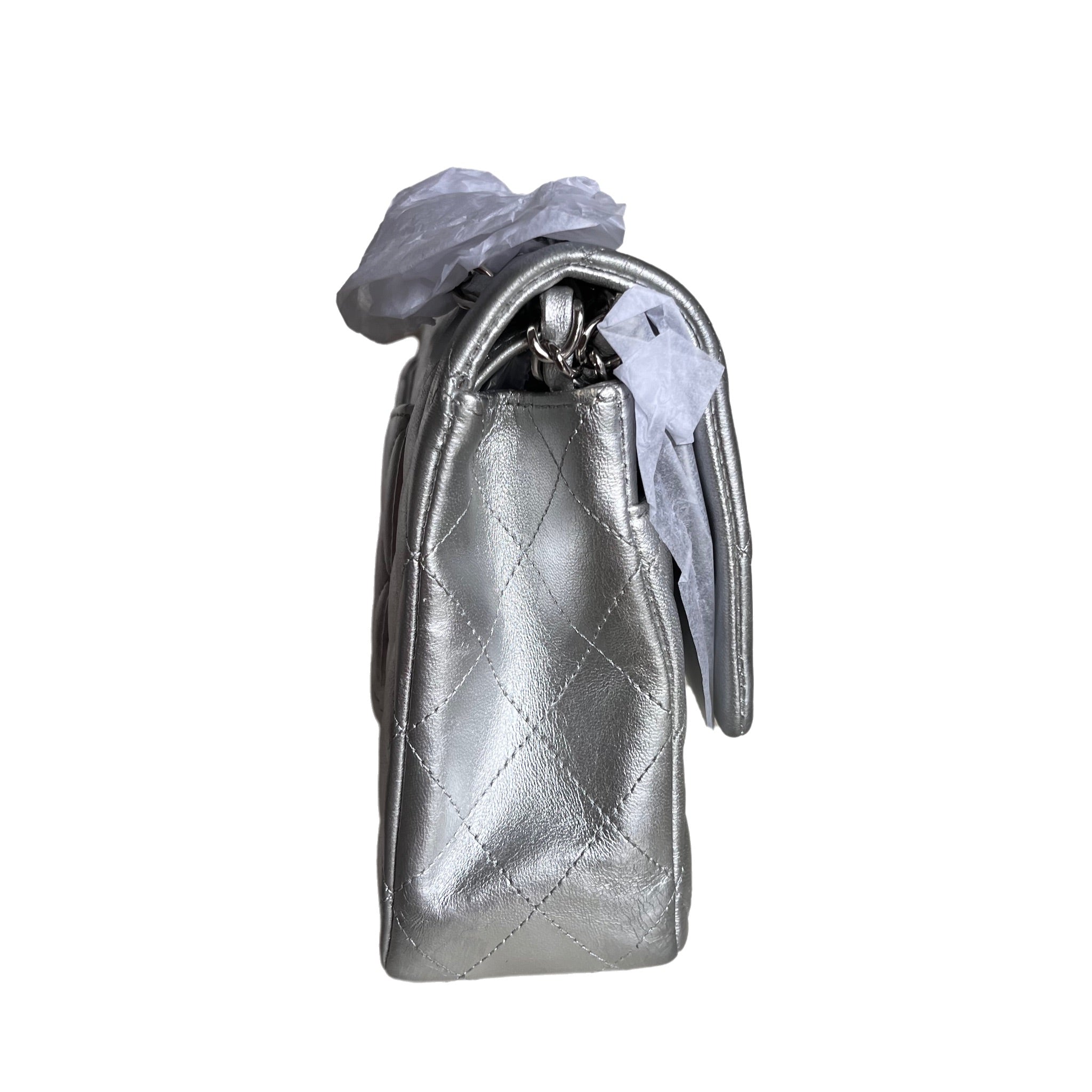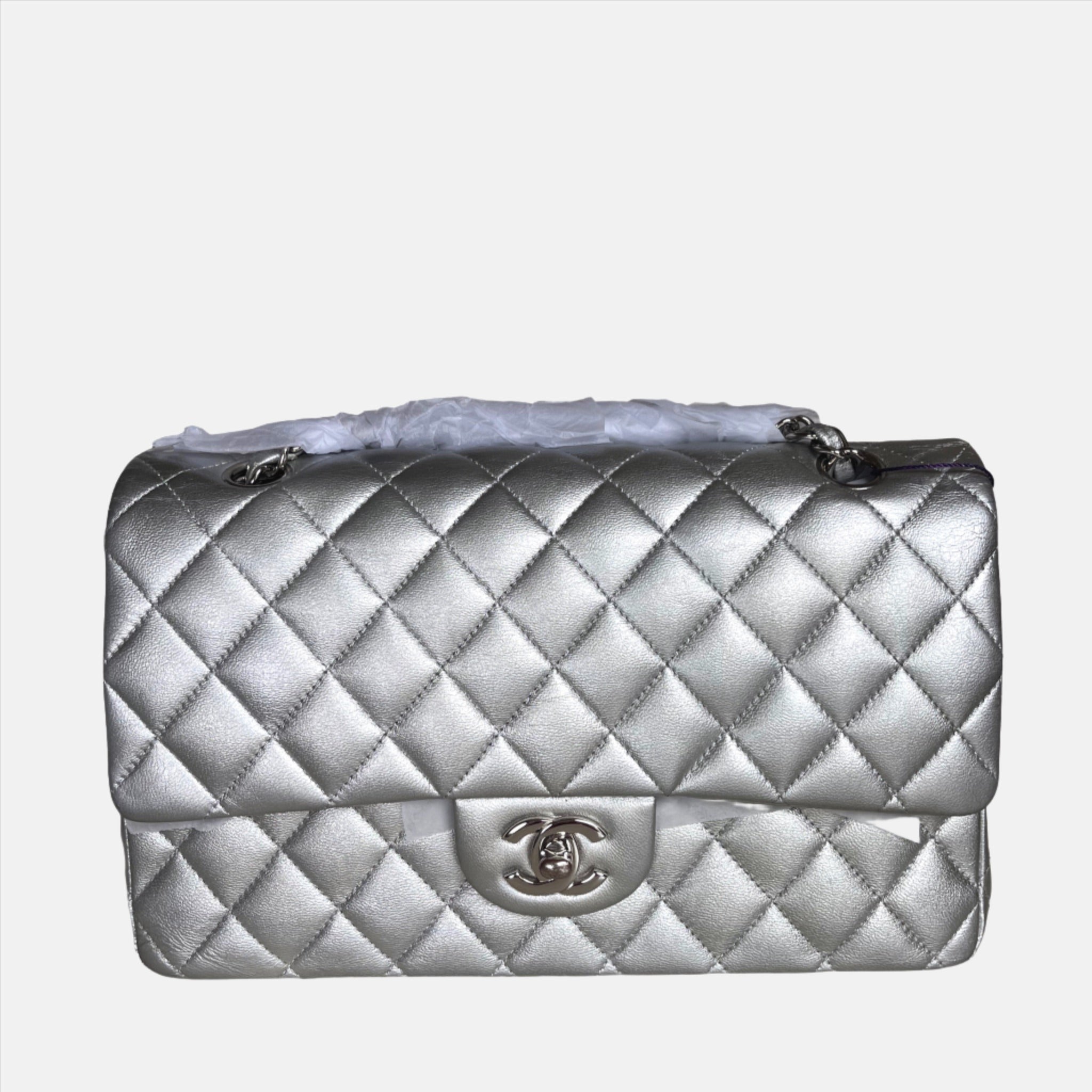 This one-of-a-kind Chanel Classic Flap bag exudes sophistication and timeless elegance. Crafted from luxurious silver lambskin leather, it is adorned with silver hardware for the ultimate futuristic space look.Â