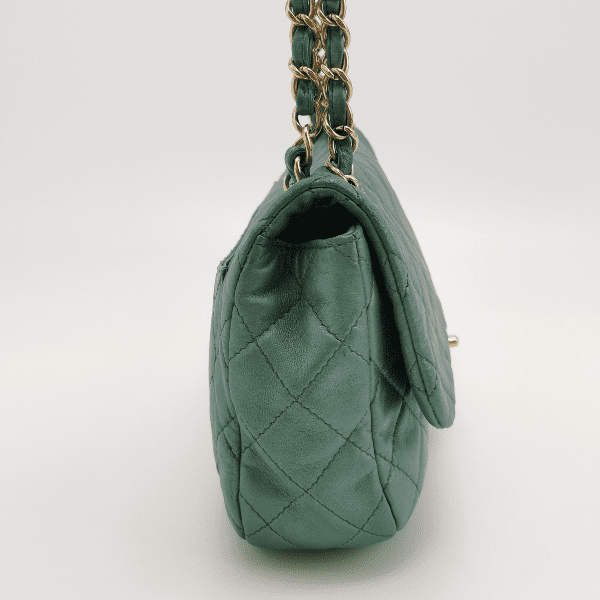 Chanel Timeless / Classic Flap in gorgeous teal green lambskin leather with gold-tone hardware. This rare find is adorned with gem embellished CC turn lock. The chain strap is a double chain style but joined together to be worn as a single chain.Â