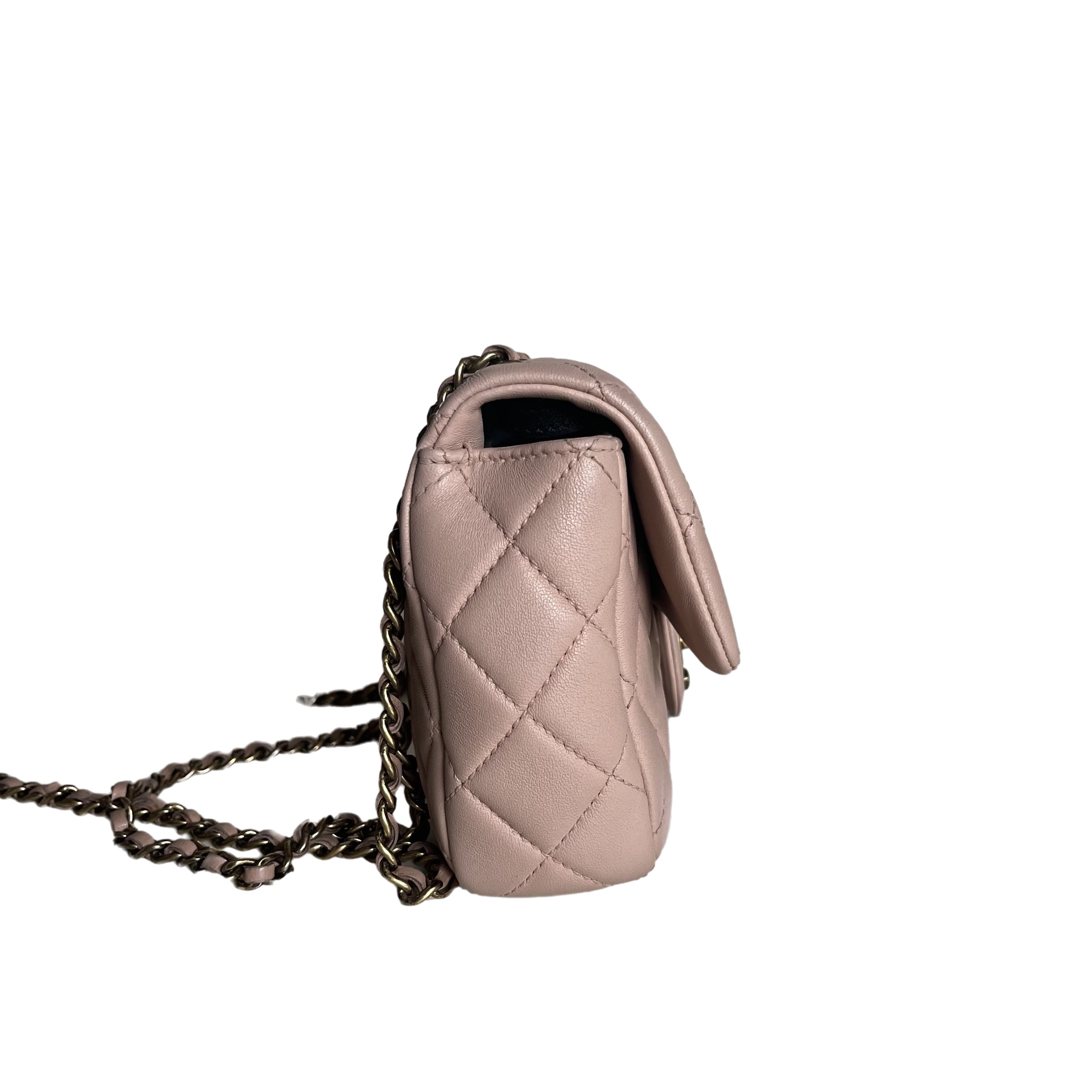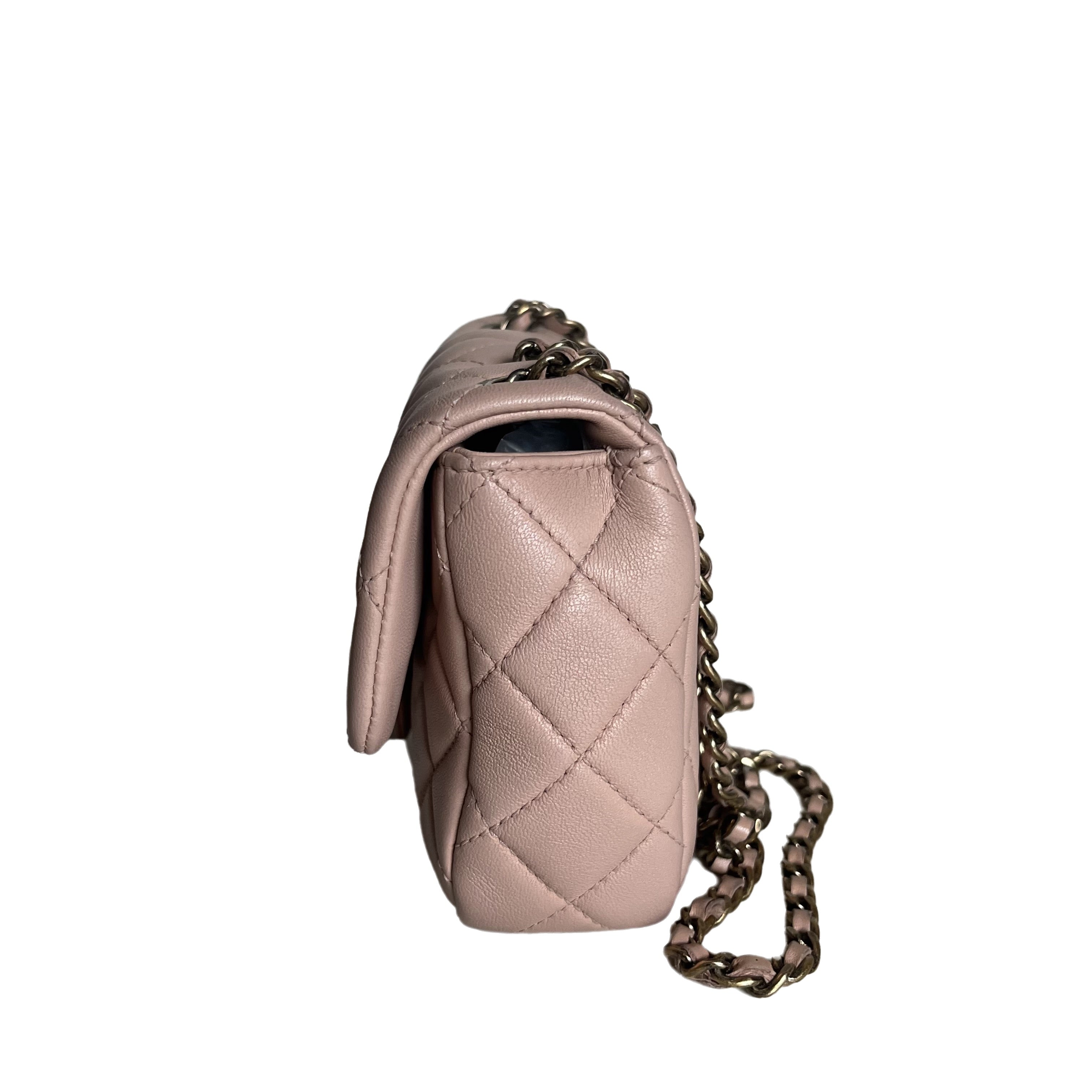 Crafted from luxurious lambskin leather in neutral beige color, accented with gold-tone hardware, the Chanel Classic Flap Mini Crossbody Bag is the perfect everyday bag that takes you from day to night. It can be worn on the shoulder or across the body thanks to the double chain strap.Â