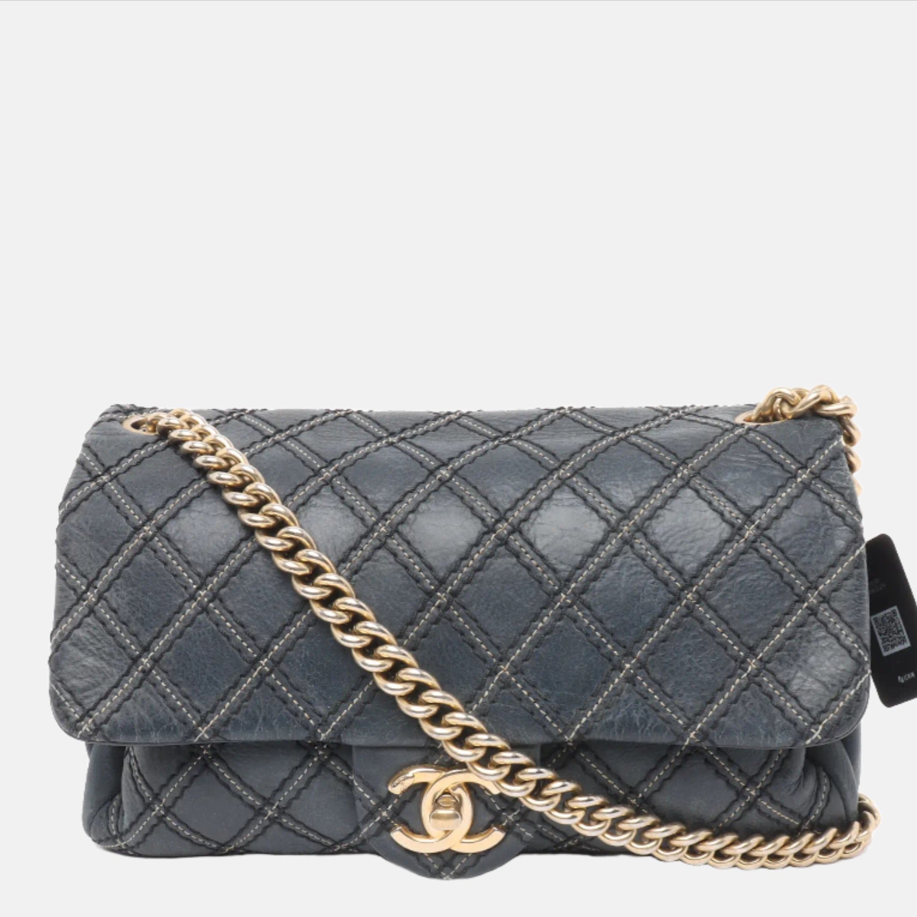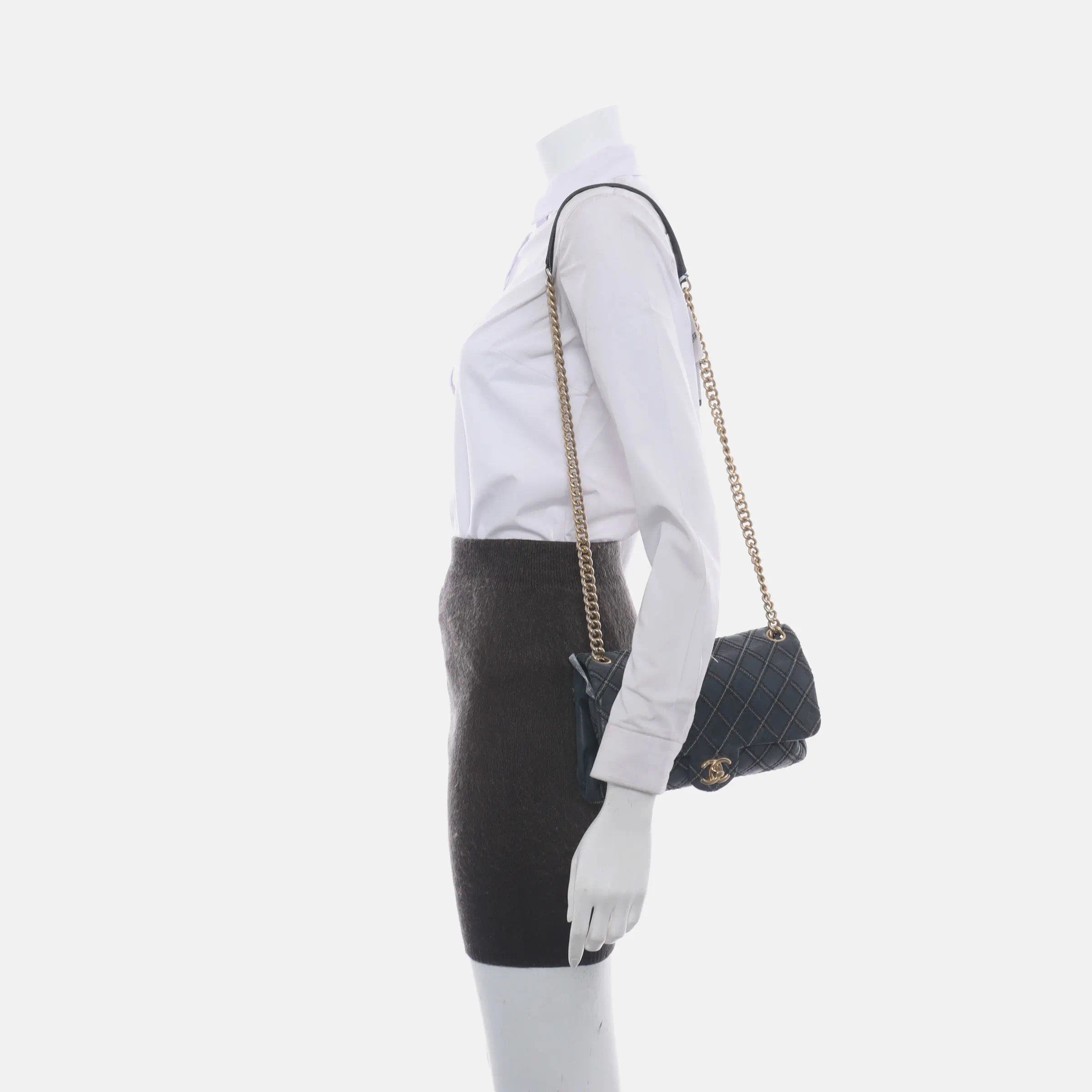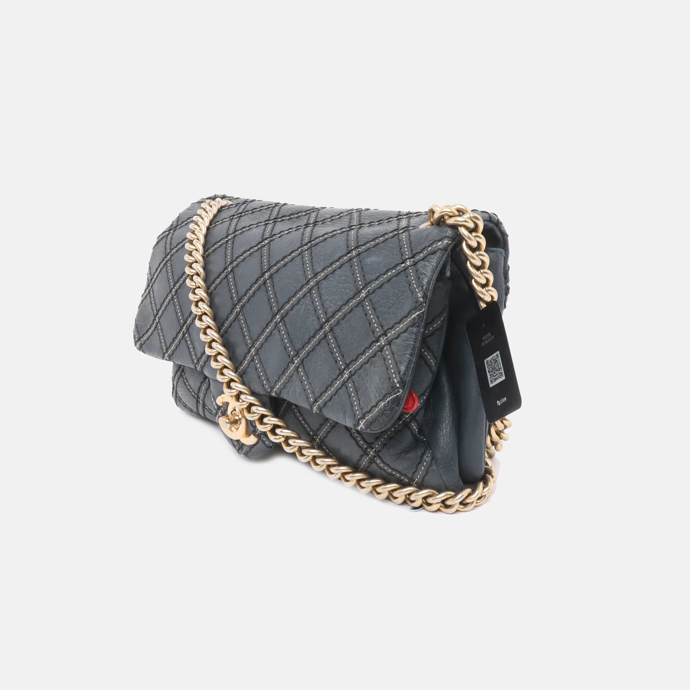 This seasonal Chanel Classic Flap bag is crafted from textile finished with a leather-like coating. This bag features diamond quilting, CC turn-lock, and antiqued shoulder chain.Â