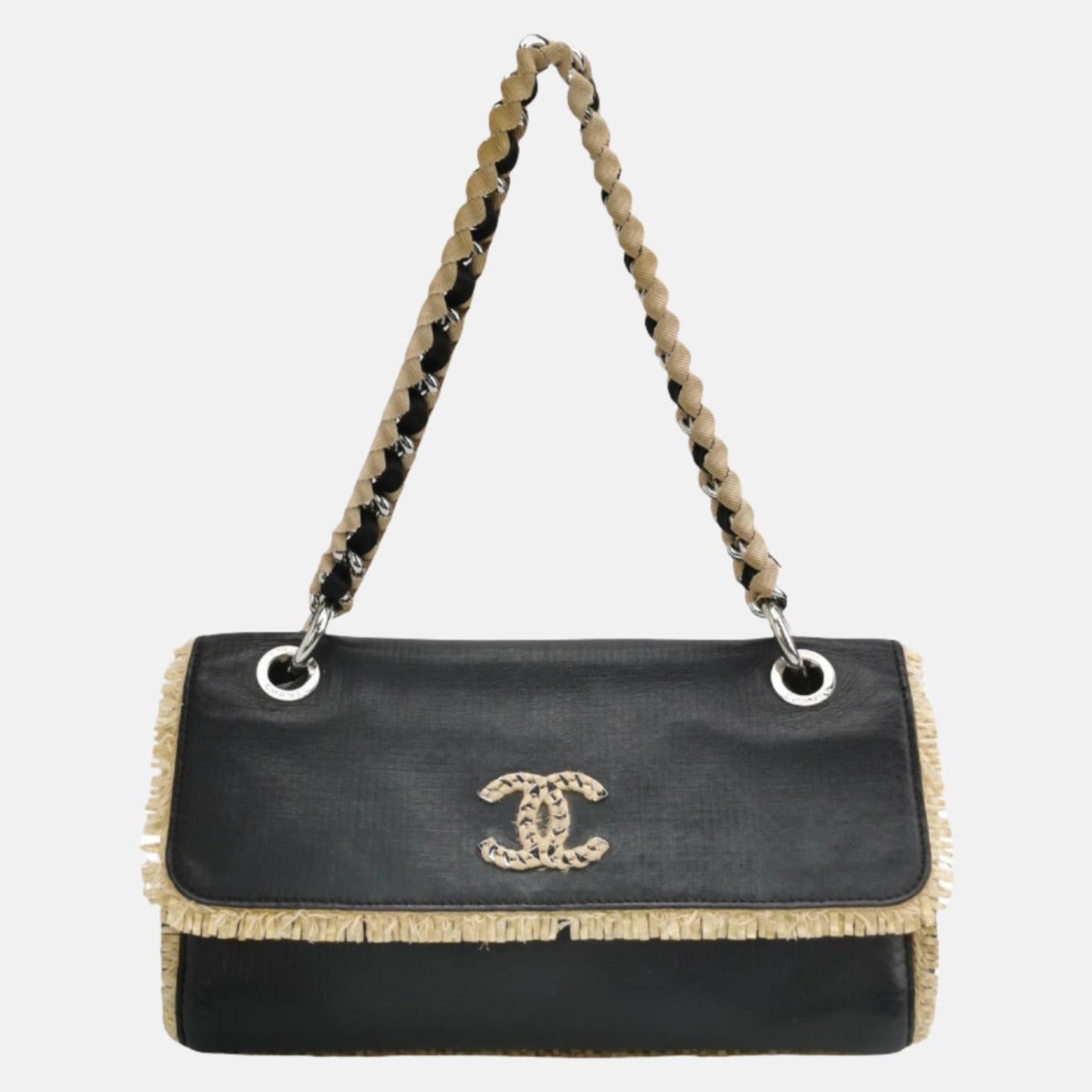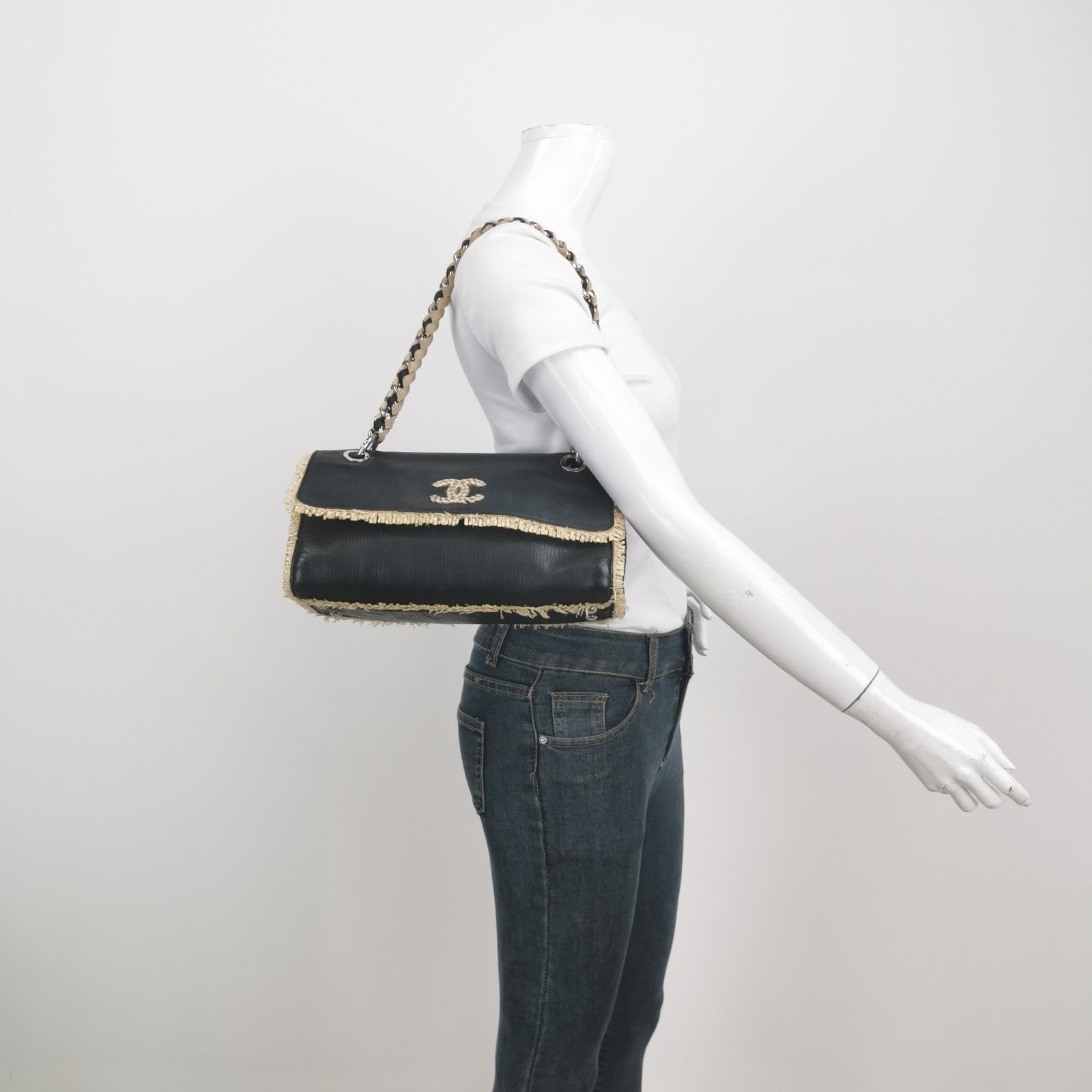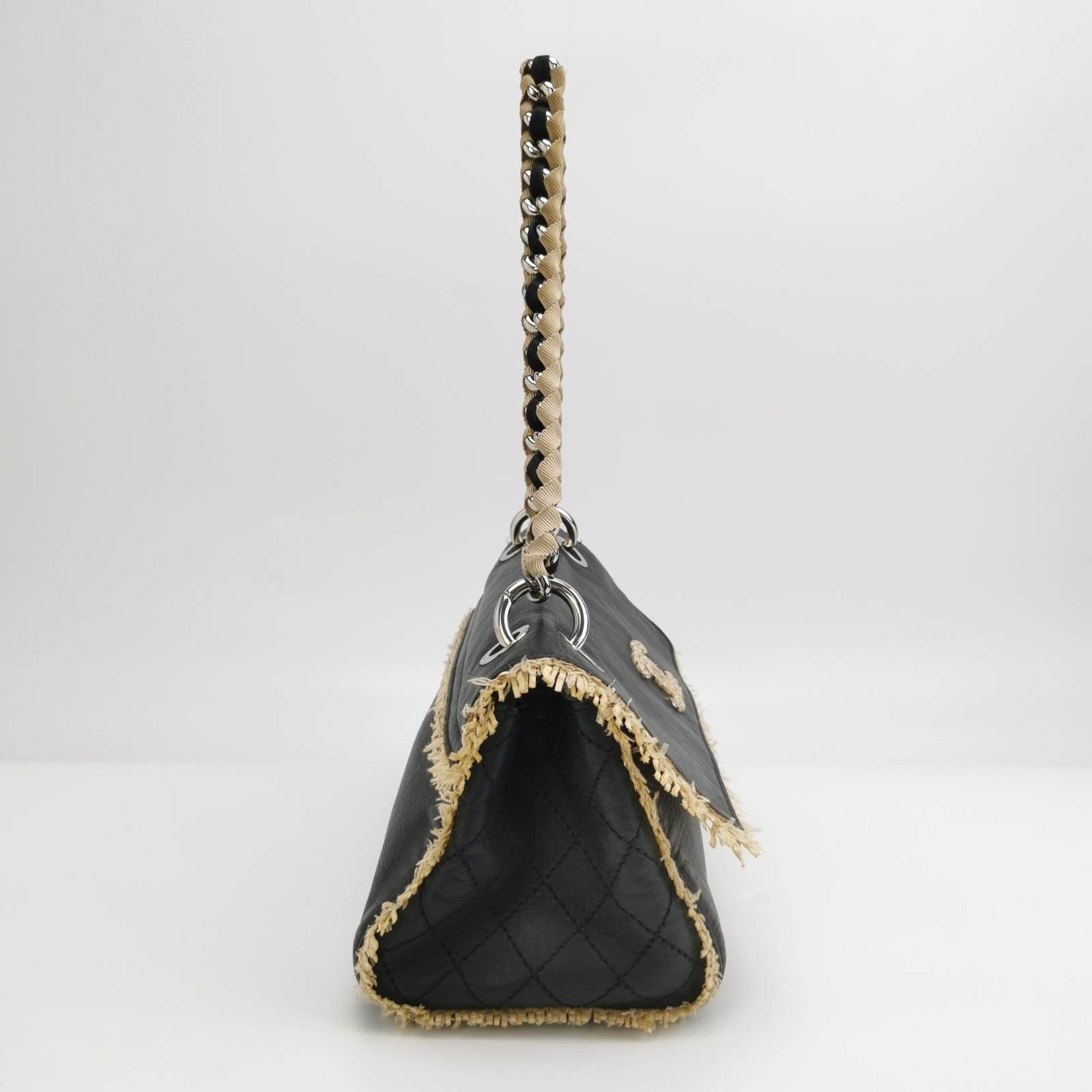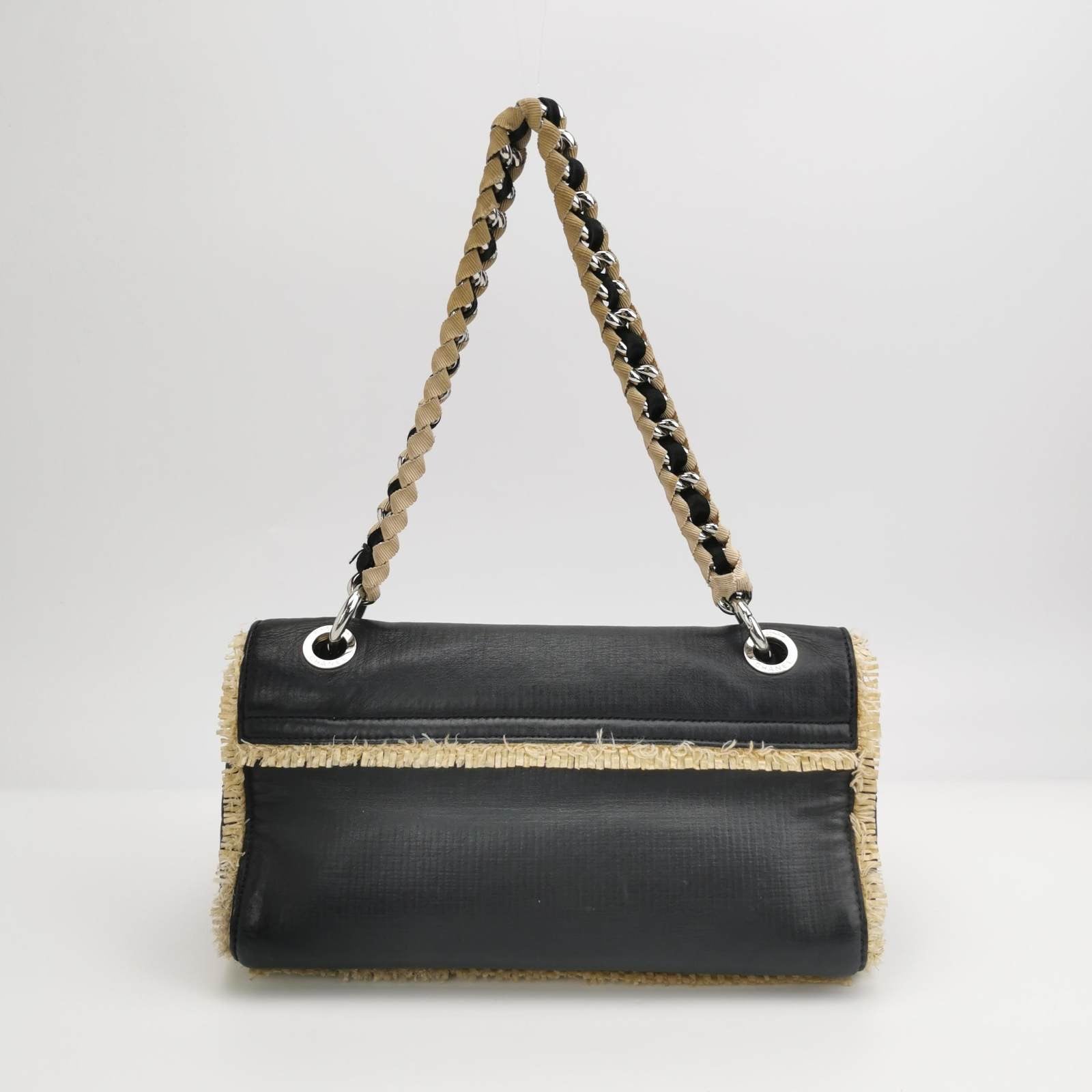 Enhance your style this season with the limited edition Chanel Classic Flap shoulder bag. Expertly crafted from high-quality calfskin leather and adorned with charming straw ruffles and lining, this bag also boasts a chic metellase shoulder chain strap. Versatile enough for any occasion, it’s the perfect accessory for a refreshing summer outing.
