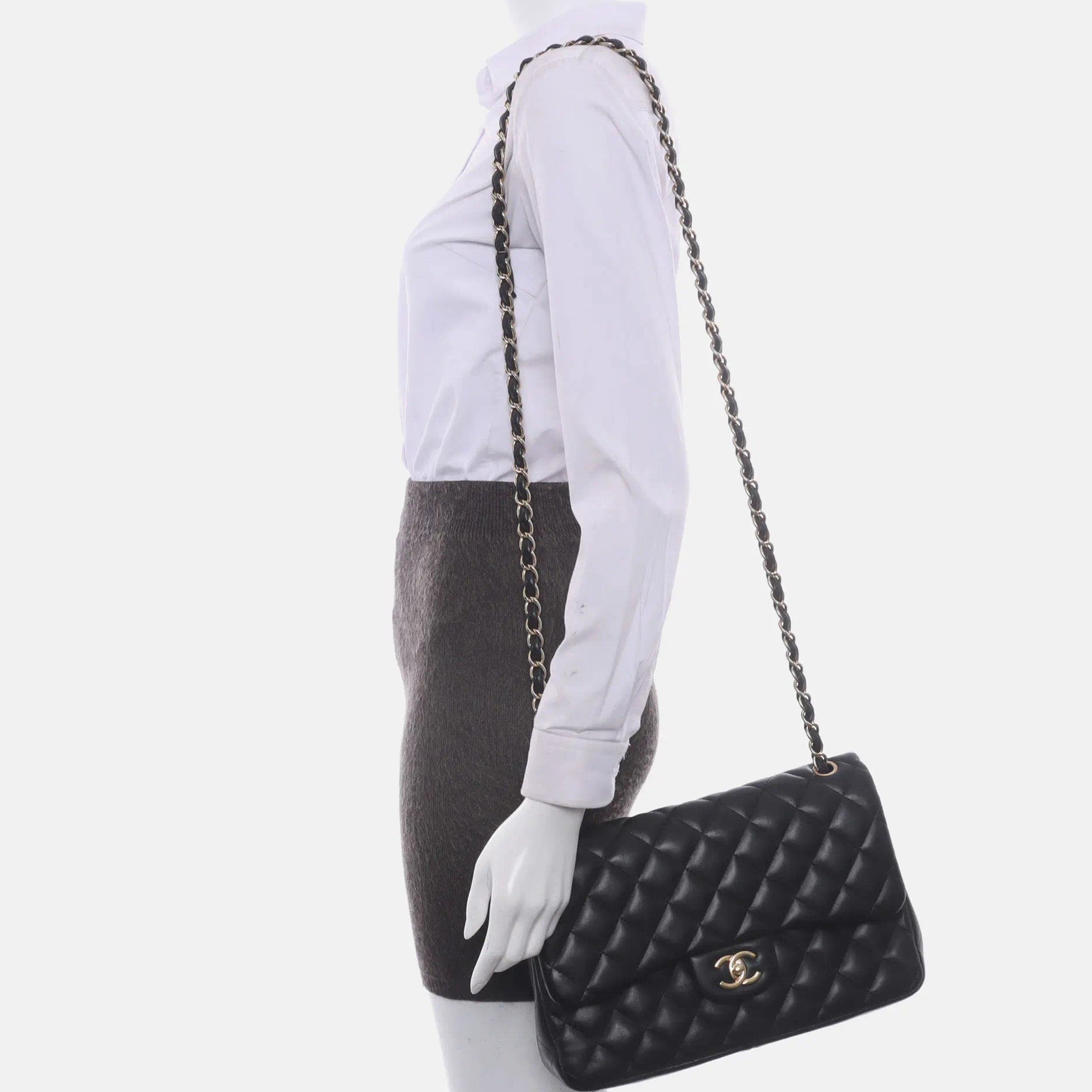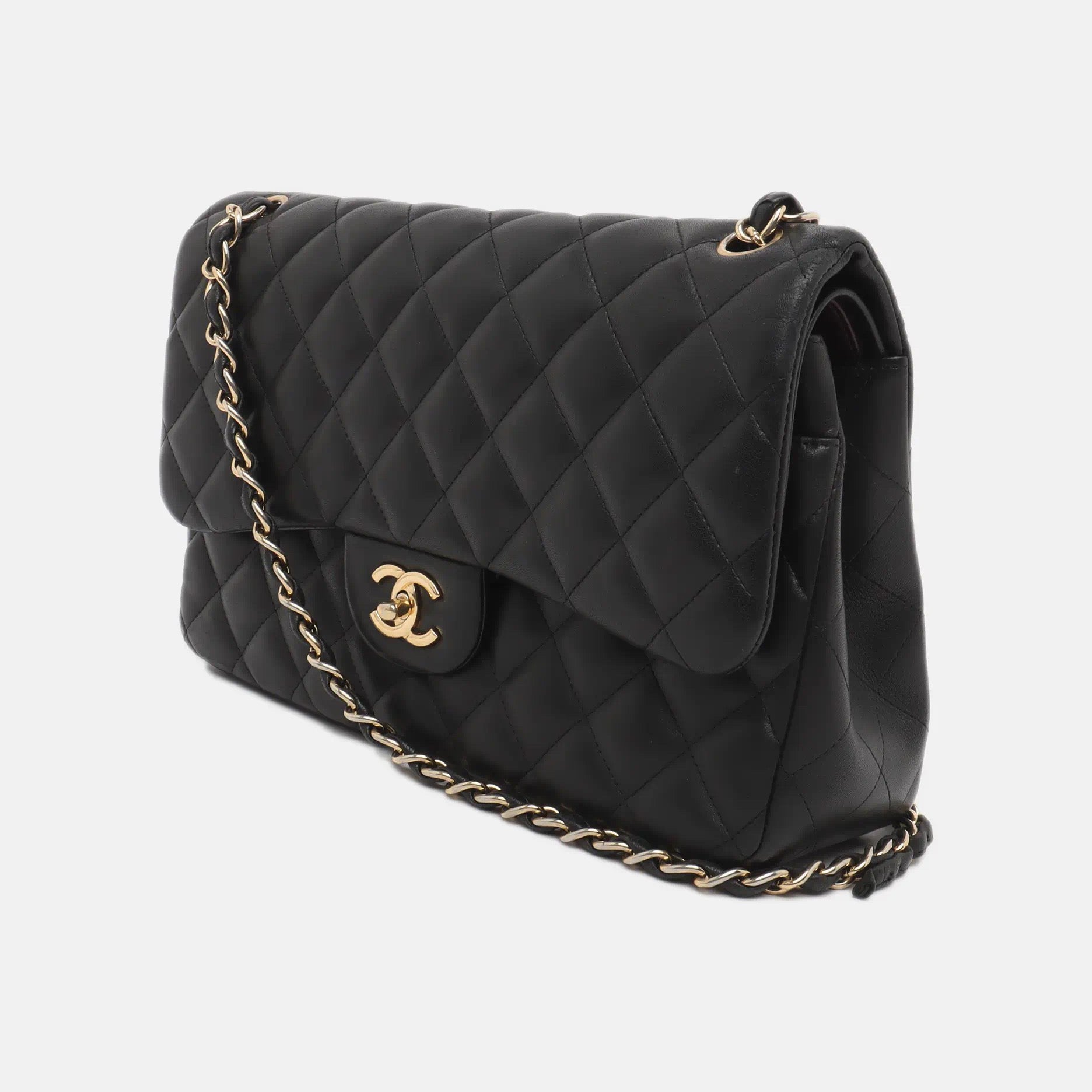Embrace luxury with this timeless Chanel Classic Jumbo/Large Flap bag crafted in a luxurious black leather and finished with gleaming gold hardware.Â