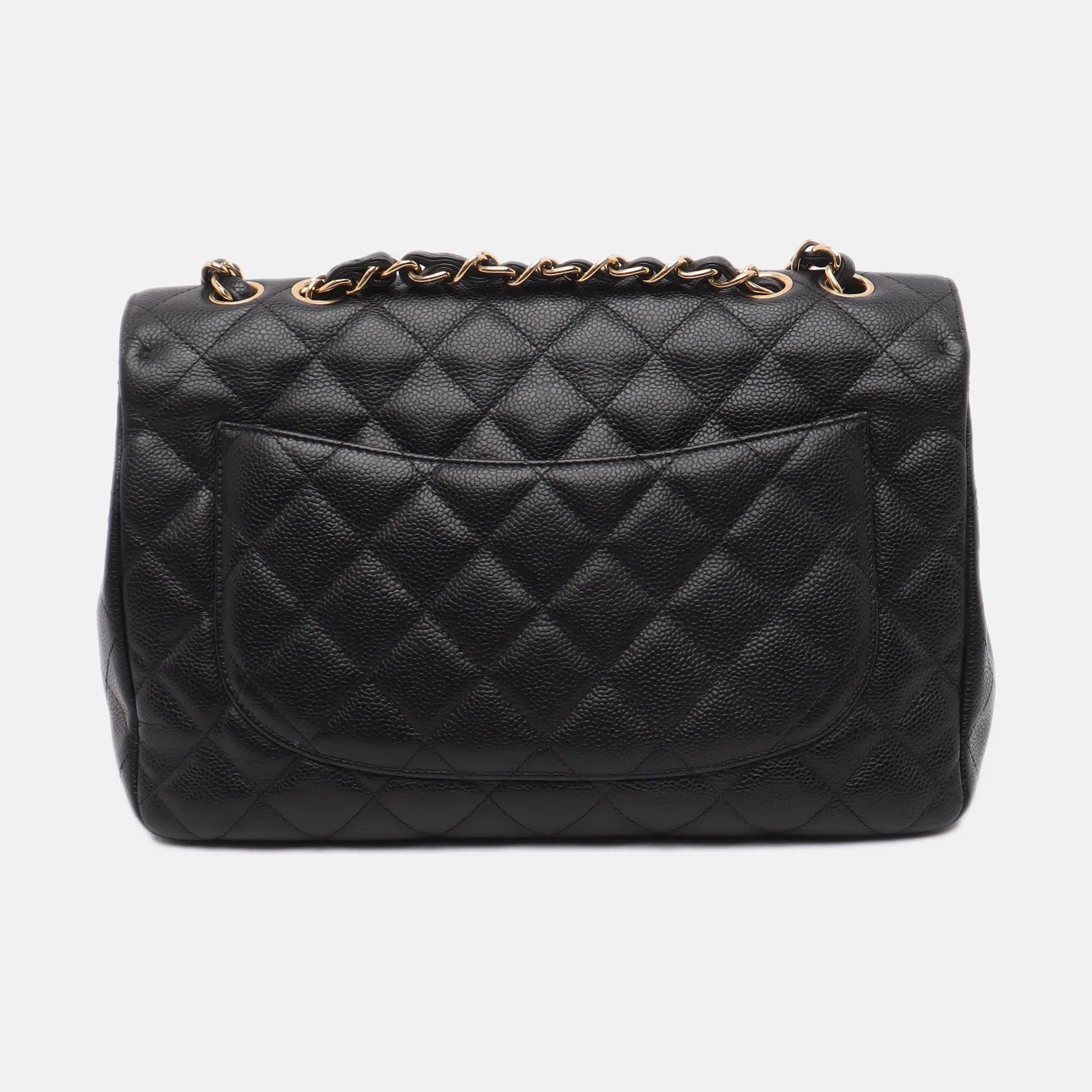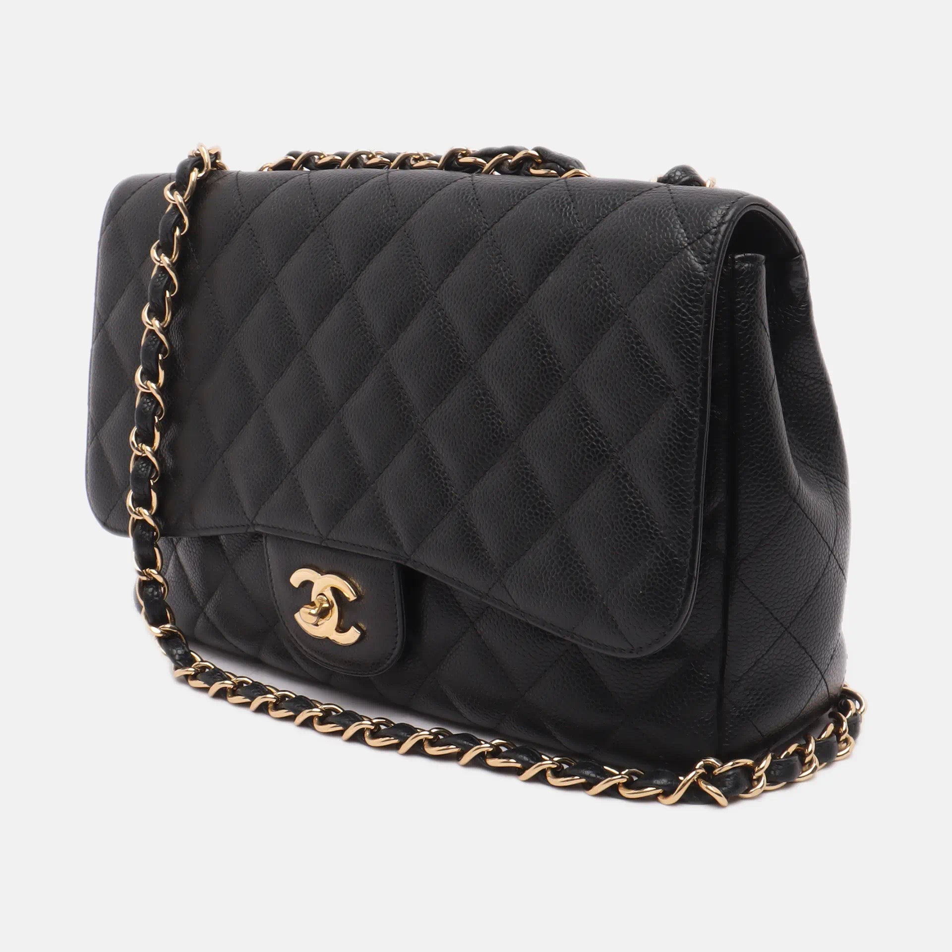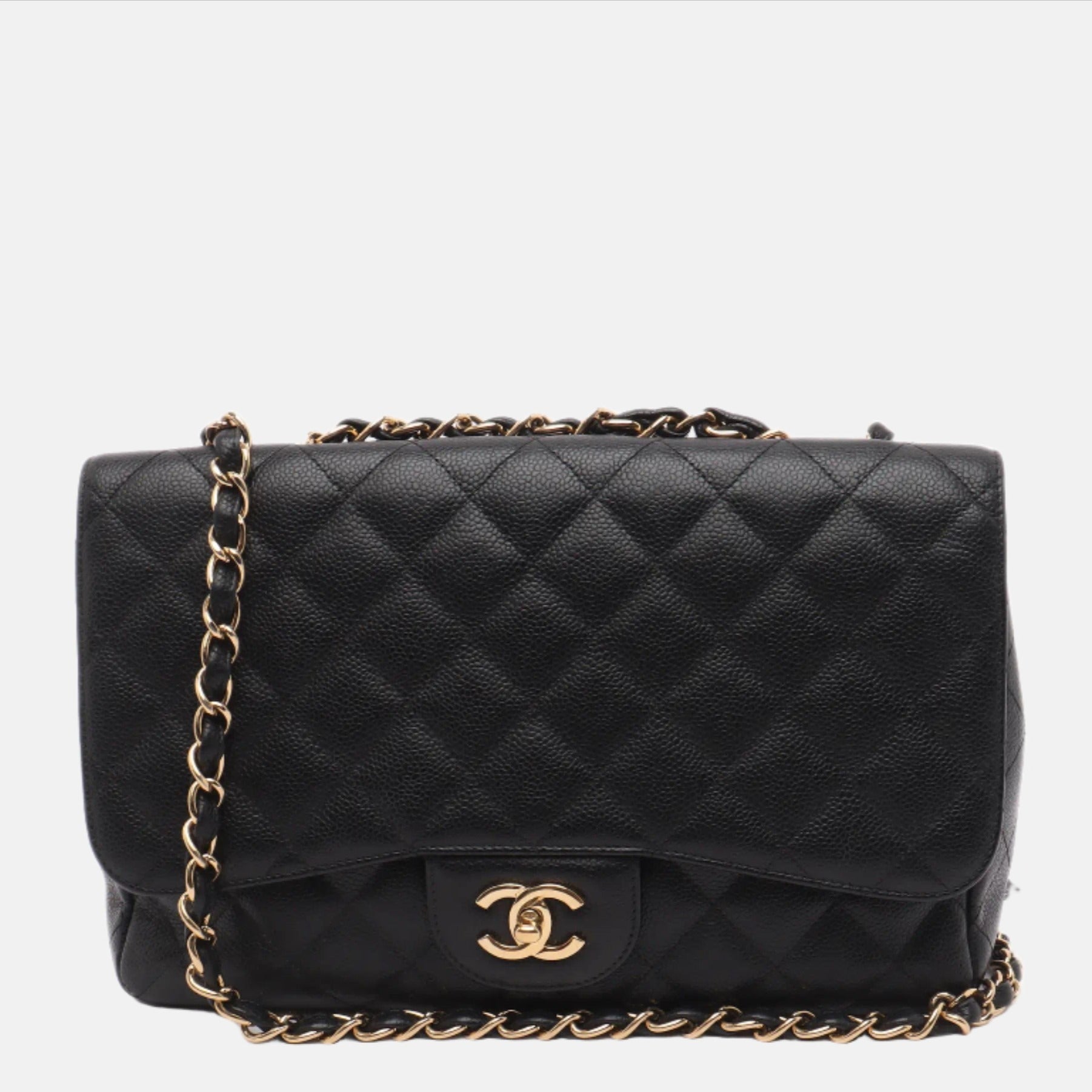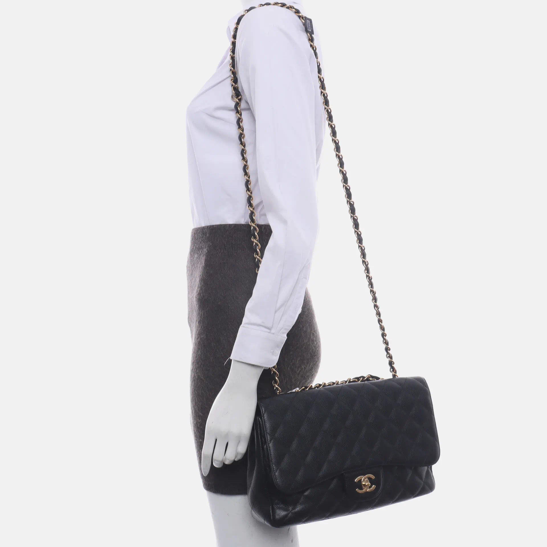Embrace luxury with this timeless Chanel Classic Jumbo/Large Flap bag crafted in a scratch-resistant Caviar black leather and finished with gleaming gold hardware.Â