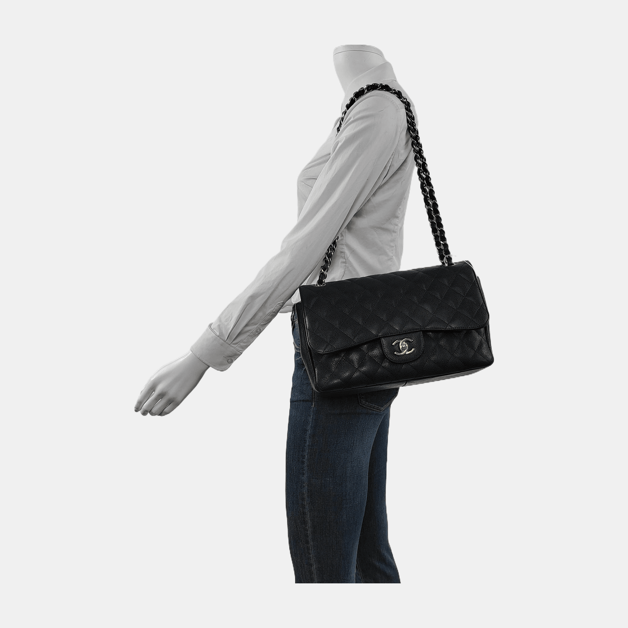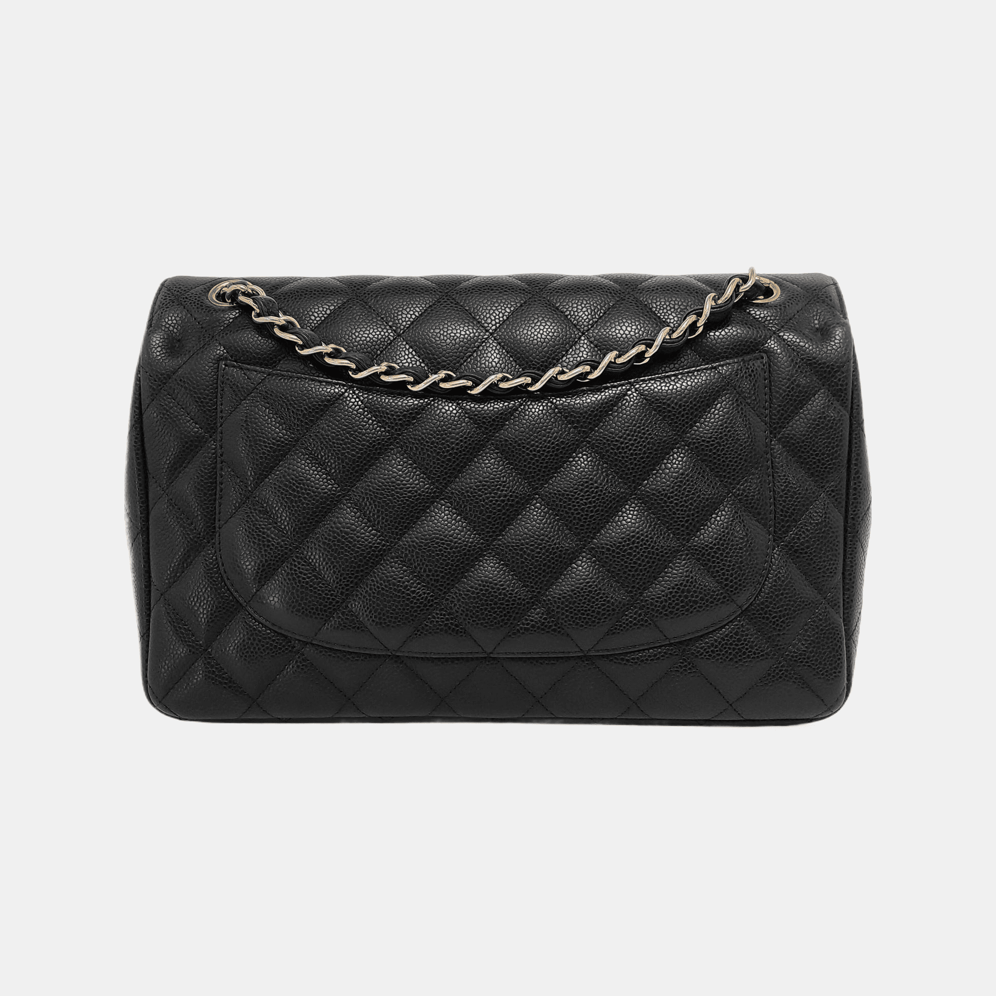 Embrace luxury with this timeless Chanel Classic Jumbo/Large Flap bag crafted in a scratch-resistant Caviar black leather and finished with gleaming silver hardware.