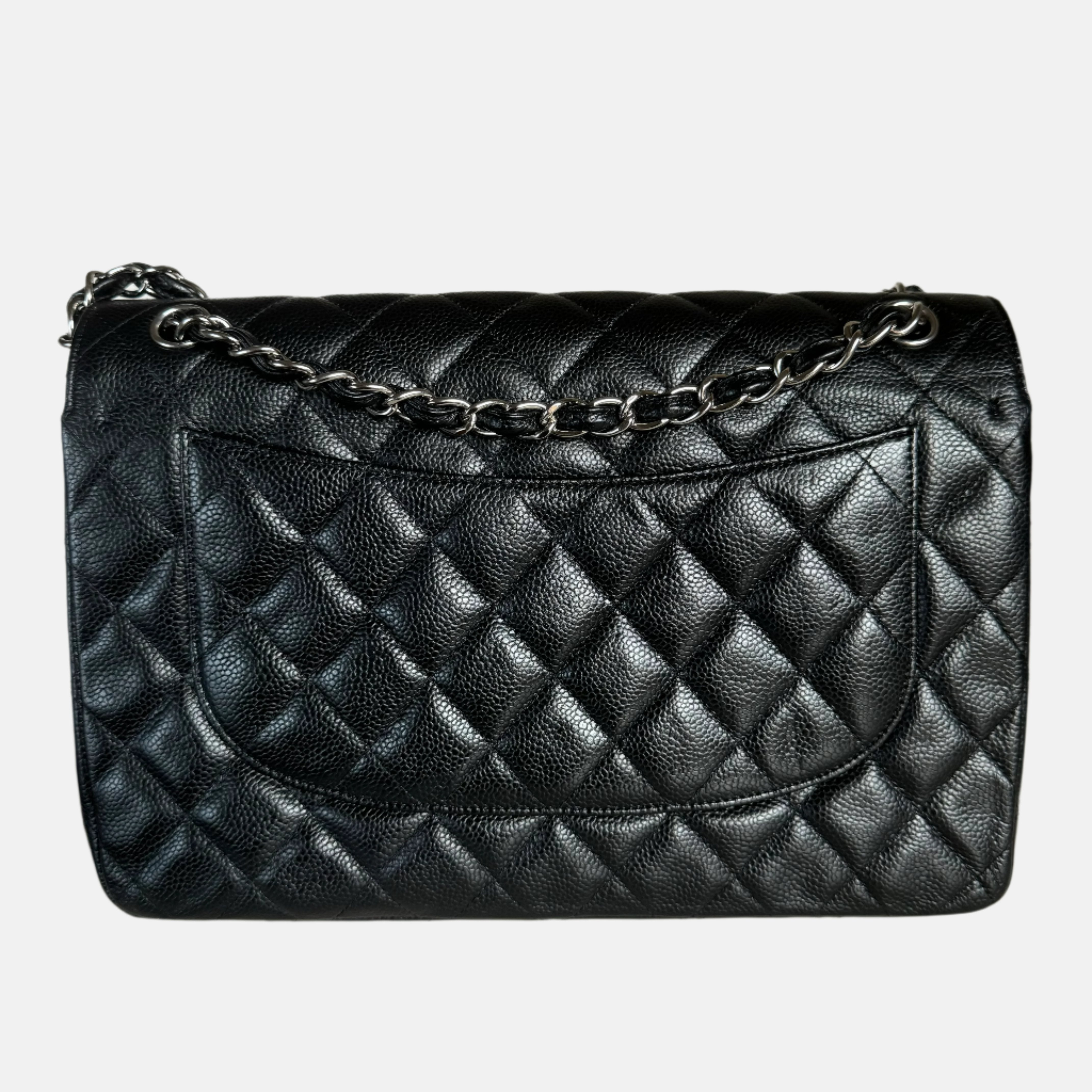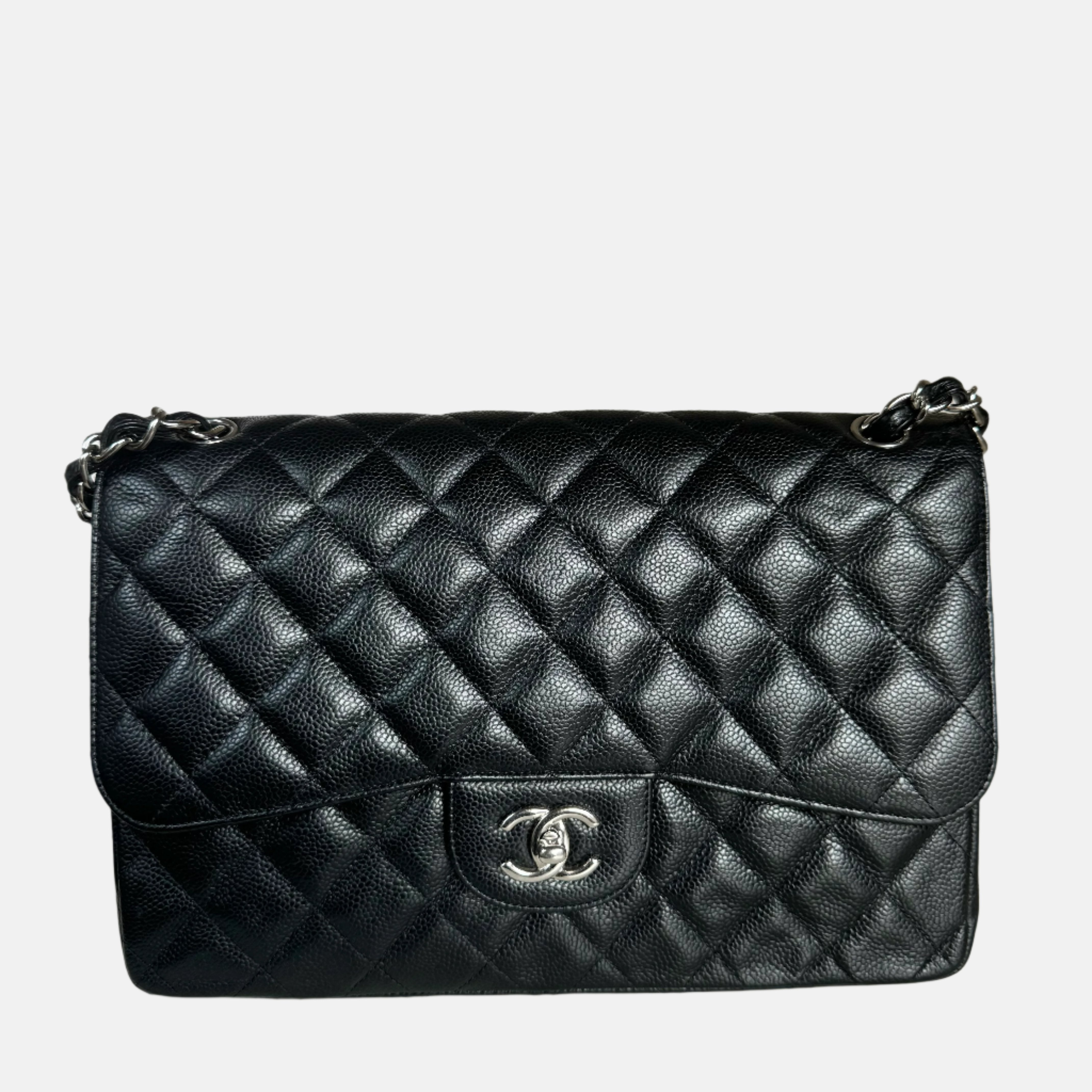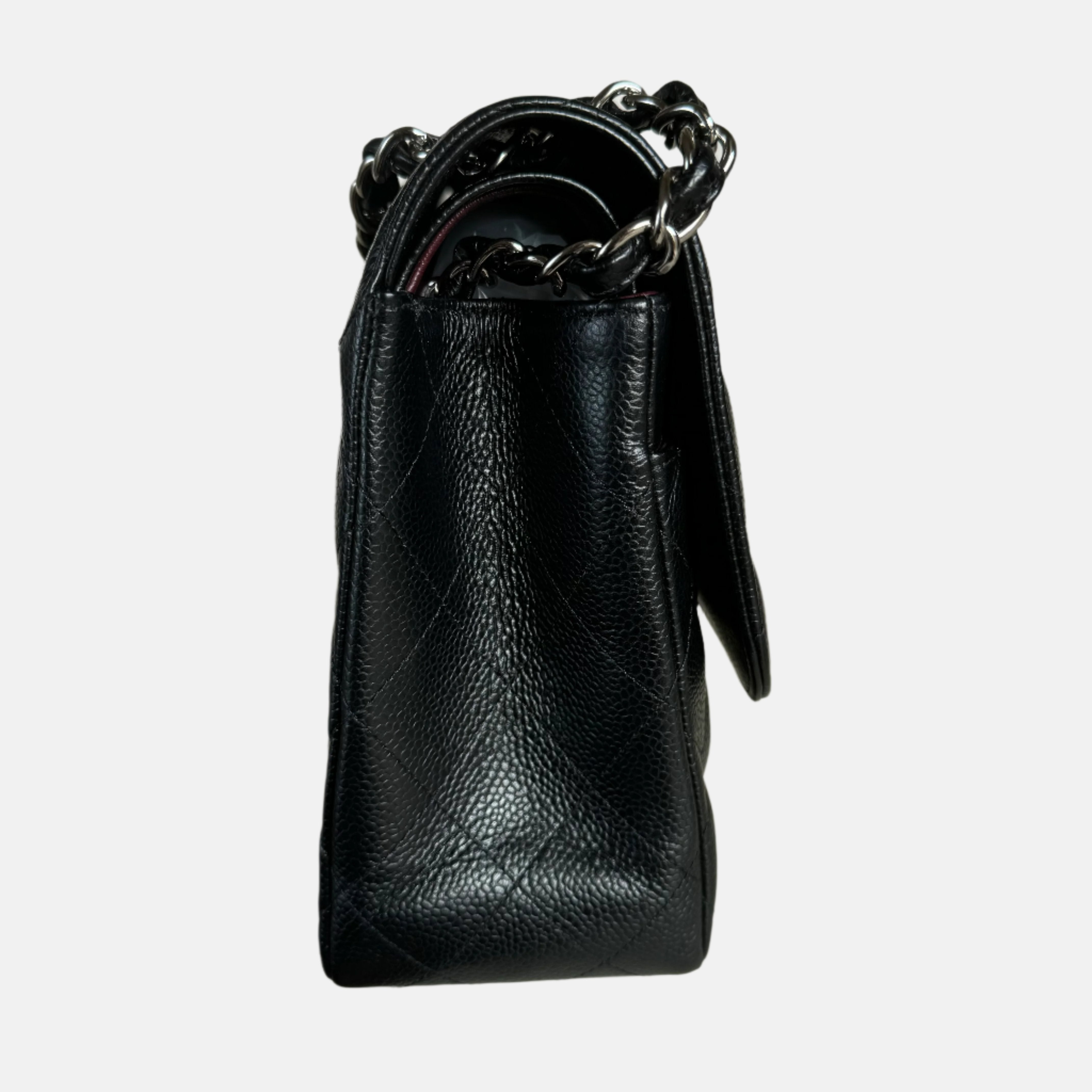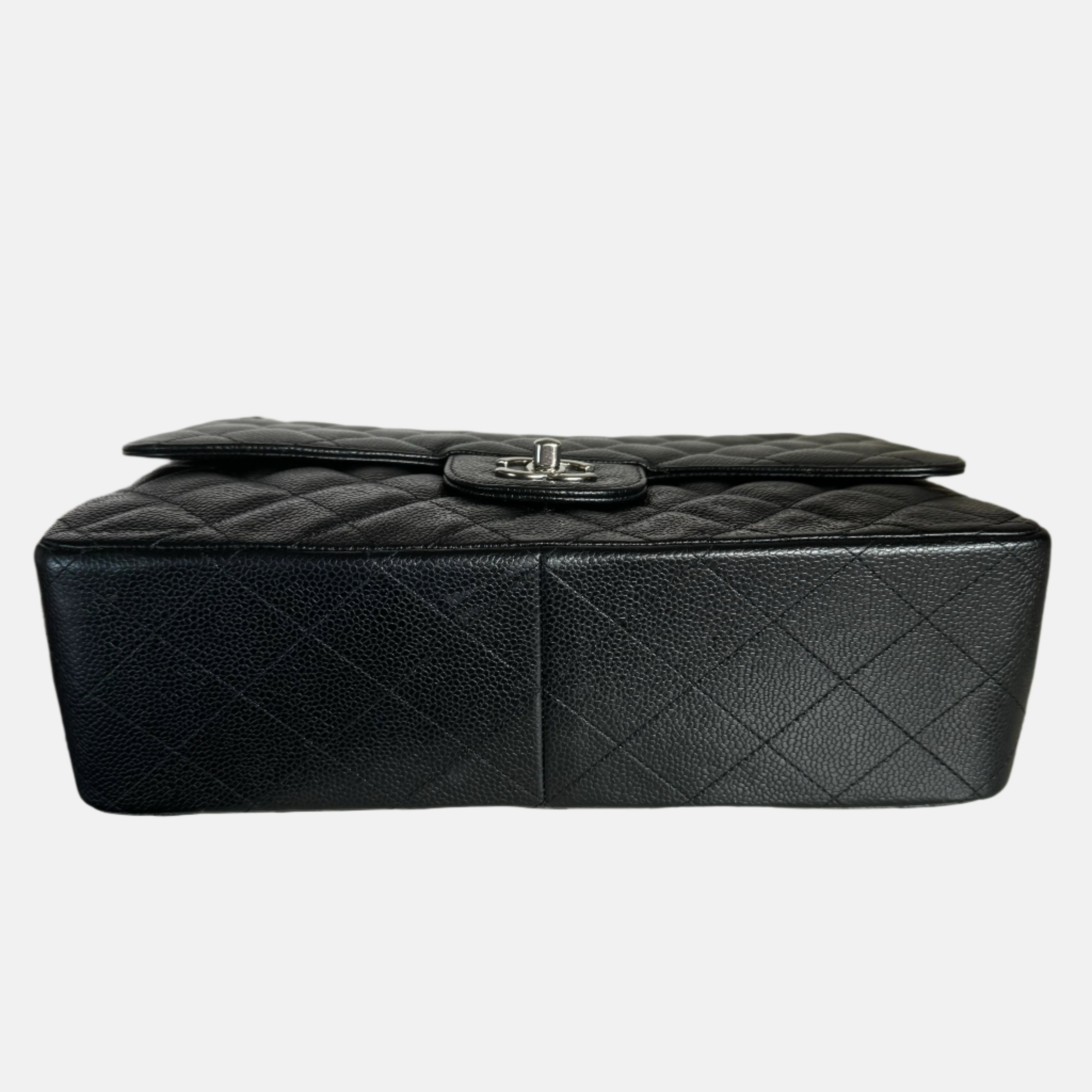 Embrace luxury with this timeless Chanel Classic Jumbo/Large Flap bag crafted in a scratch-resistant Caviar black leather and finished with gleaming silver hardware.Â