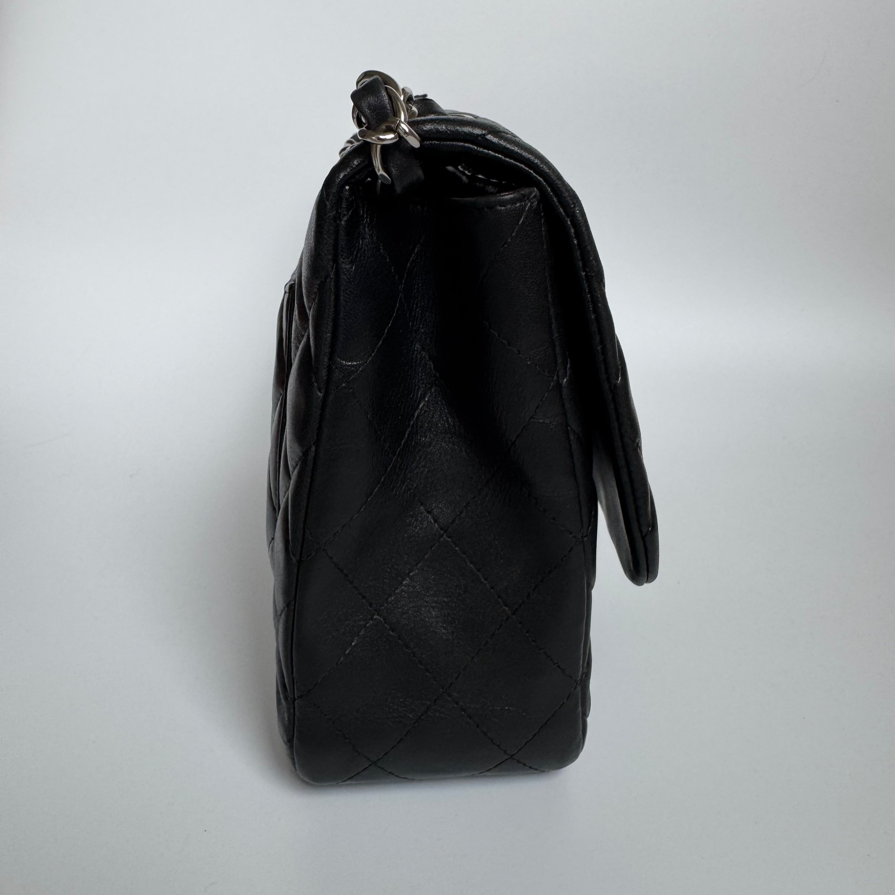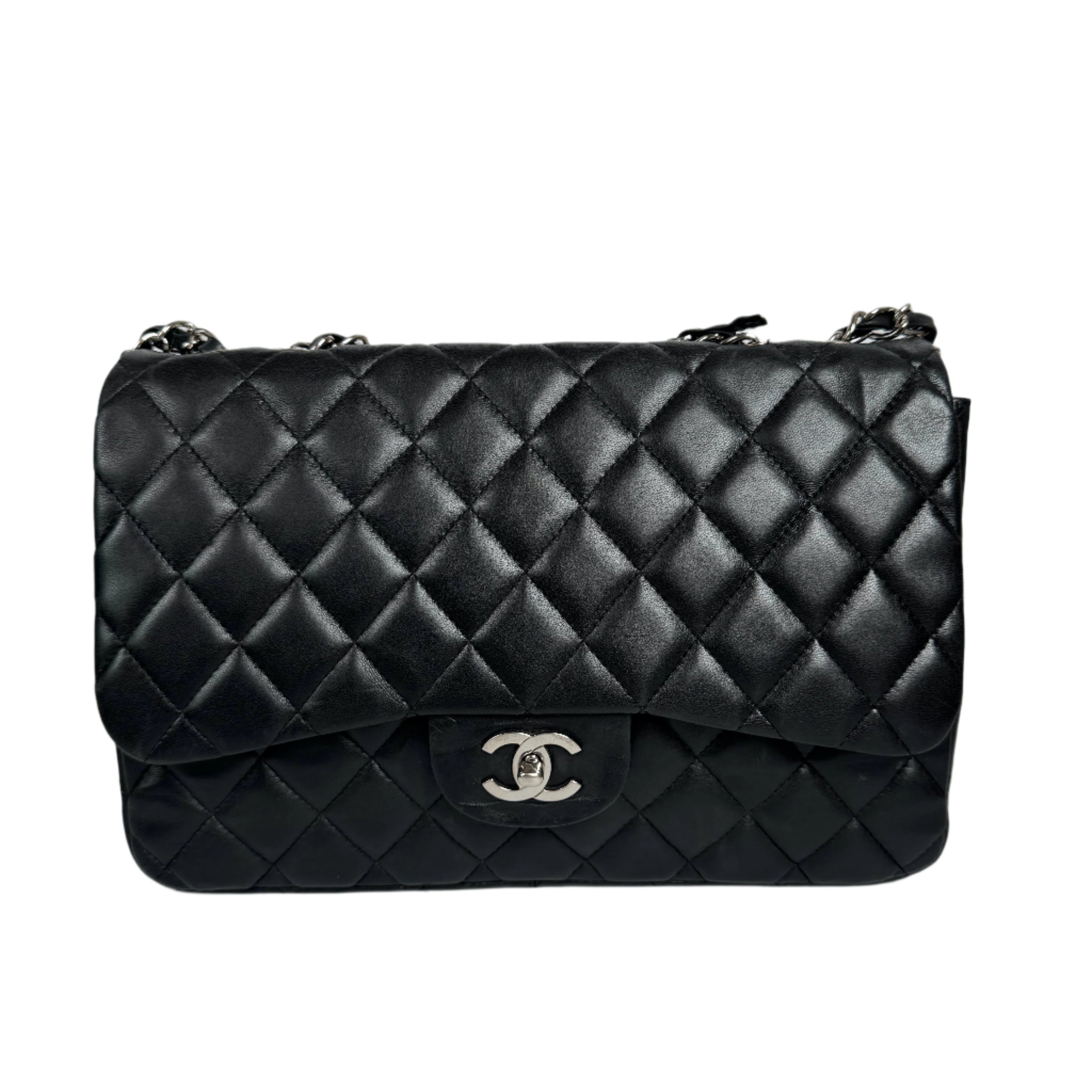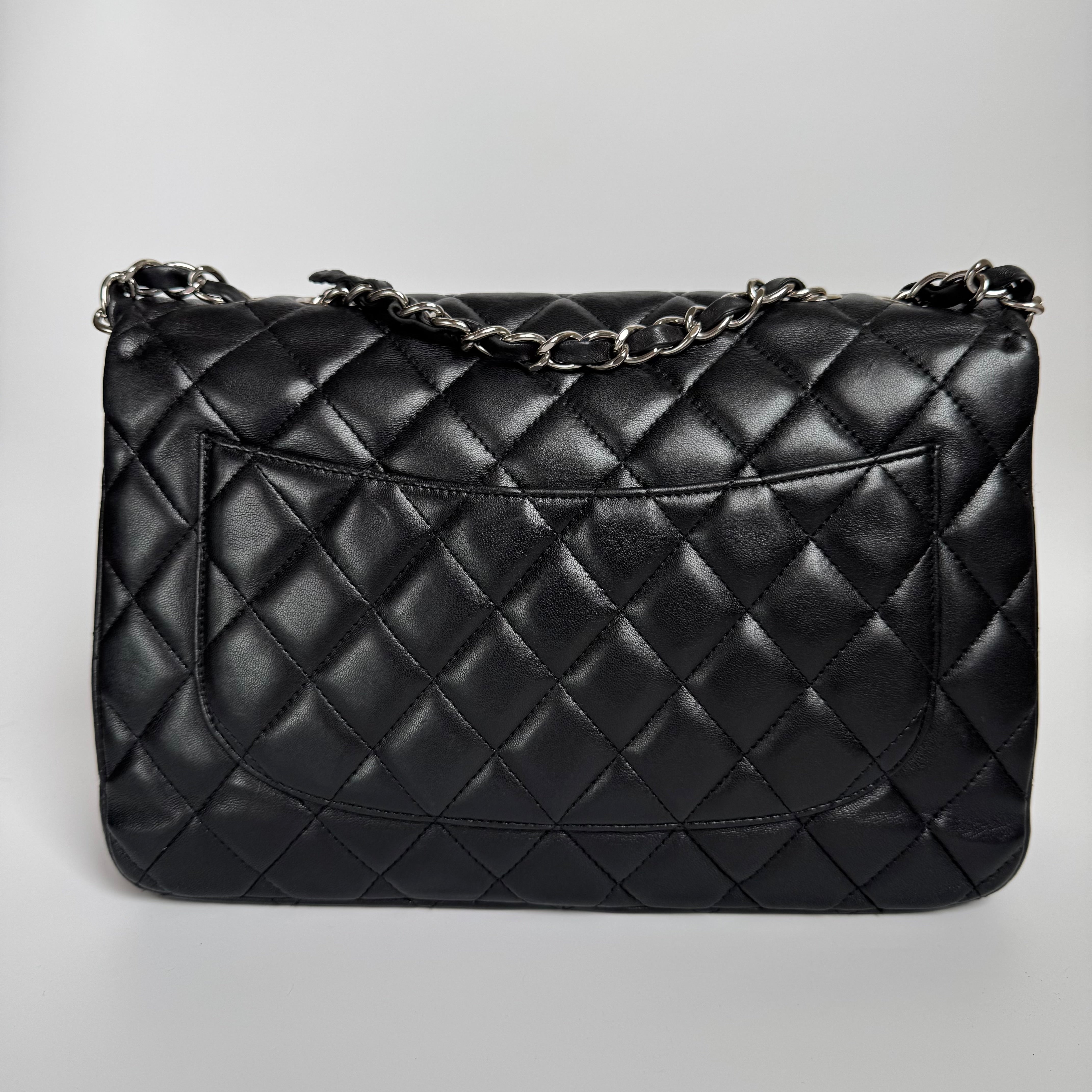 Embrace luxury with this timeless Chanel Classic Jumbo/Large Flap bag crafted in a luxurious black leather and finished with silver hardware.Â