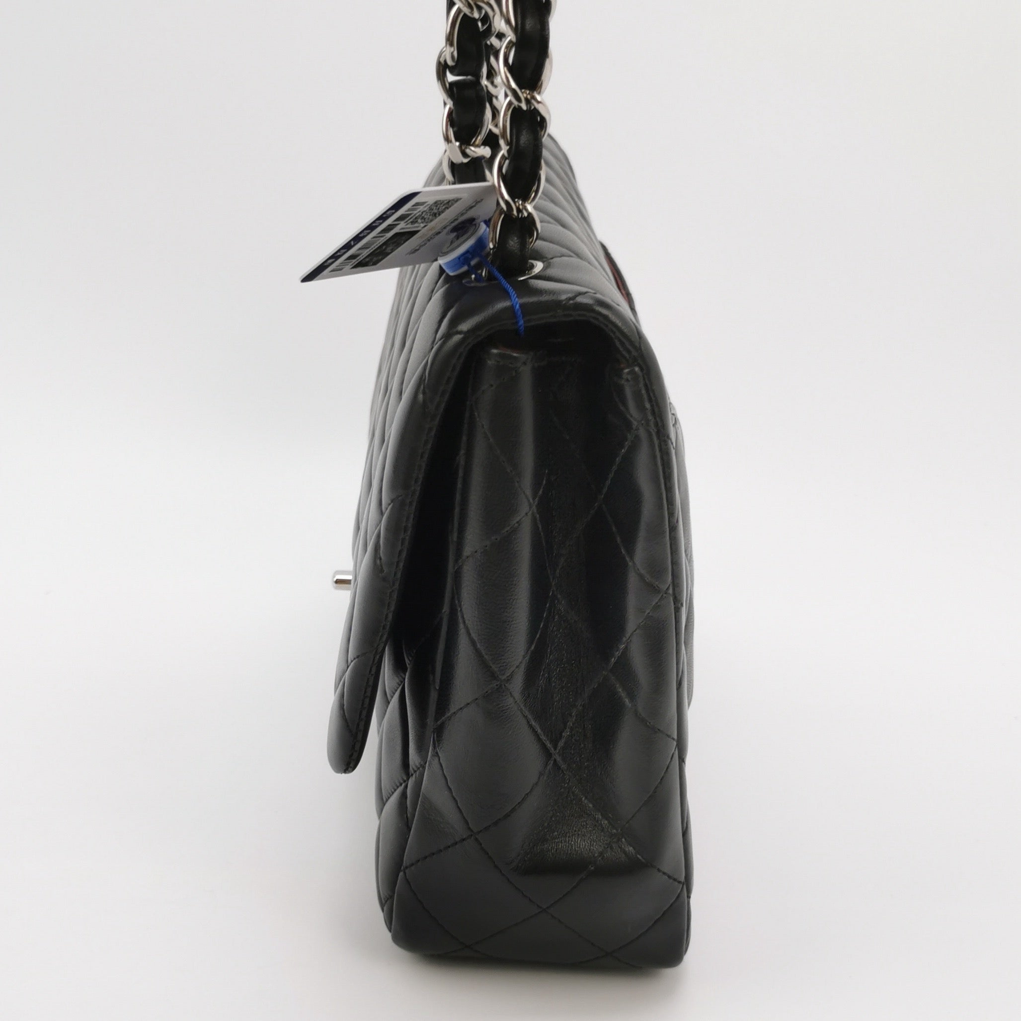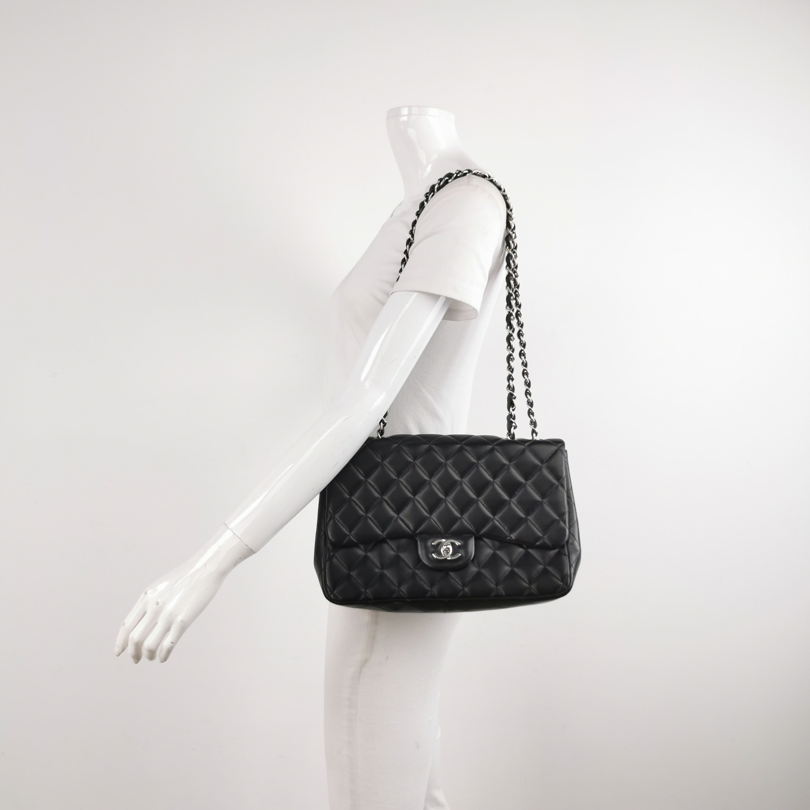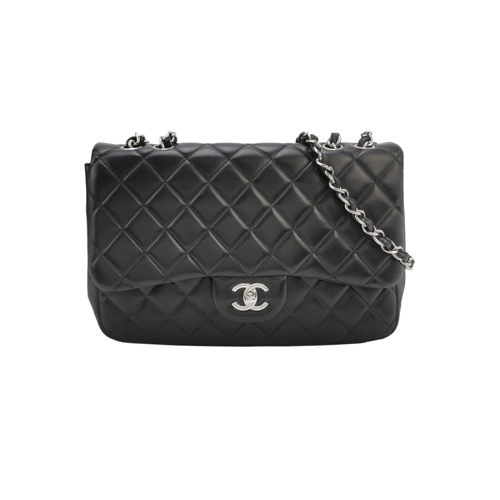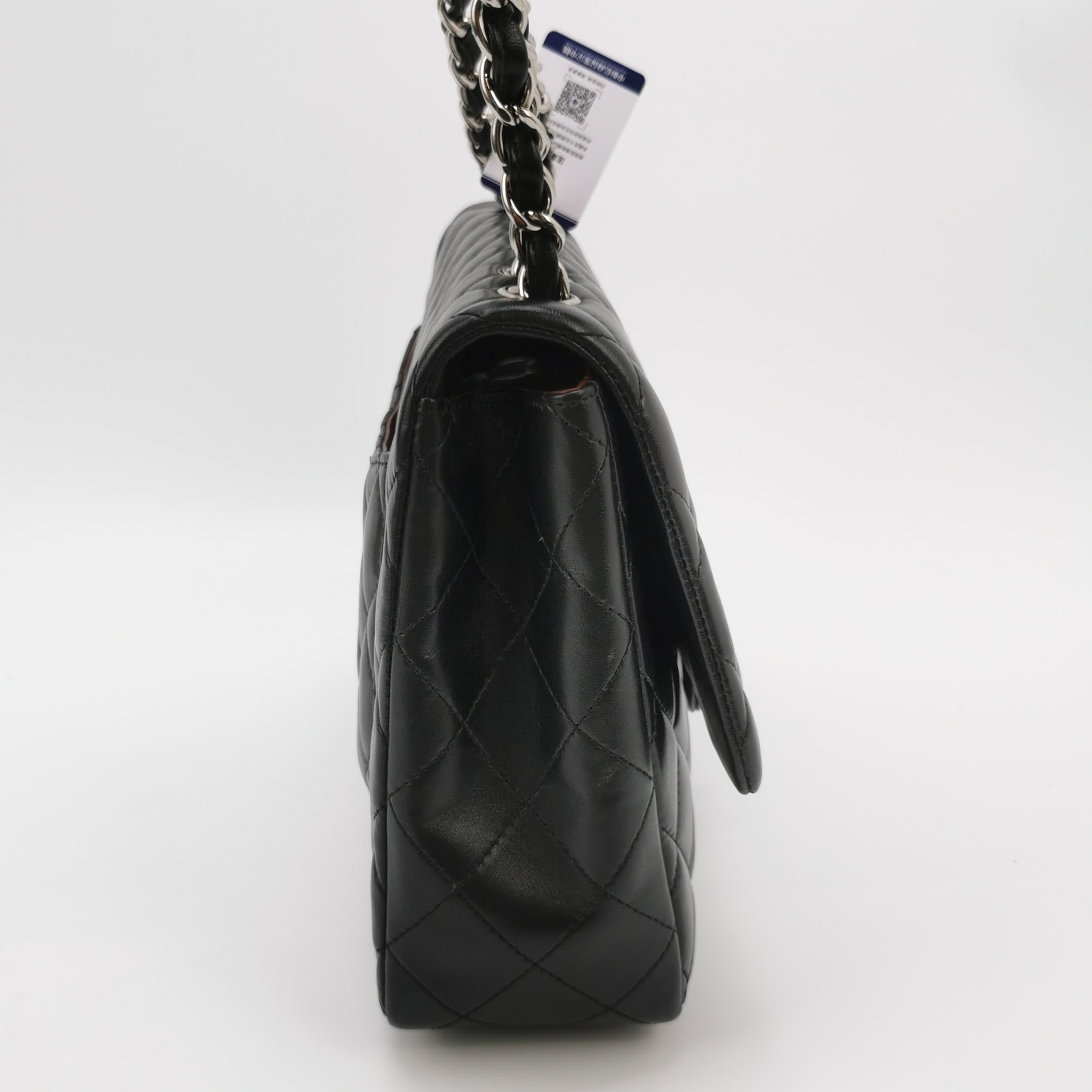 Embrace luxury with this timeless Chanel Classic Jumbo/Large Flap bag crafted in a luxurious black leather and finished with silver hardware.Â