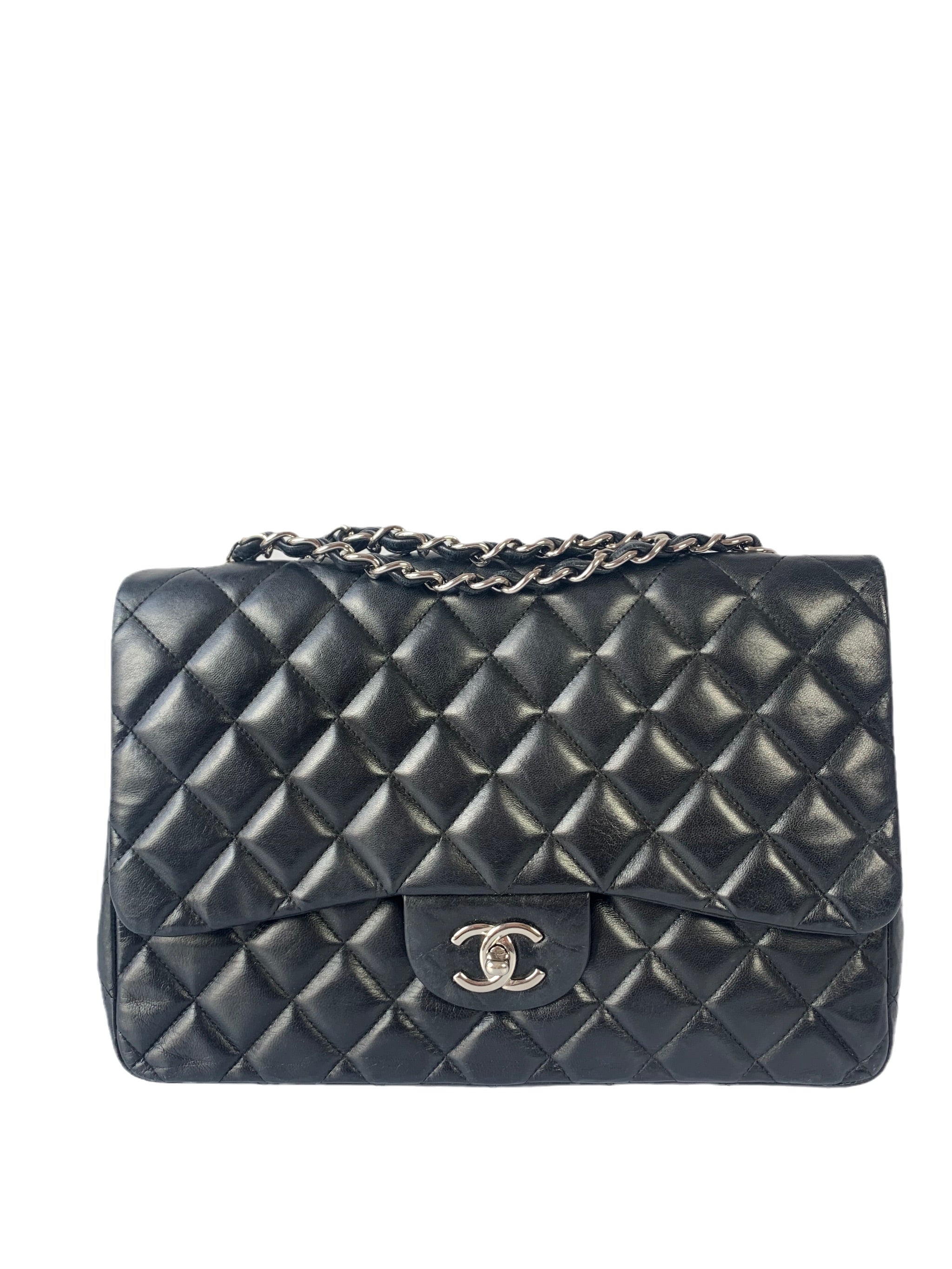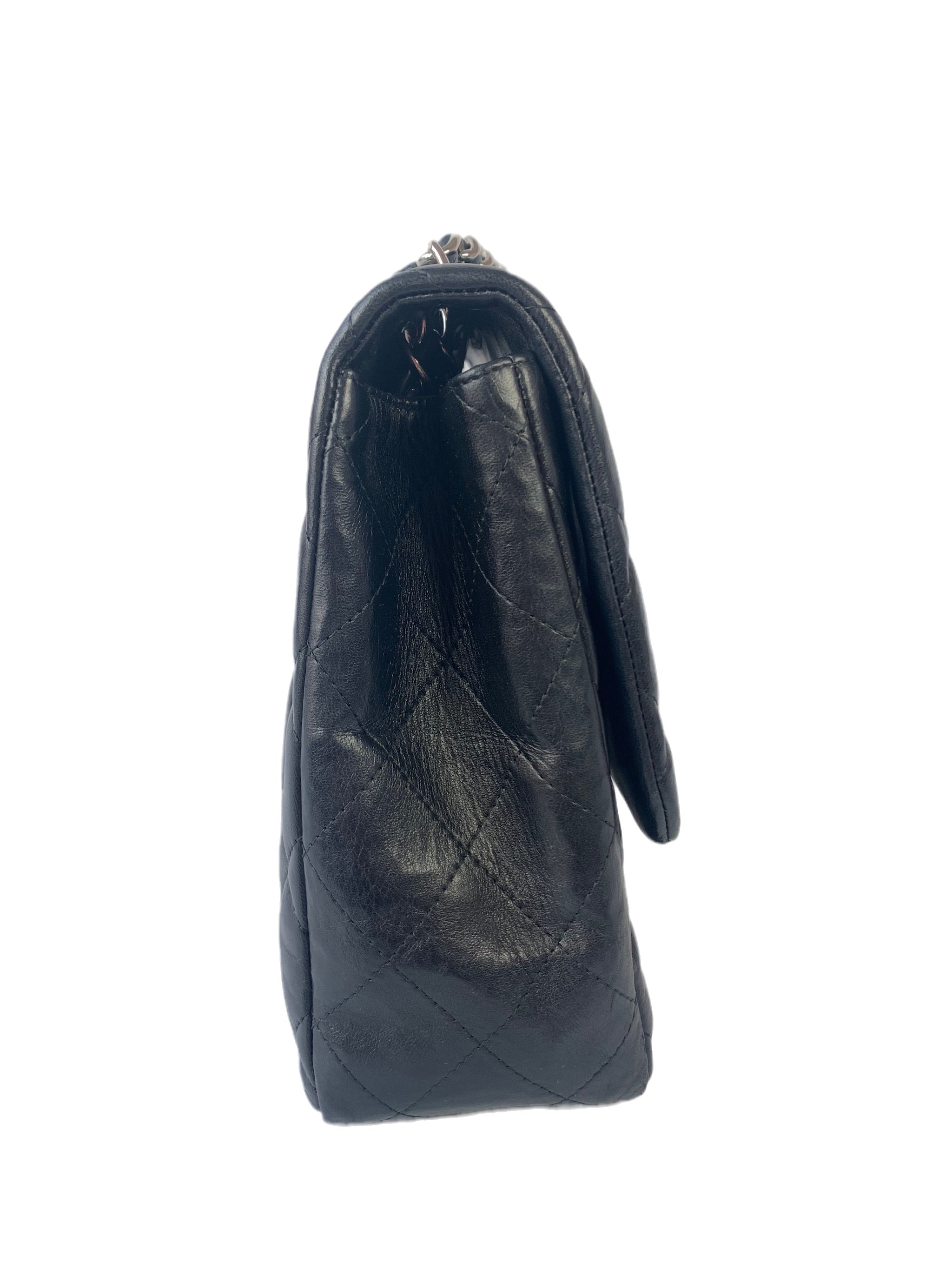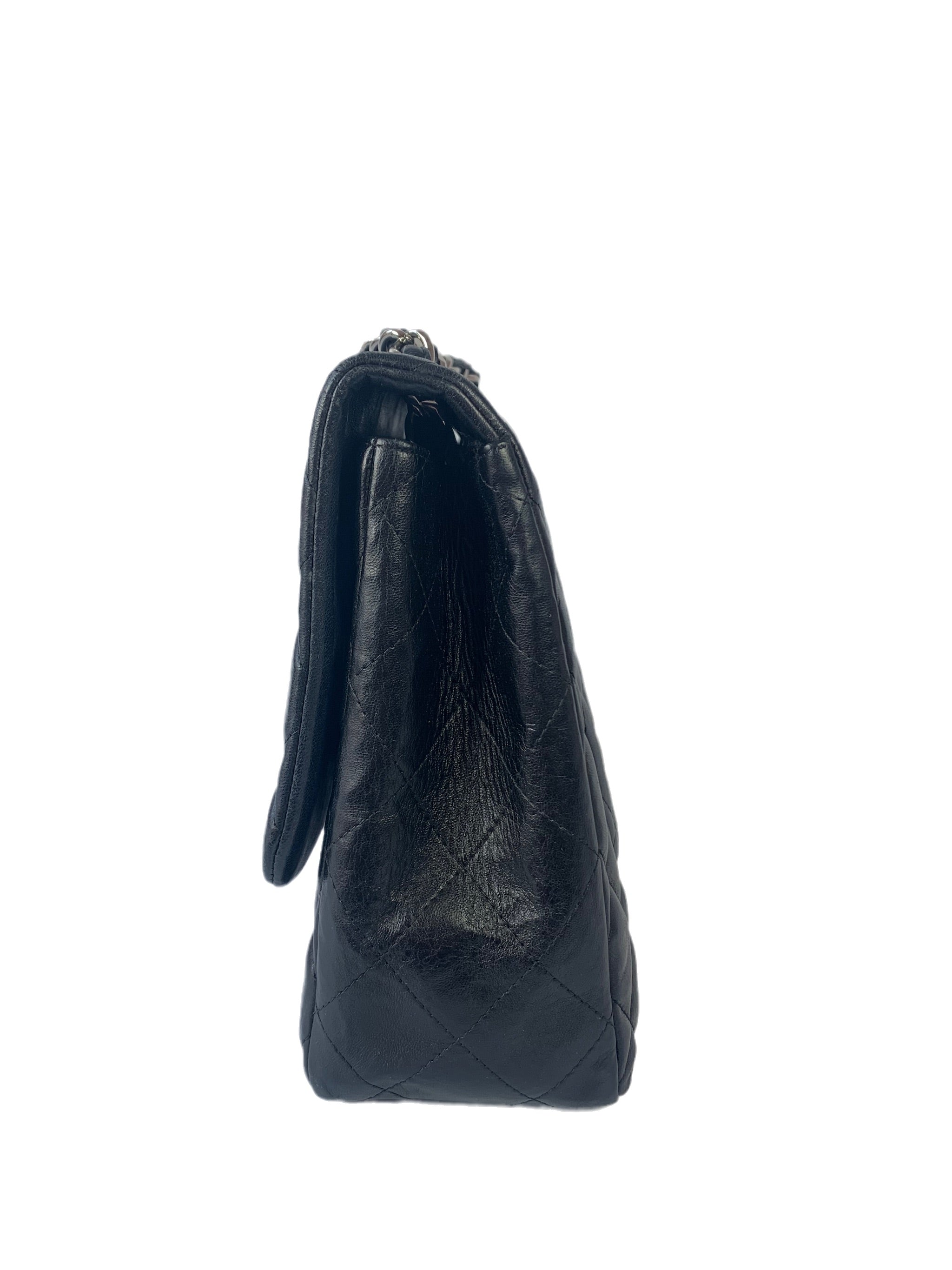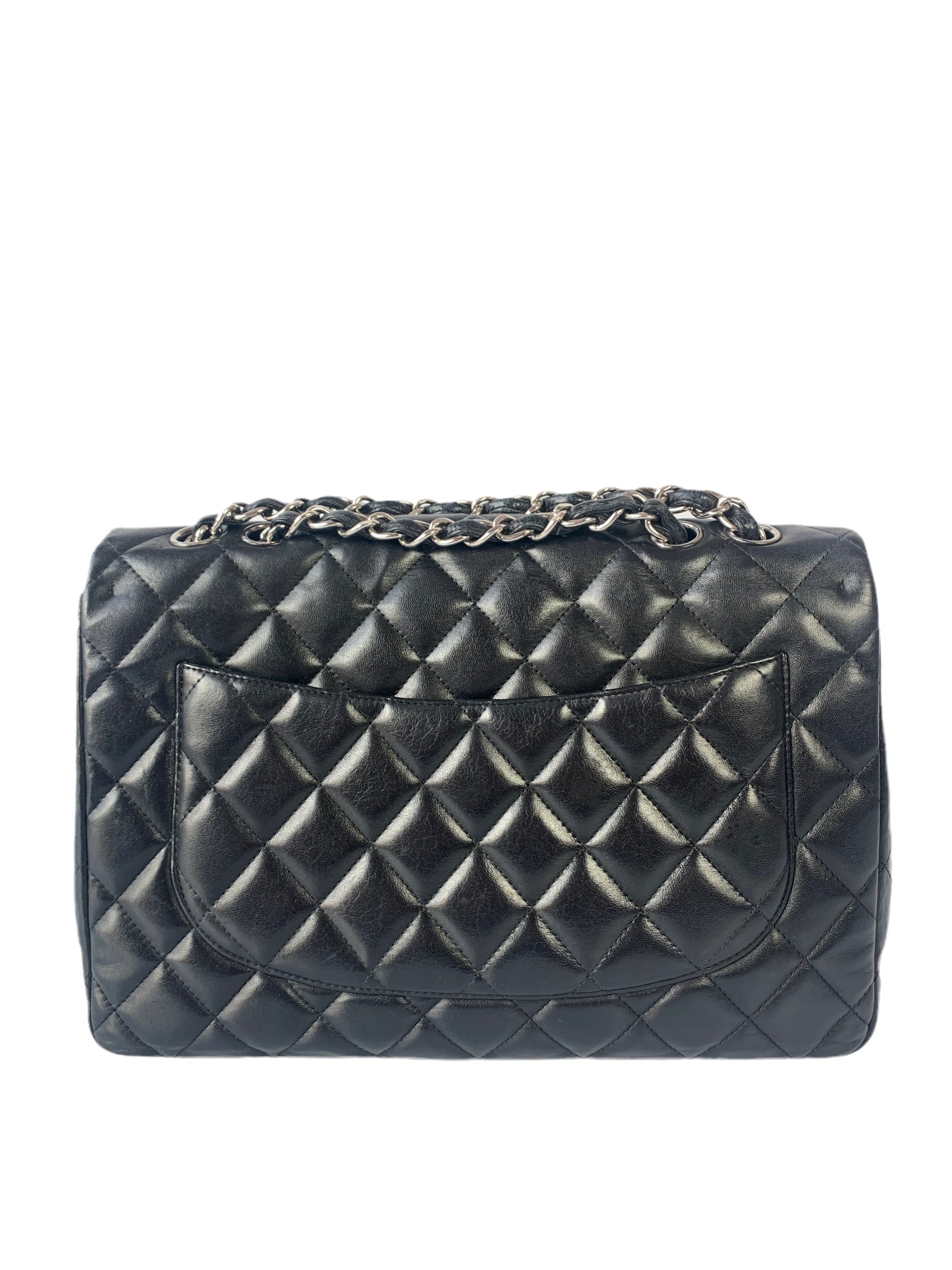Experience the ultimate in luxury with this Chanel Classic Flap Jumbo Large bag. Crafted from the finest black lambskin leather and silver hardware, this timeless piece showcases exquisite attention to detail.