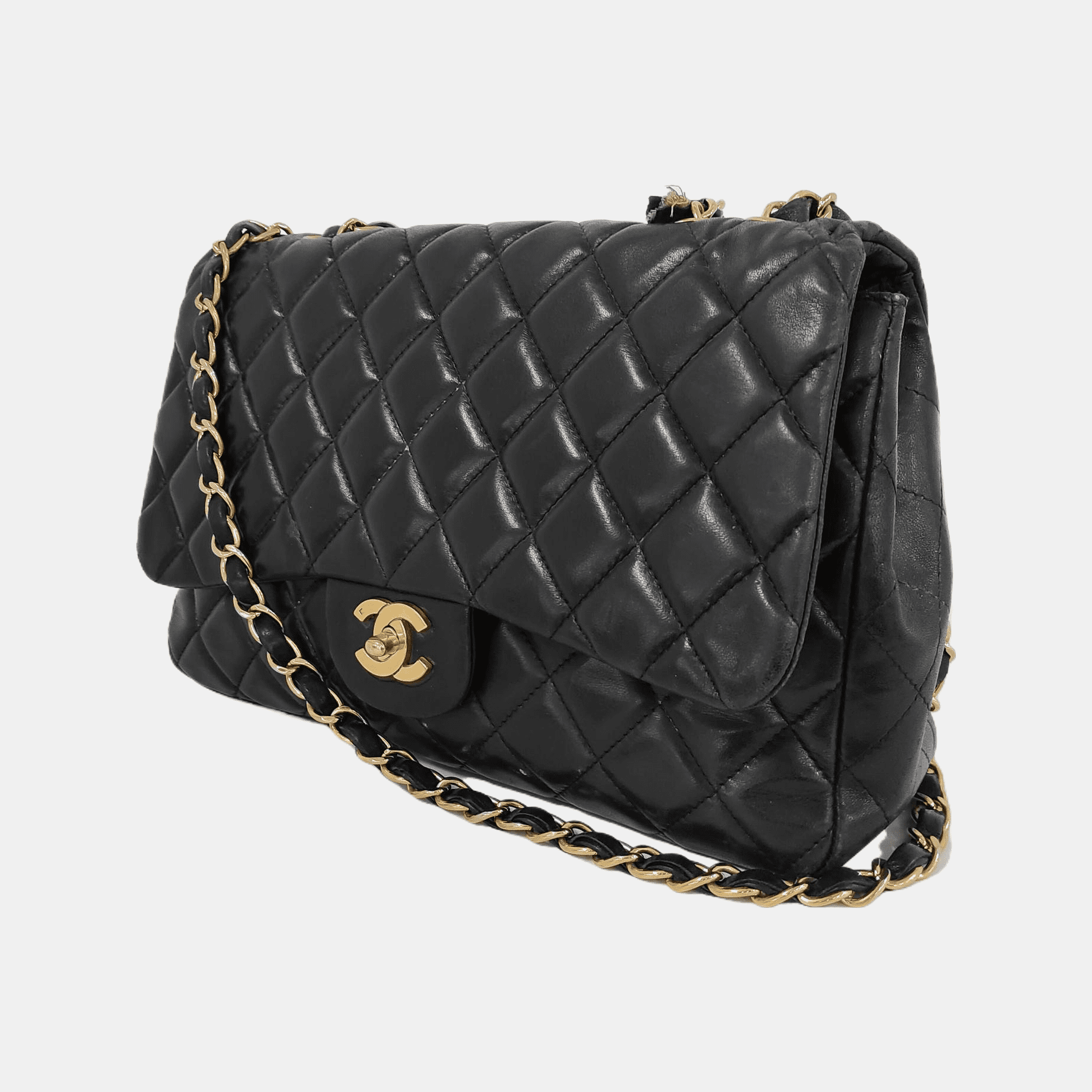 Embrace luxury with this timeless Chanel Classic Jumbo/Large Flap bag crafted in a luxurious black leather and finished with gleaming gold hardware.