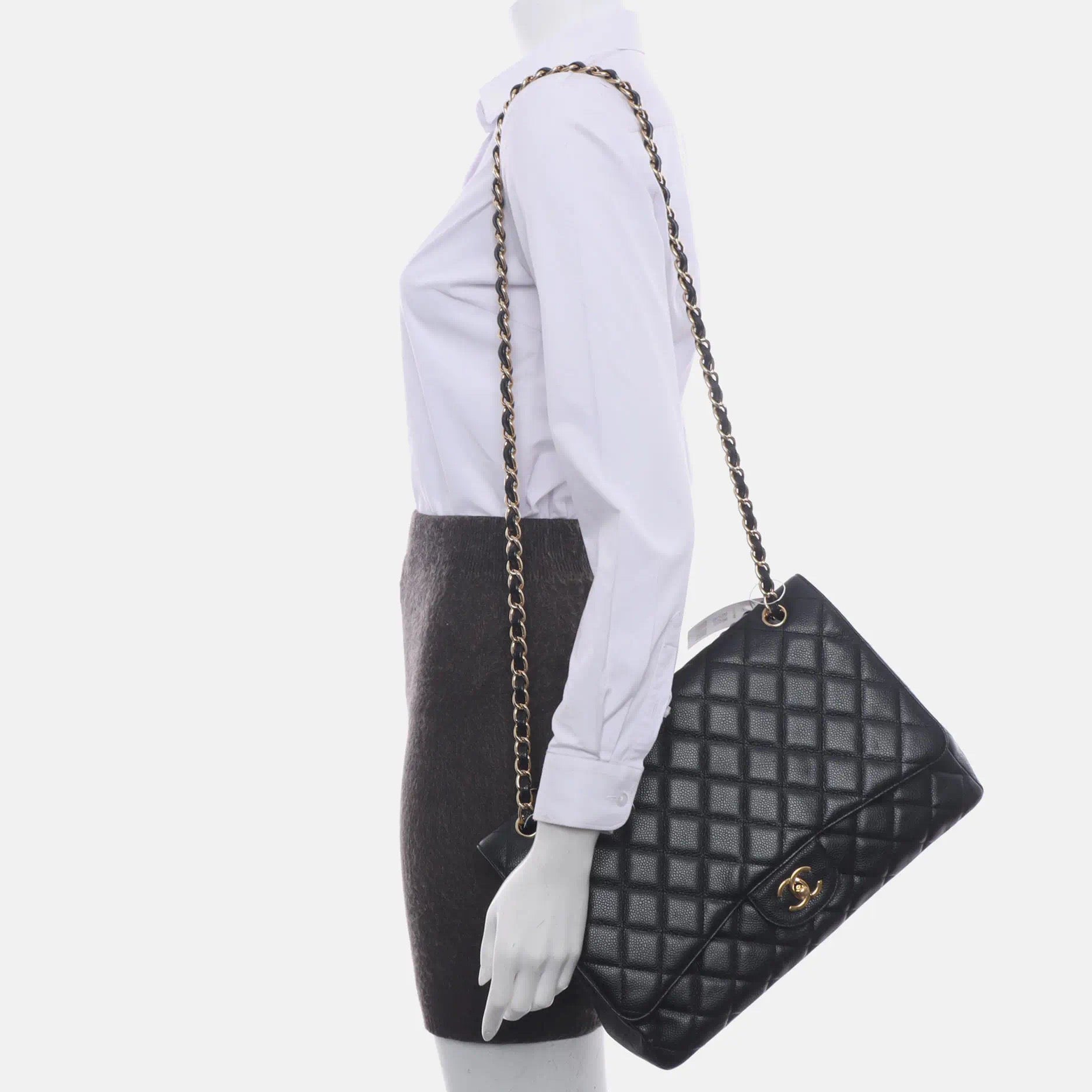 Embrace luxury with this timeless Chanel Classic Jumbo/Large Flap bag crafted in a scratch-resistant Caviar black leather and finished with gleaming gold hardware.