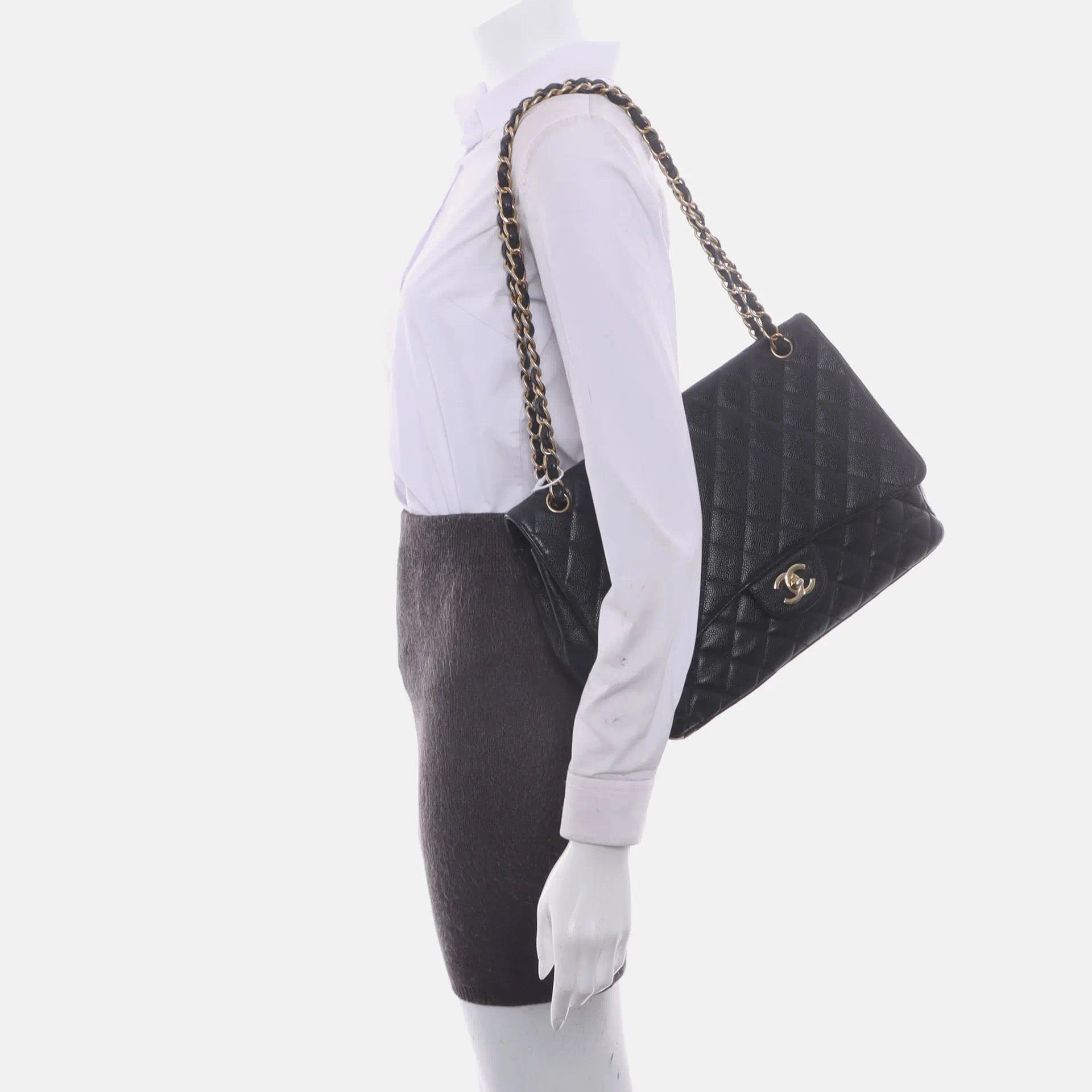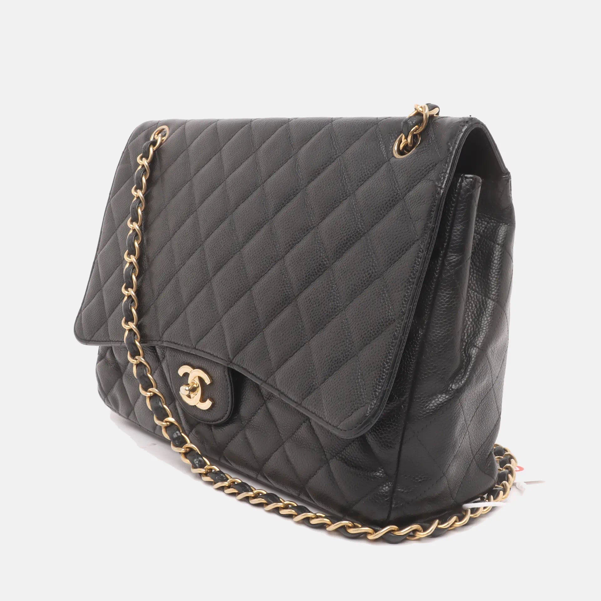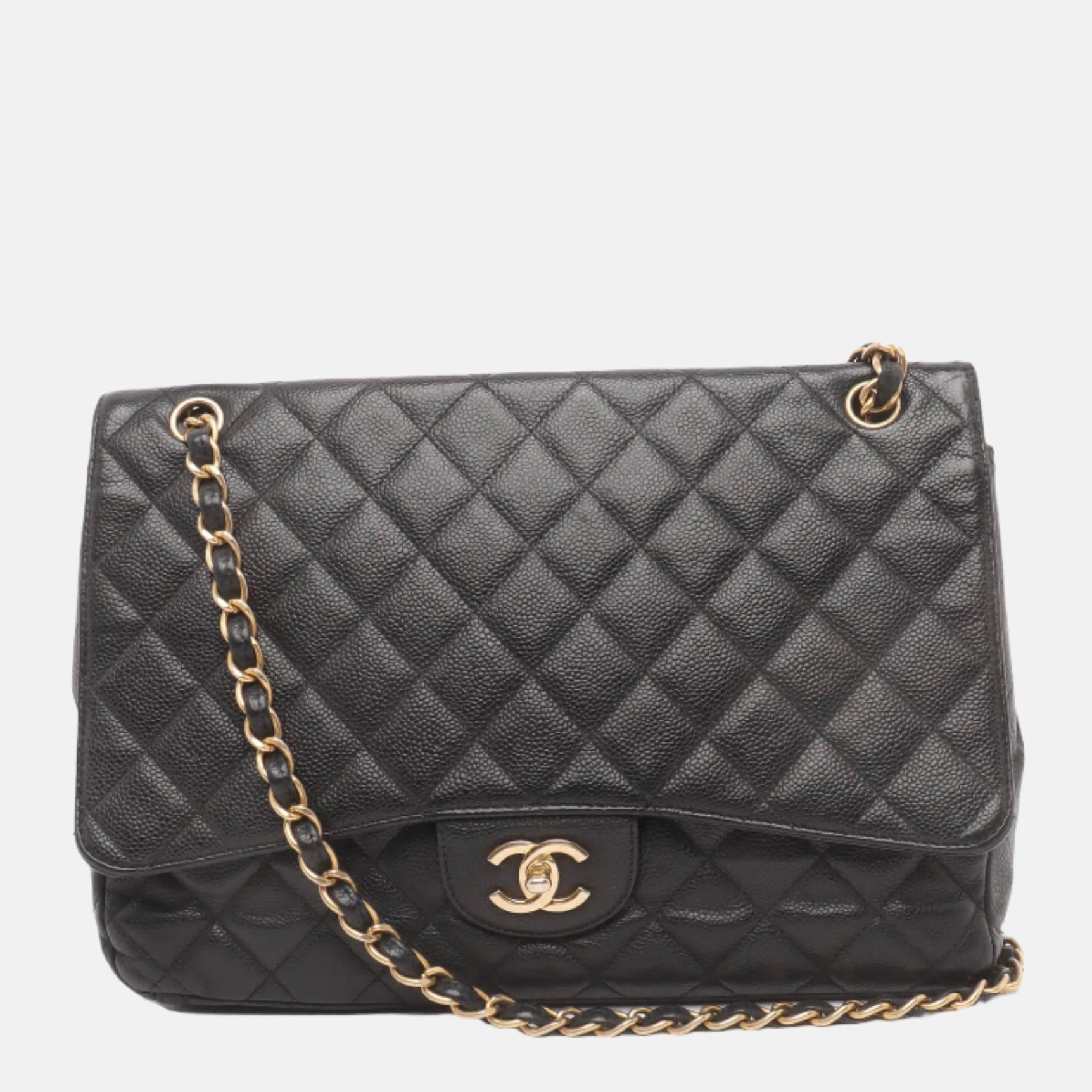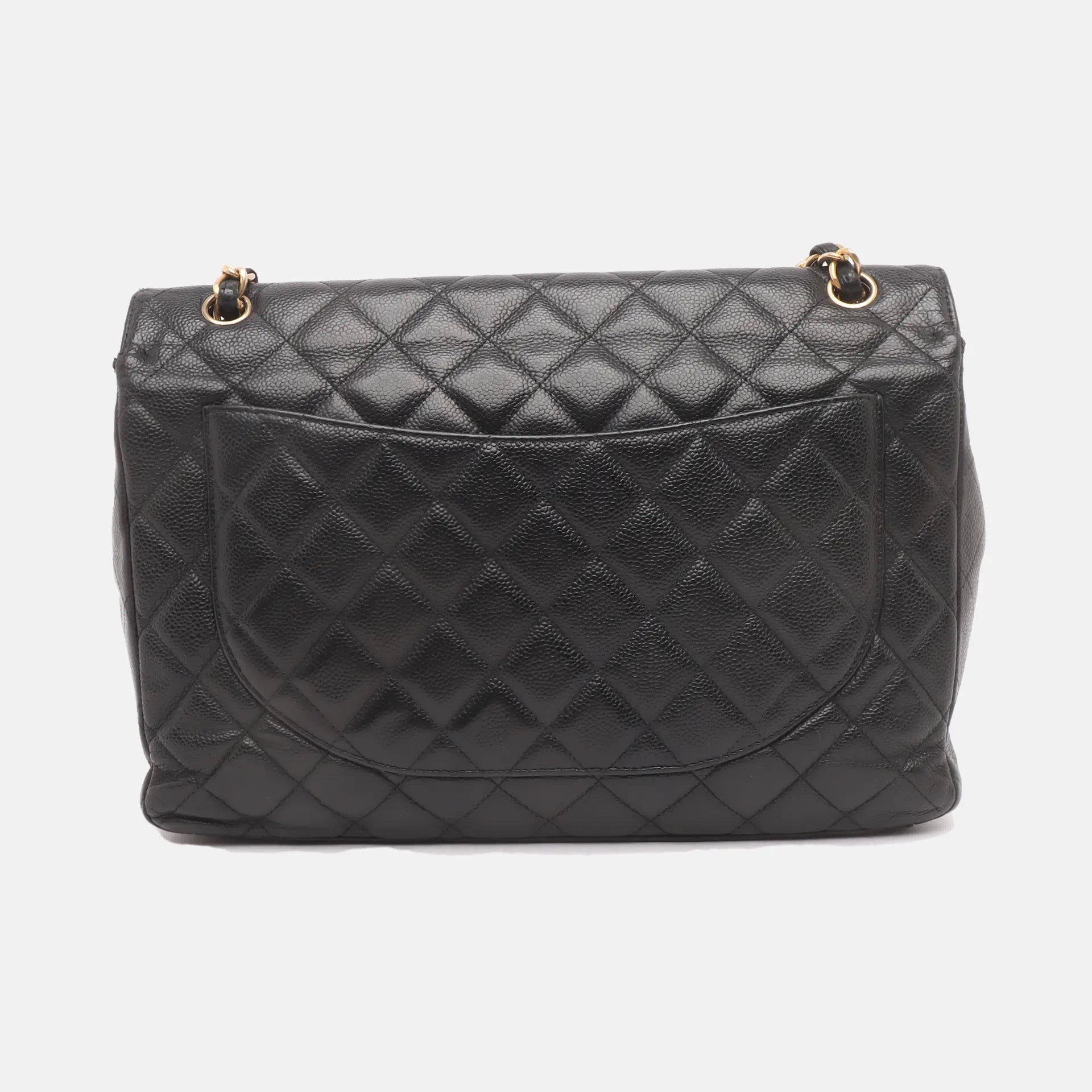 Embrace luxury with this timeless Chanel Classic Jumbo/Large Flap bag crafted in a scratch-resistant Caviar black leather and finished with gleaming gold hardware.Â