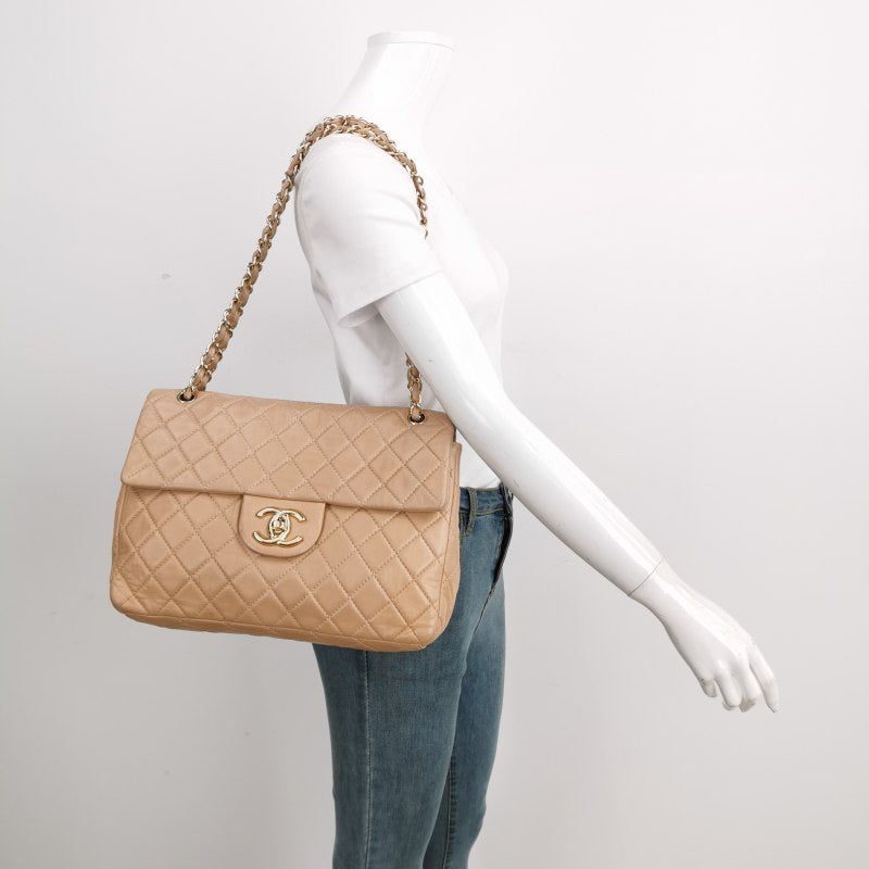 Chanel Classic Flap Maxi Beige Latte Lambskin Leather Giant Gold-tone CC Logo