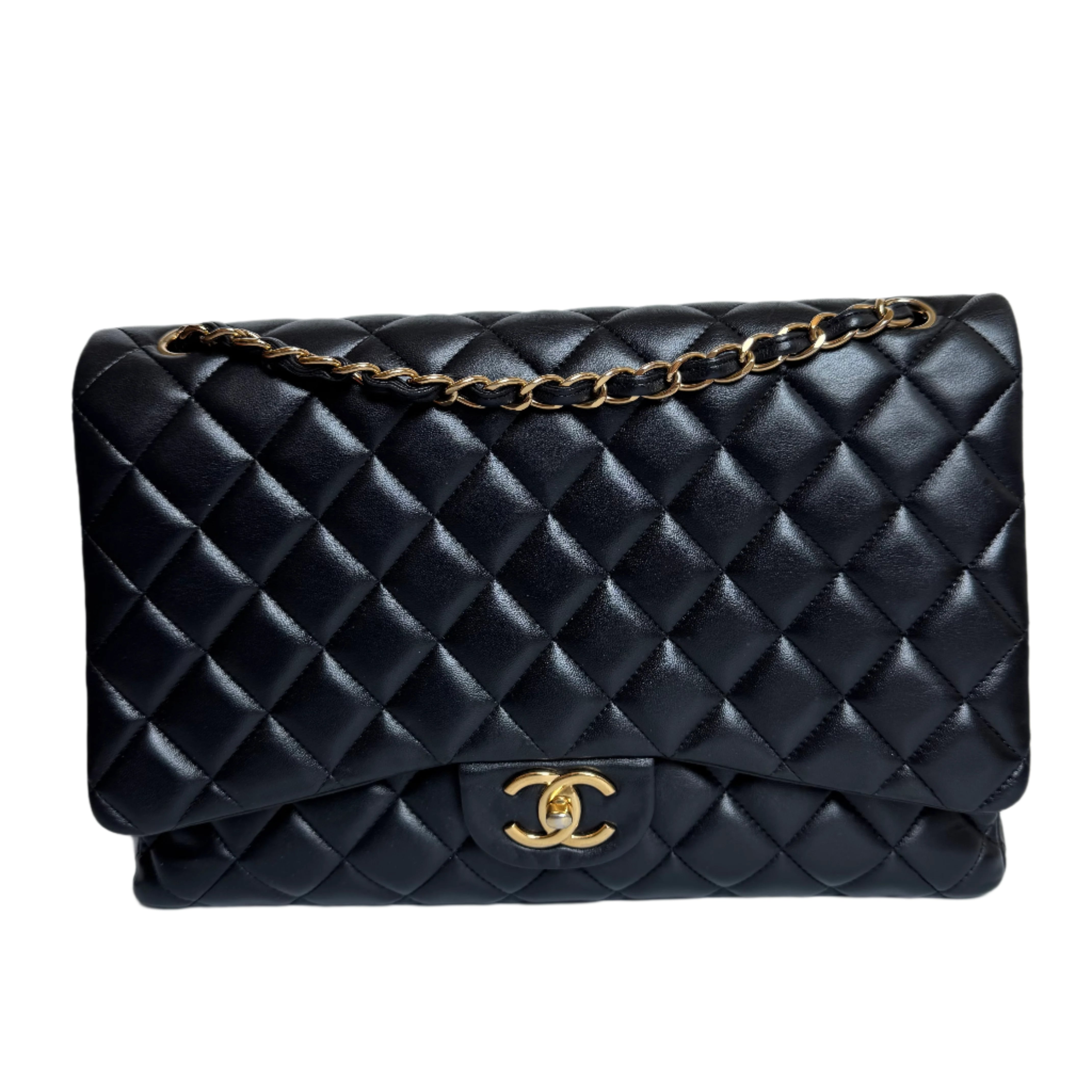 Embrace luxury with this timeless Chanel Classic Maxi Flap bag crafted in luxurious lambskin leather and finished with gleaming gold hardware.Â