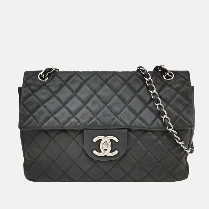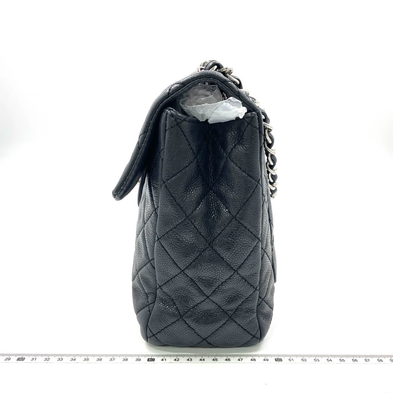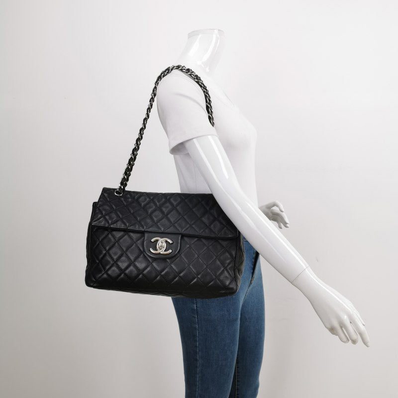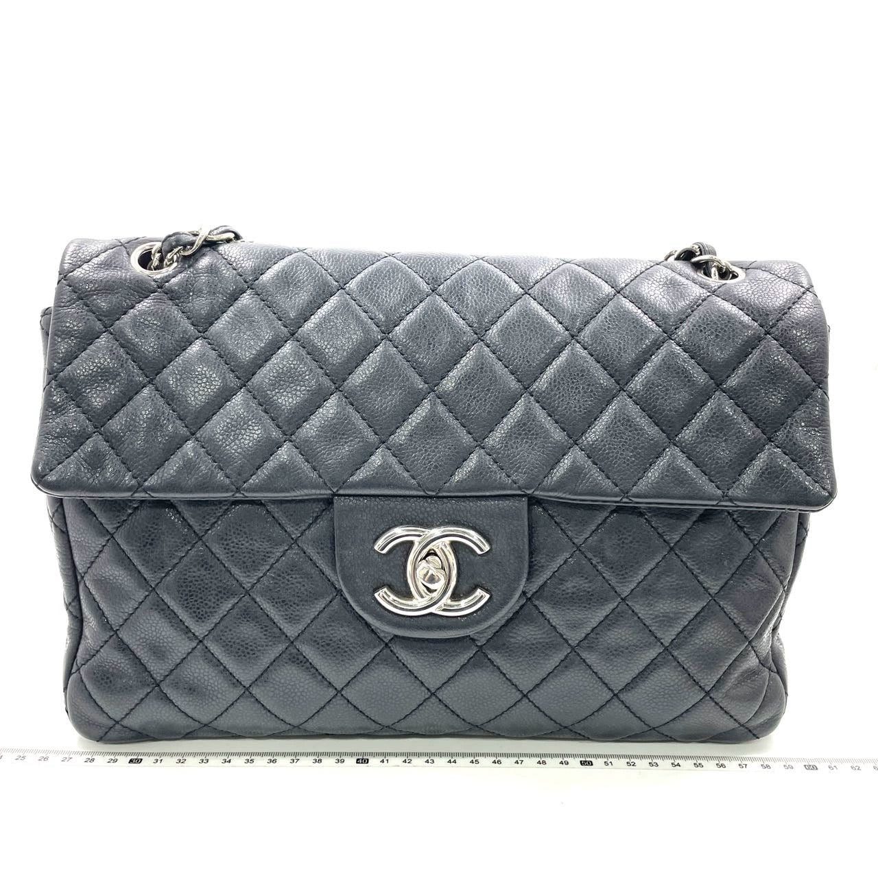 Experience timeless elegance with the Chanel Classic Flap Maxi Shoulder Bag. Crafted with soft luxurious caviar leather in black and silver-tone plated hardware, this stunning bag exudes sophistication. The iconic big CC logo stands out against the white color, making it a statement piece for any occasion.