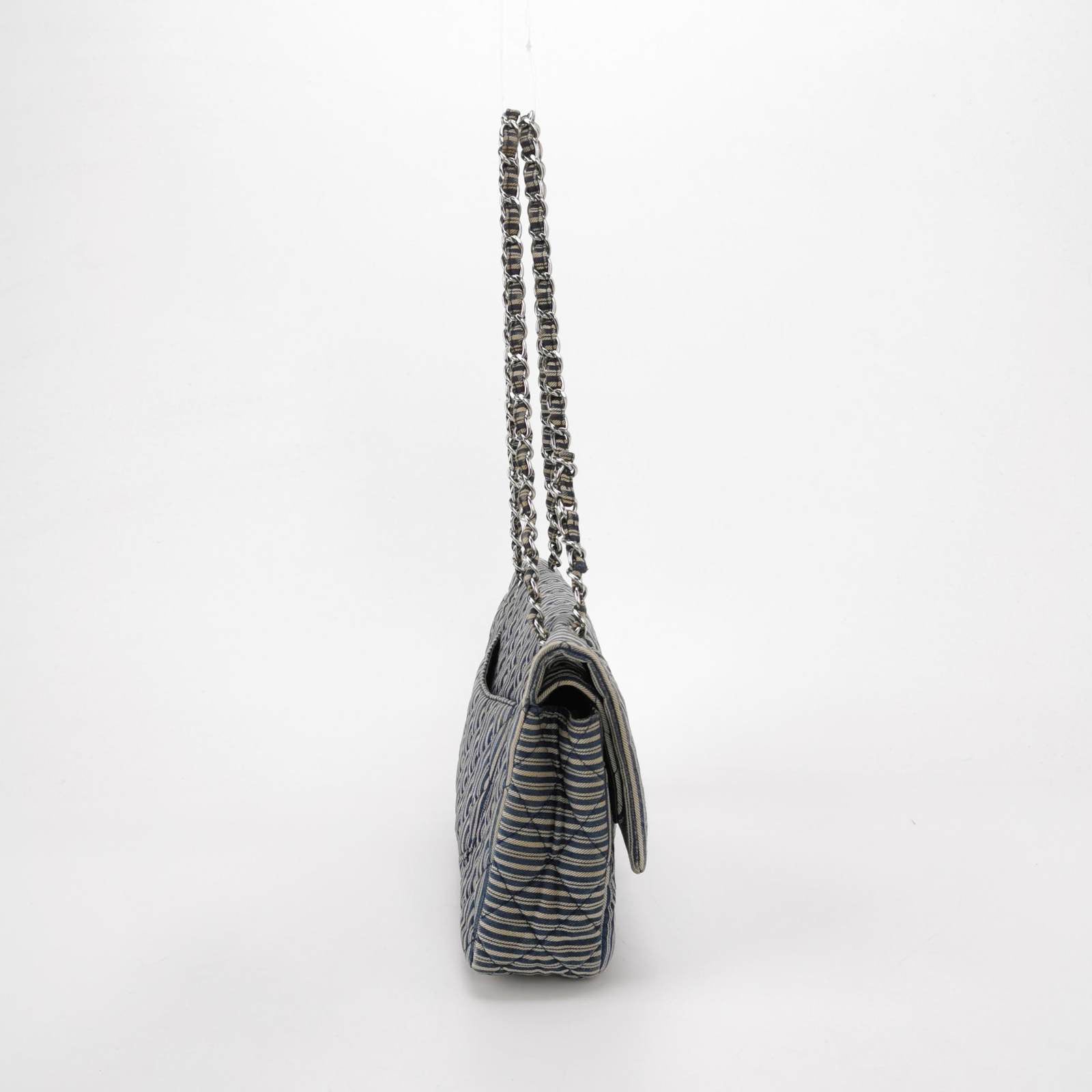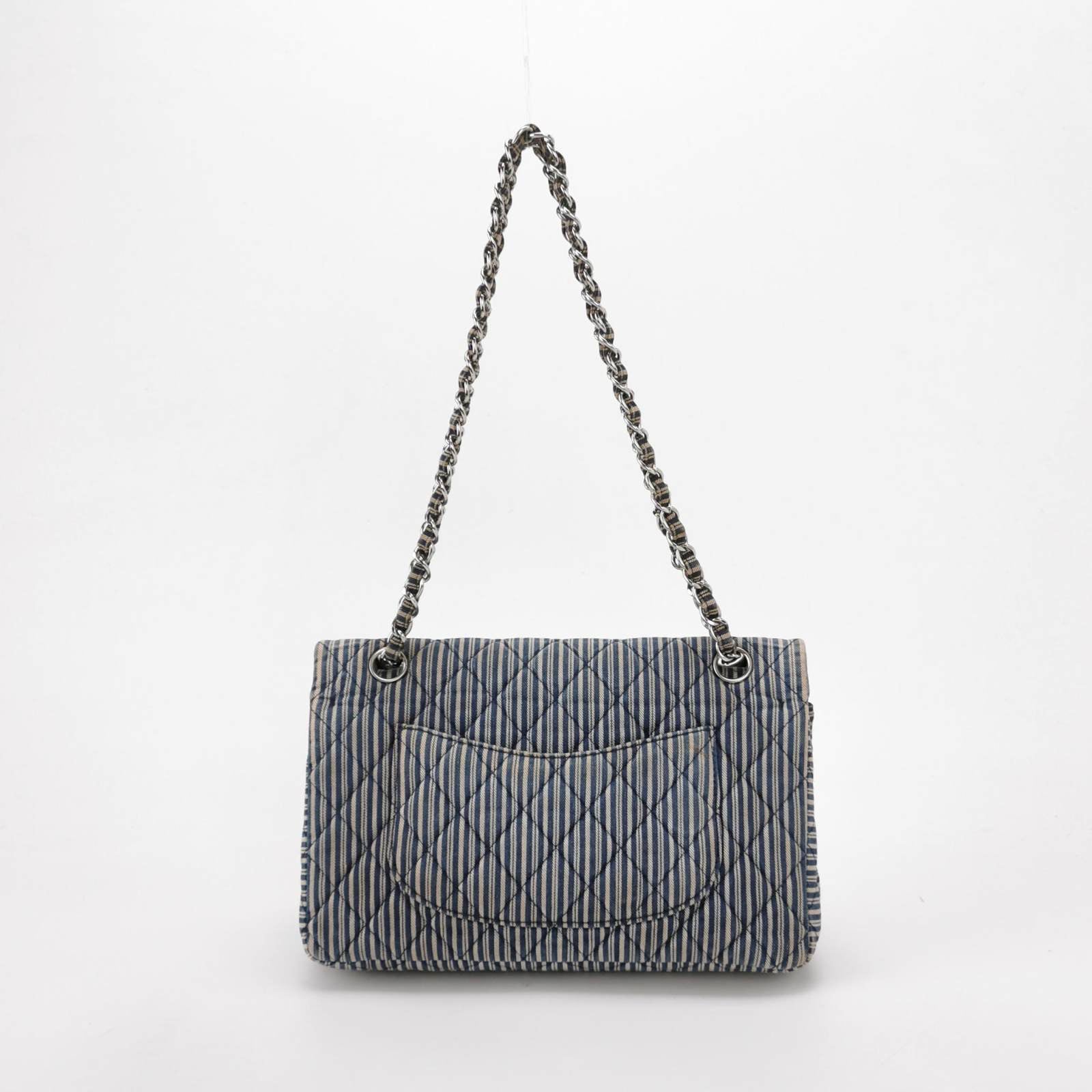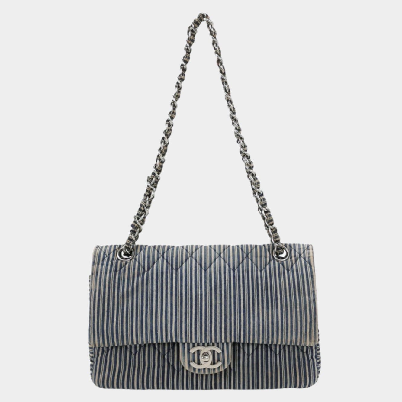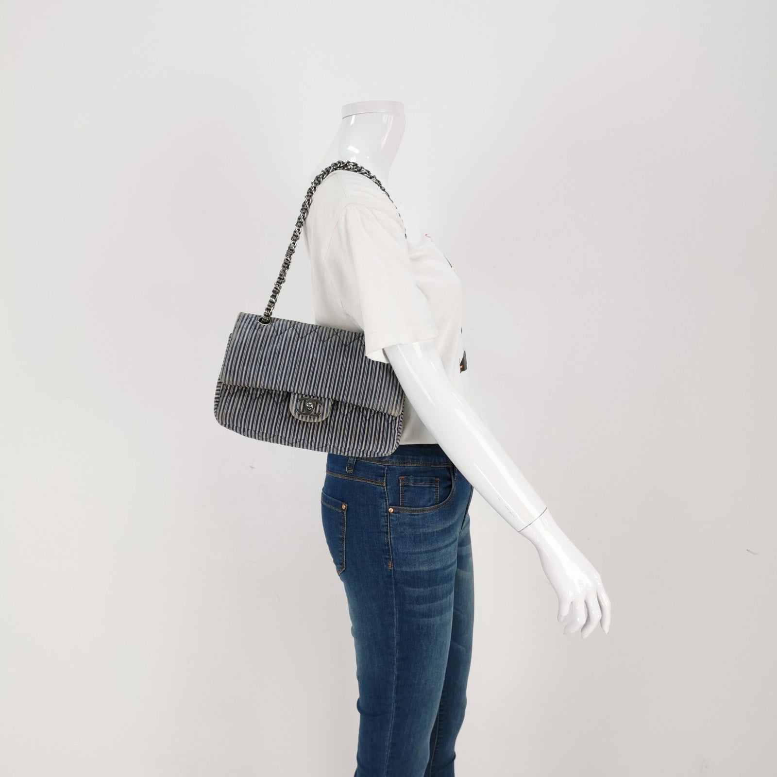This is a lightweight Chanel Timeless / Classic Flap in light blue stripe-pattern denim with silver hardware. It offers a casual take on the classic style while still maintaining a classy and practical design, making it perfect for everyday wear.