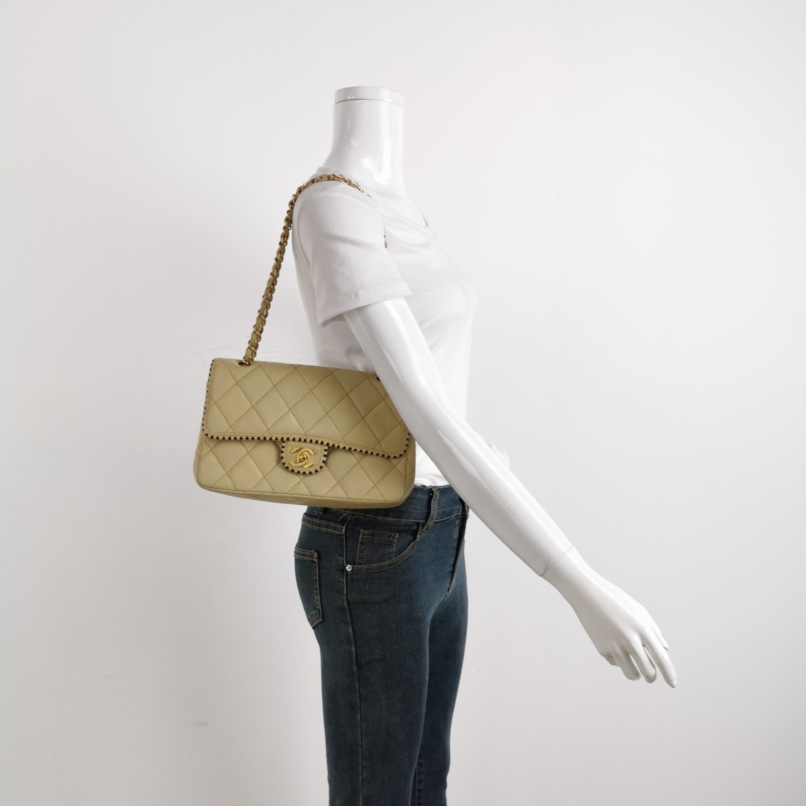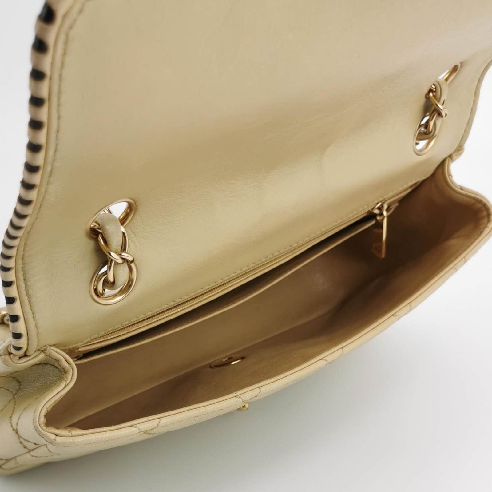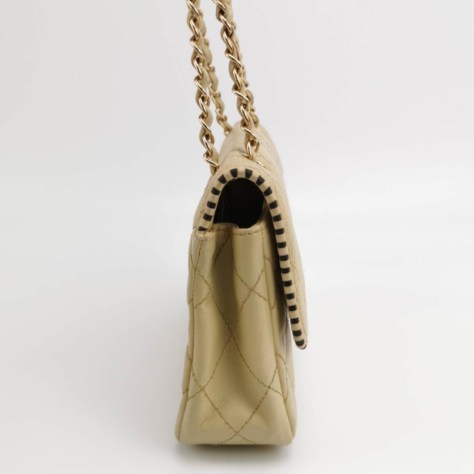This one-of-a-kind Chanel Classic Flap bag exudes sophistication and timeless elegance. Crafted from luxurious beige lambskin leather, it is adorned with 24k gold plated hardware, accentuated with contrasting black stitching trim. Single flap and double matelasse chain.Â