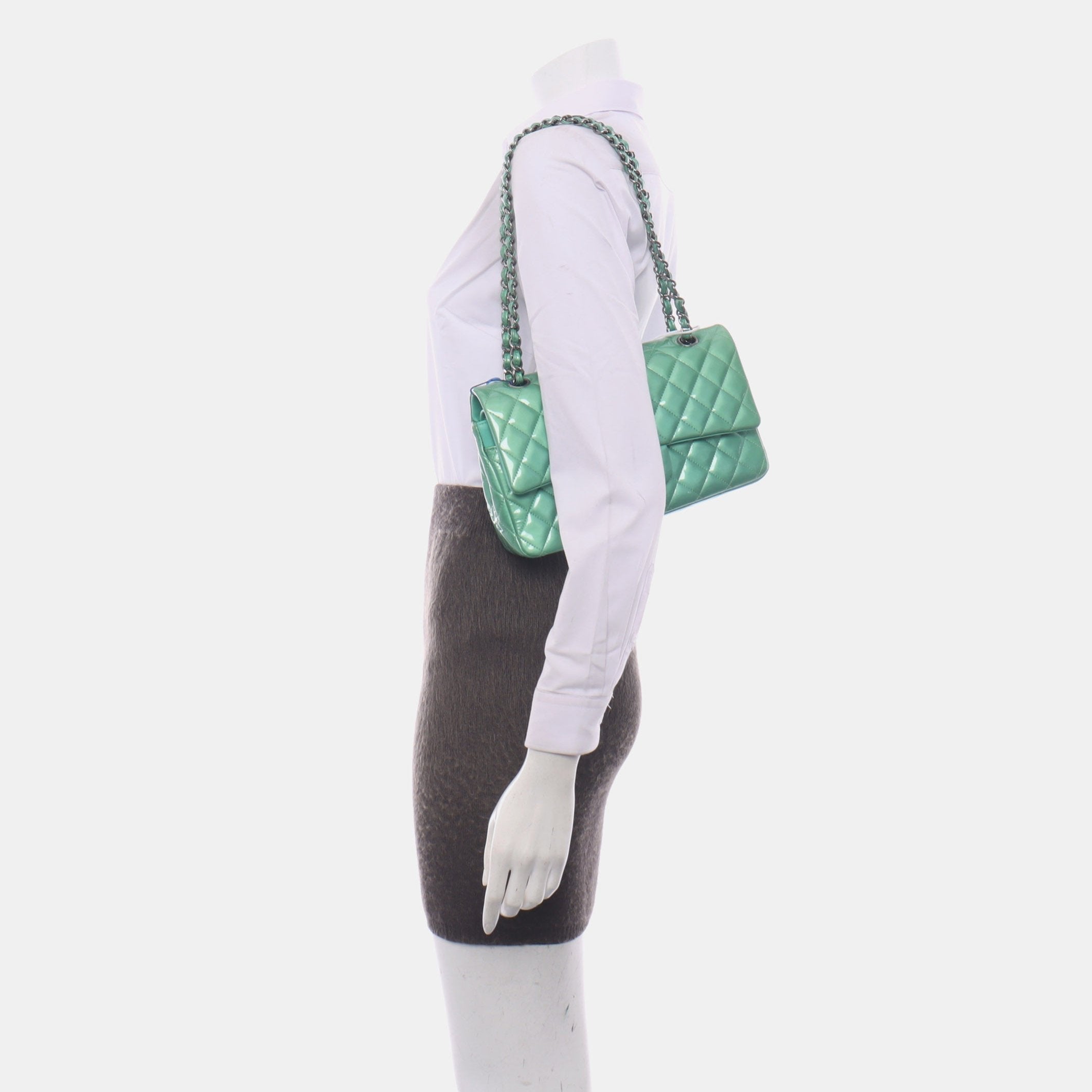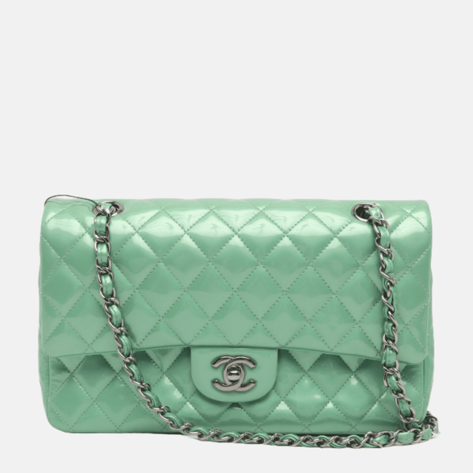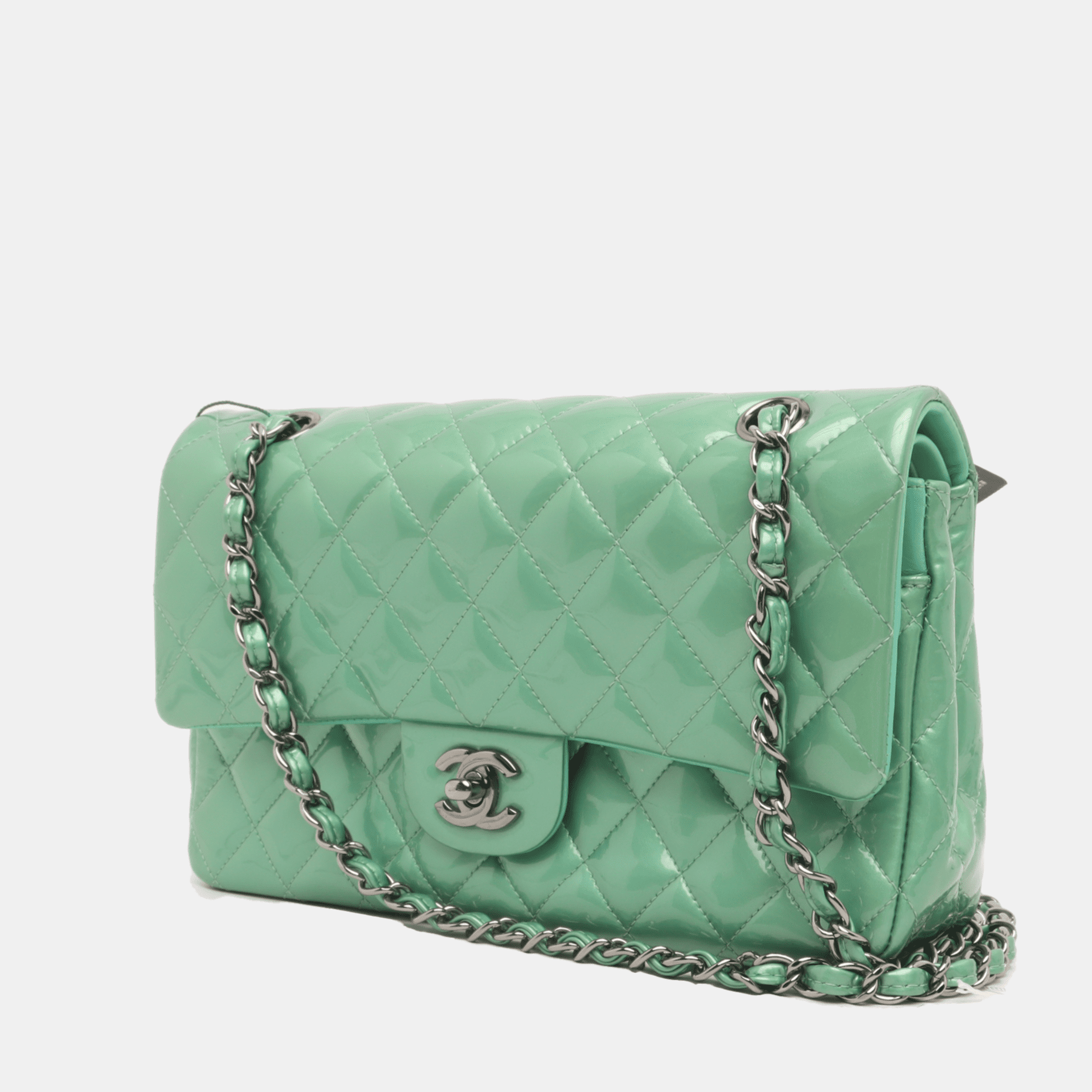 This Chanel bag is in very good condition. Parts of the bag have a tint of yellow due to the age of the bag. No cracks of the patent leather. Hardware in very good condition.Â