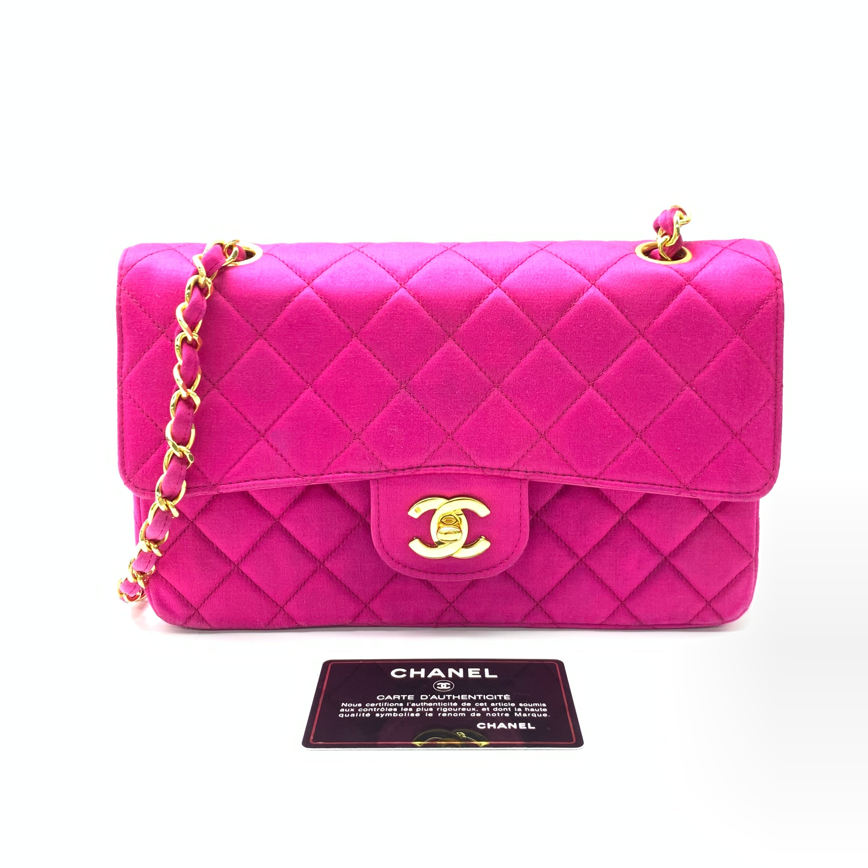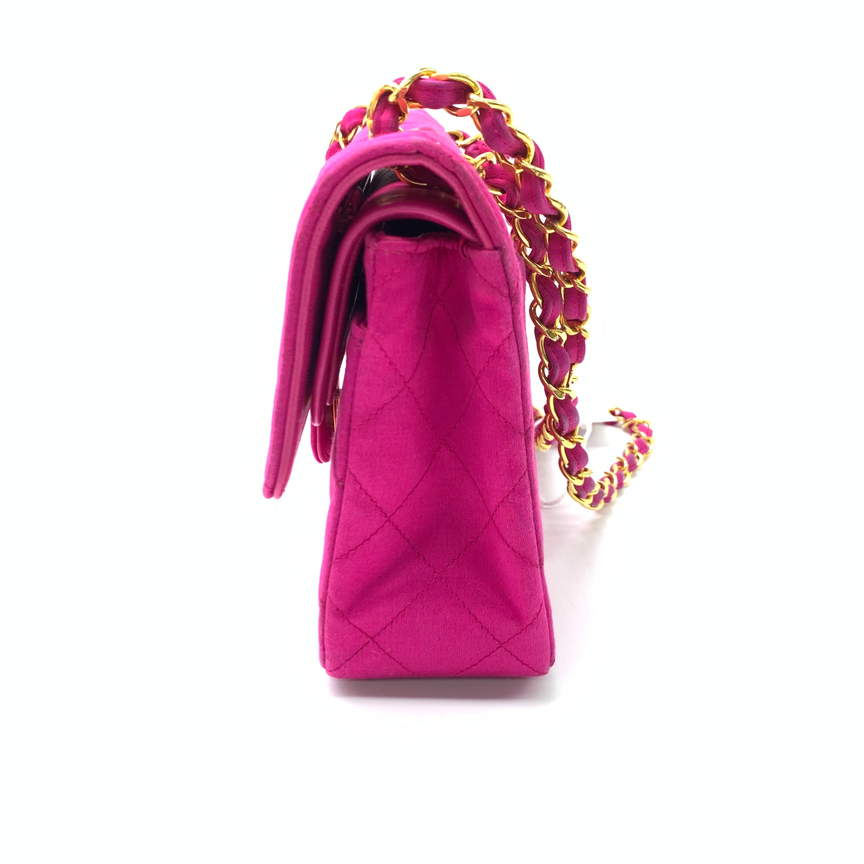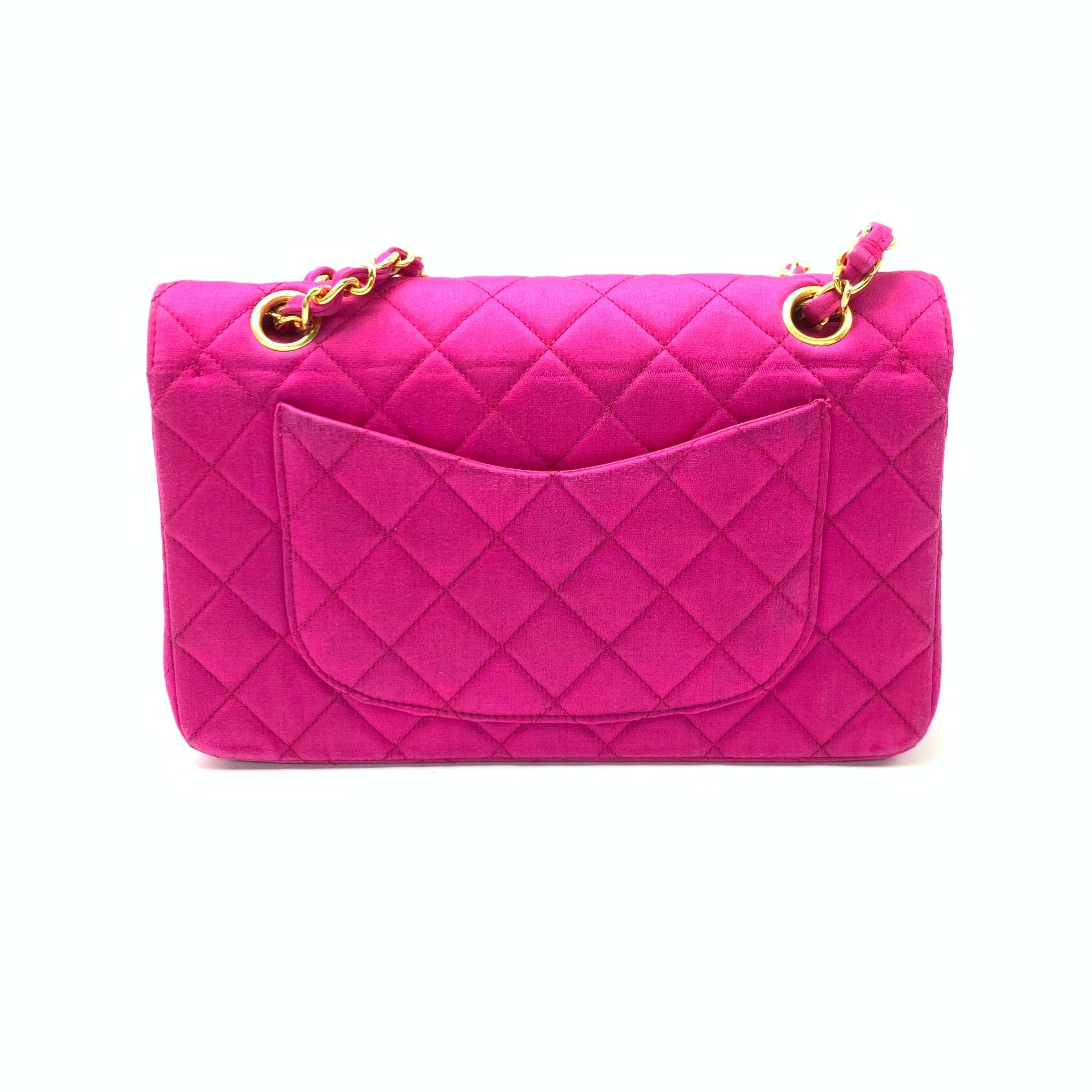 This one-of-a-kind Chanel Classic Flap Vintage bag is sure to grab attention in a crowd! Crafted from luxurious silk satin, it is adorned with 24k gold hardware which dazzles in the rare stunning fiery pink. Truly a collector’s item.Â