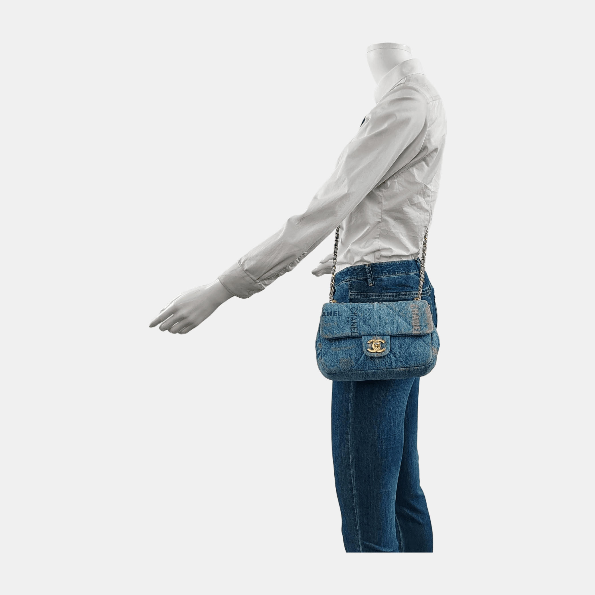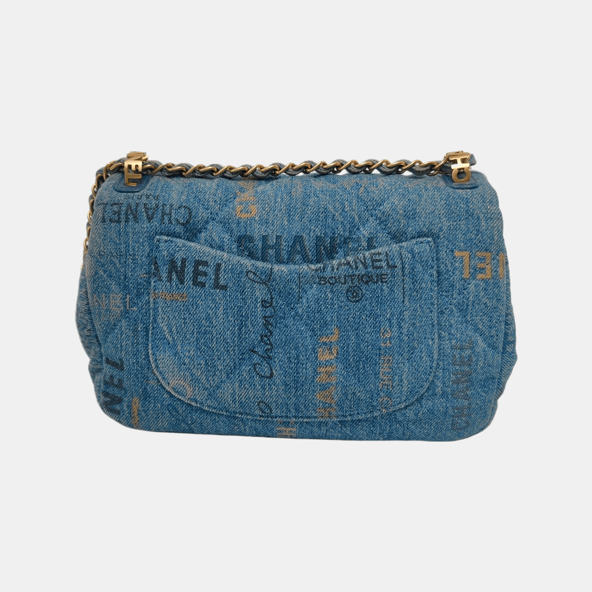This previously owned and used item is in very good condition with little some signs of use. Light scratches to the hardware. Light rubbing and stains on the denim around the corners and edges.Â