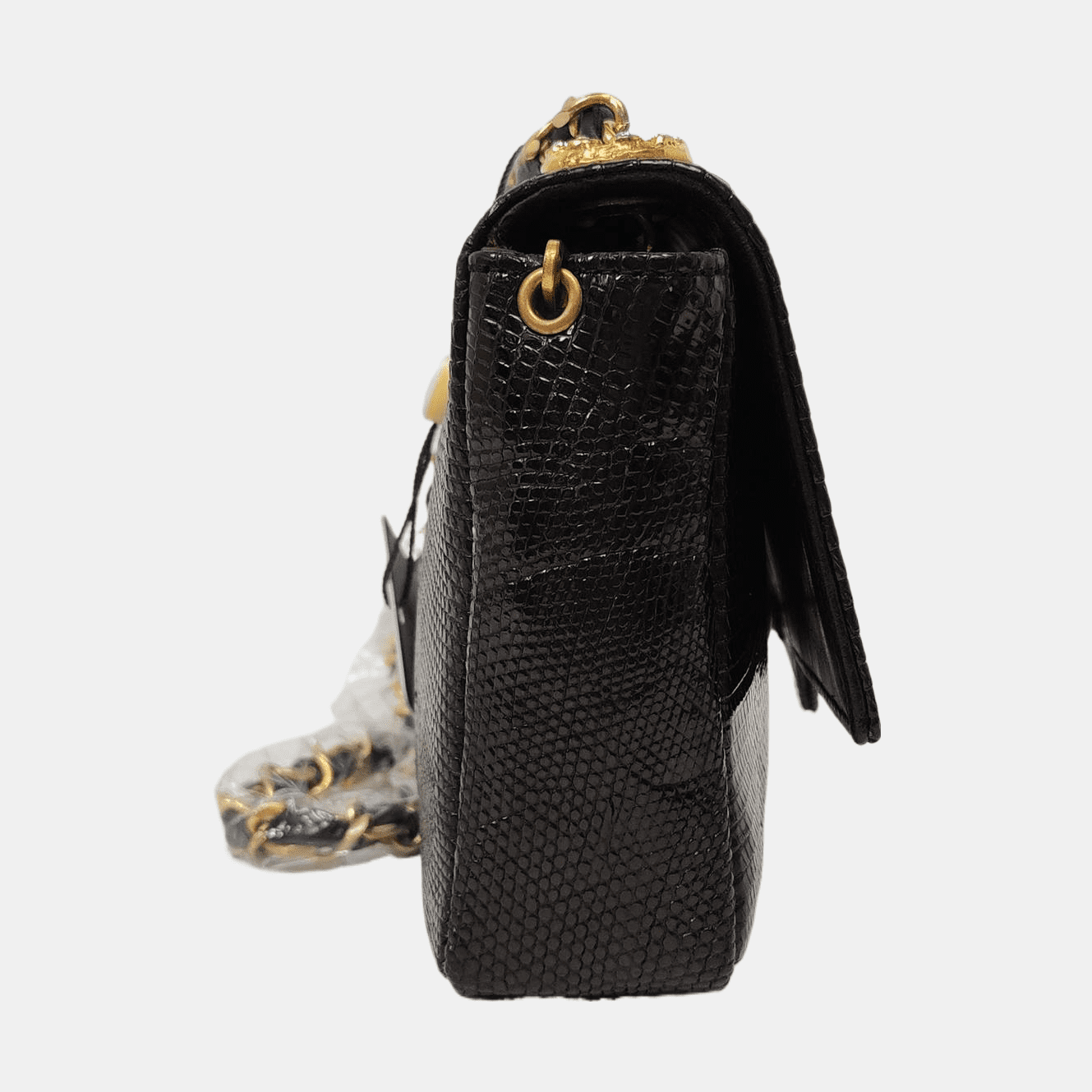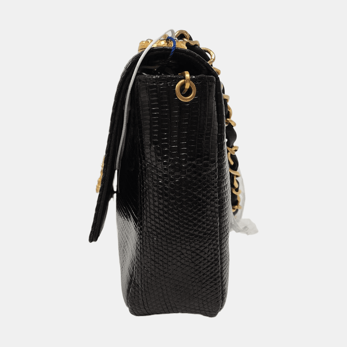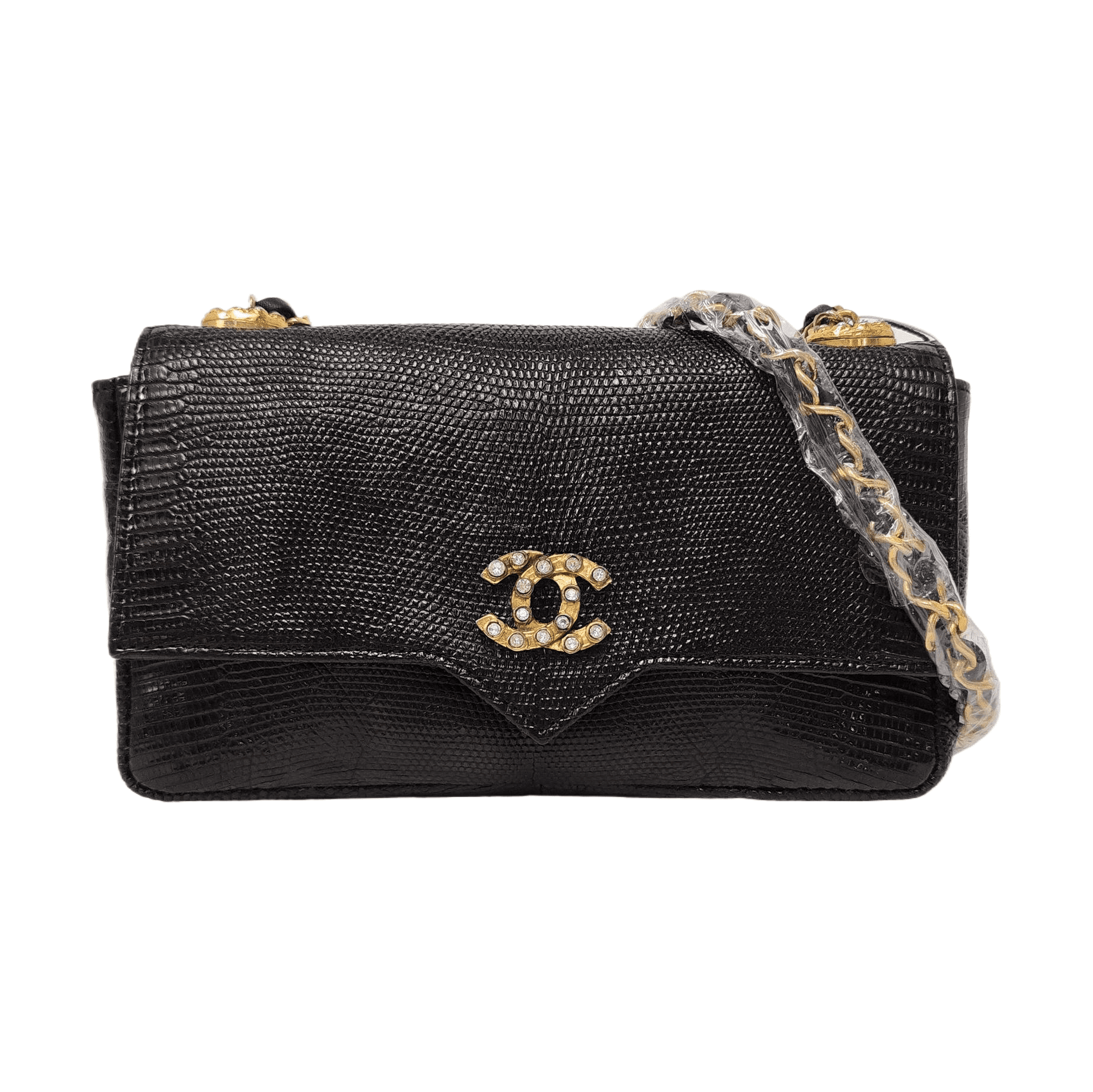 This one-of-a-kind Chanel Classic Flap Vintage bag exudes sophistication and timeless elegance. Crafted from lizard skin pattern embossed leather, it is adorned with gems studded CC buckle. This bag is truly a piece of luxury worth cherishing. The long strap enables it to be worn across the body.