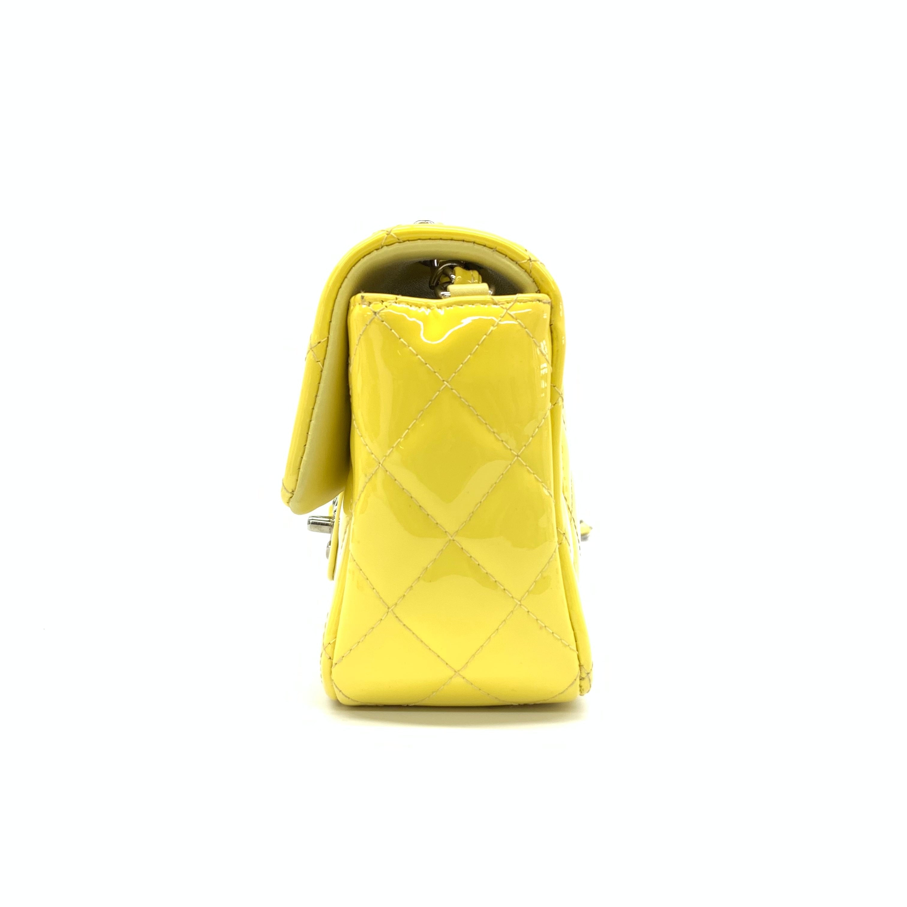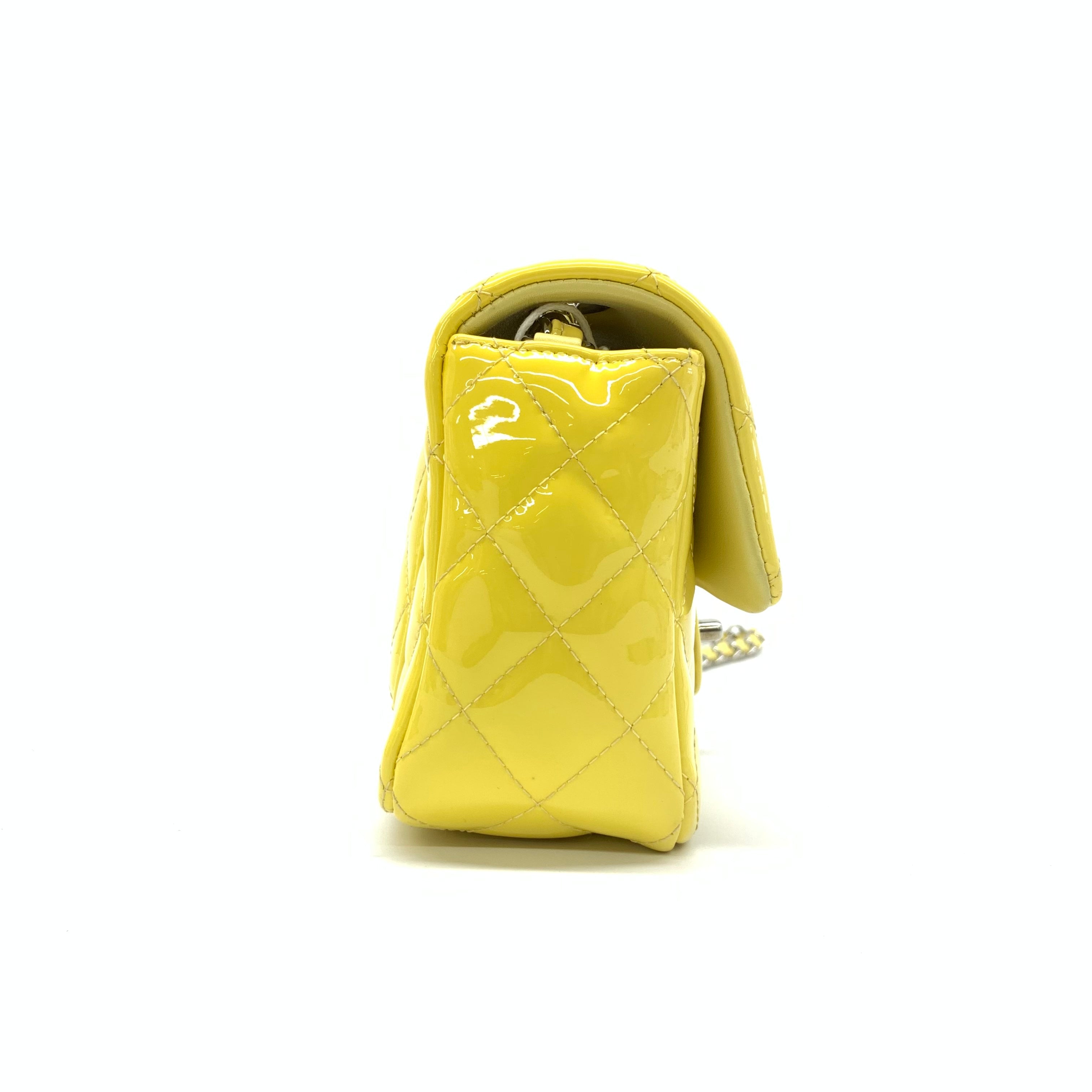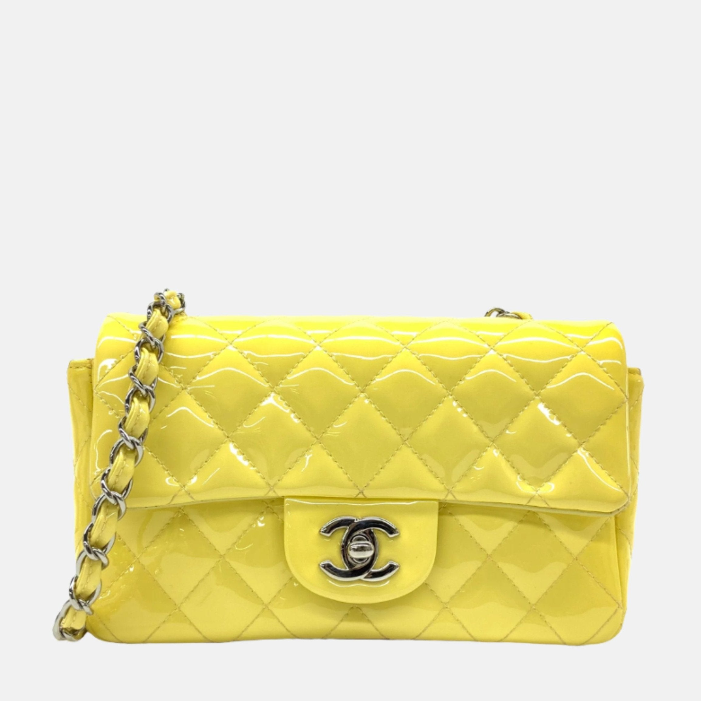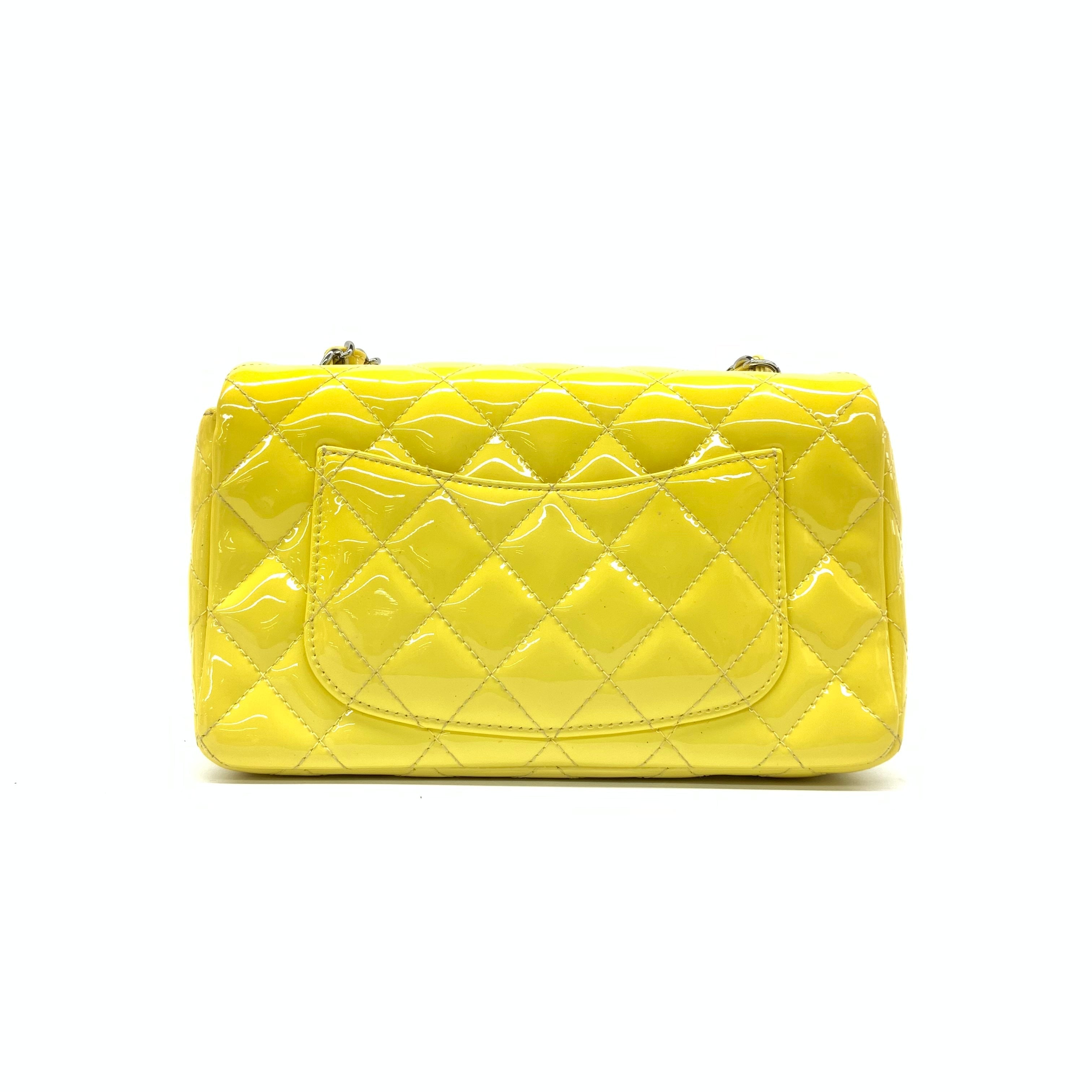 Add a touch of brightness to your summer wardrobe with this classic flap from Chanel, featuring a cheerful shine with its yellow patent leather.
