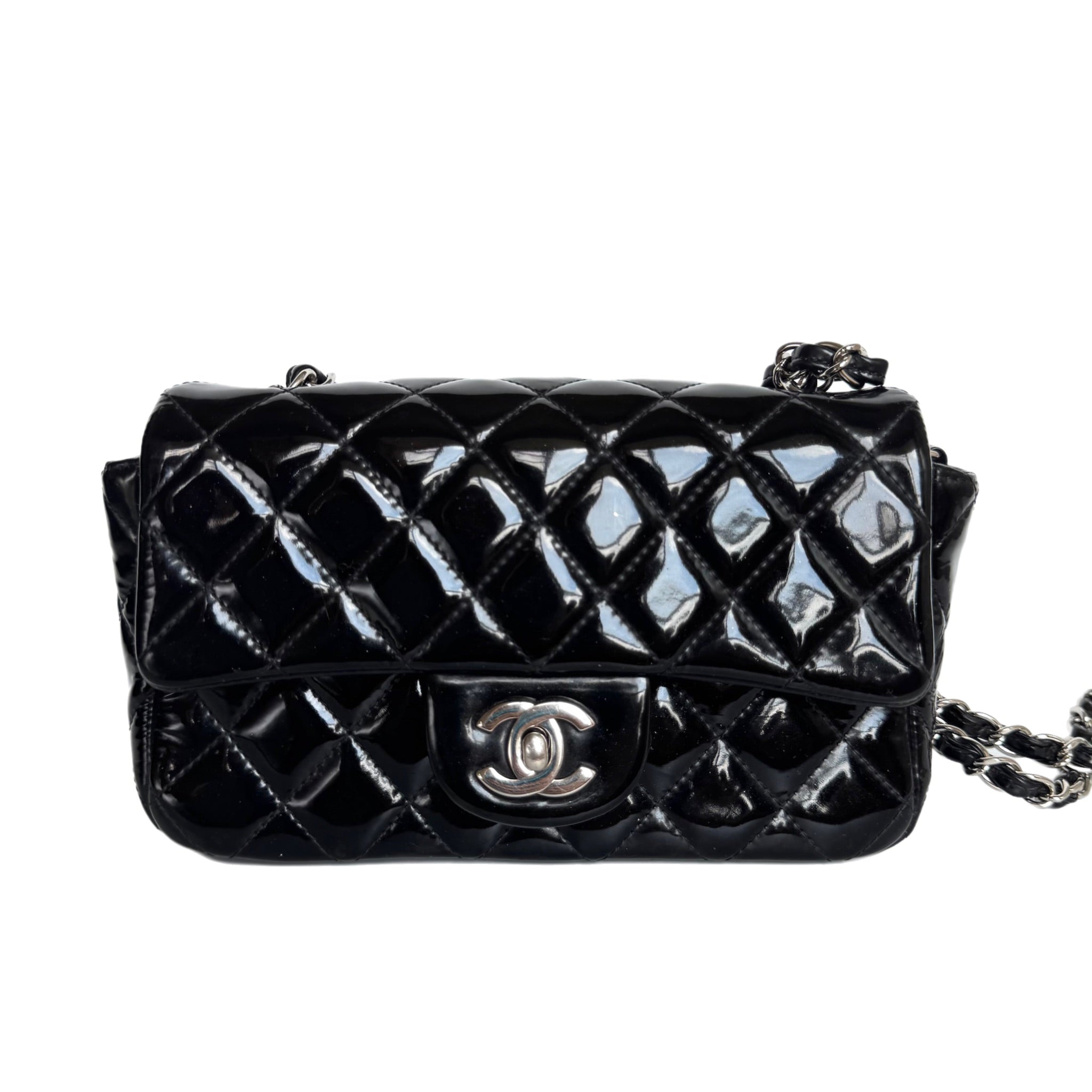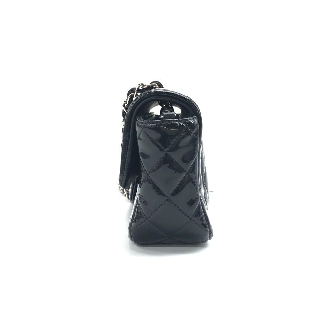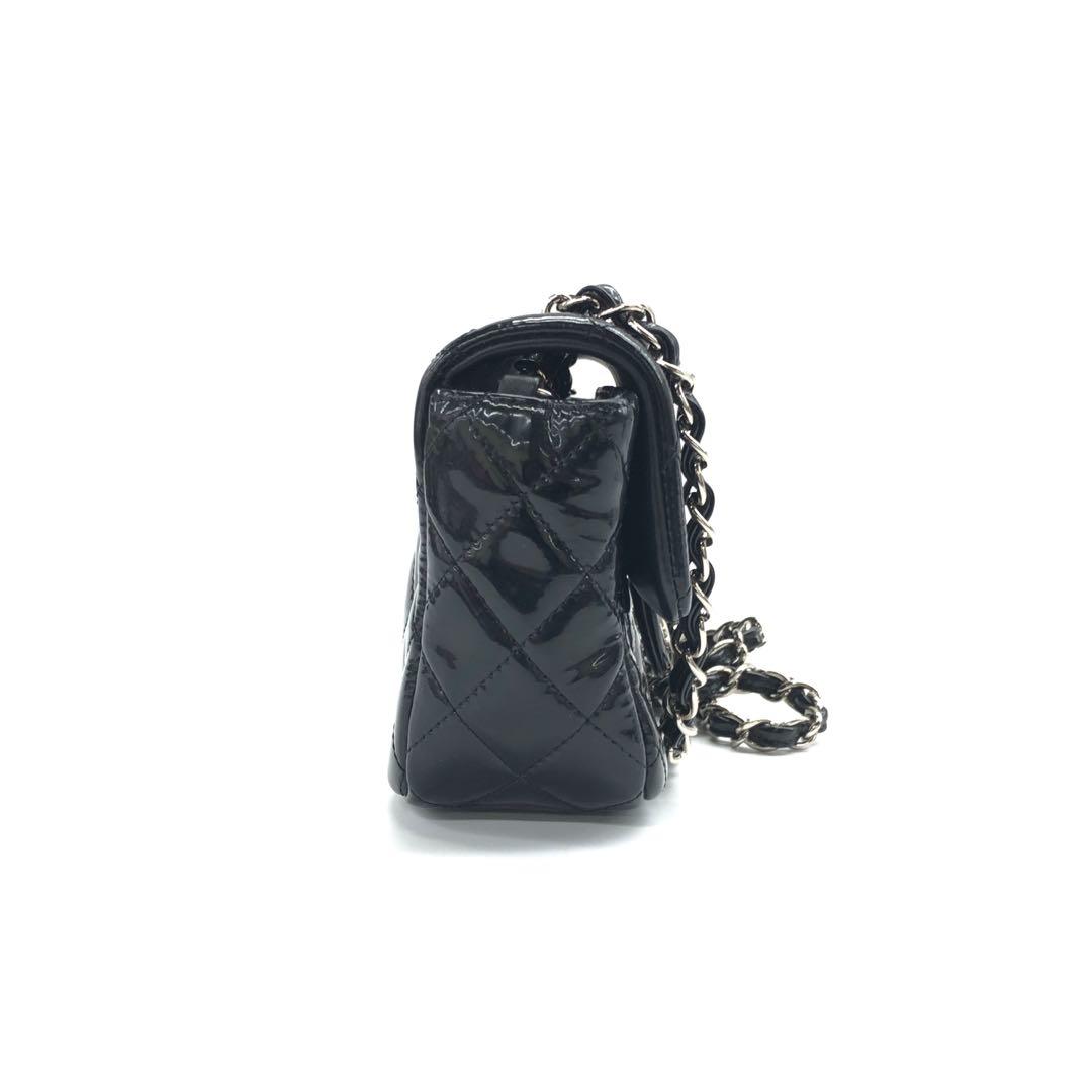 This previously owned and used item is in good condition with some signs of use. The patent leather feels slightly sticky. Scratches on the leather inside and hardware.Â