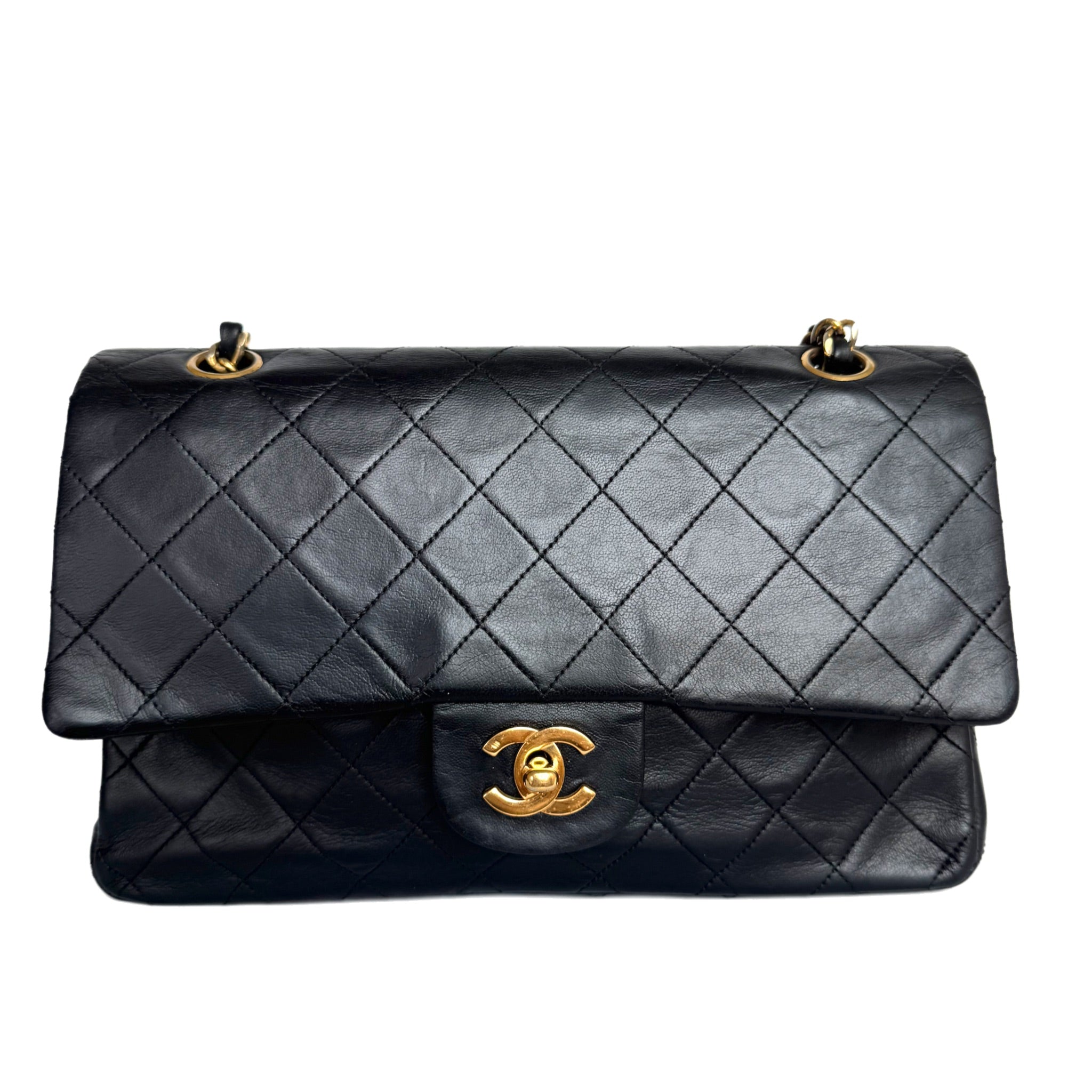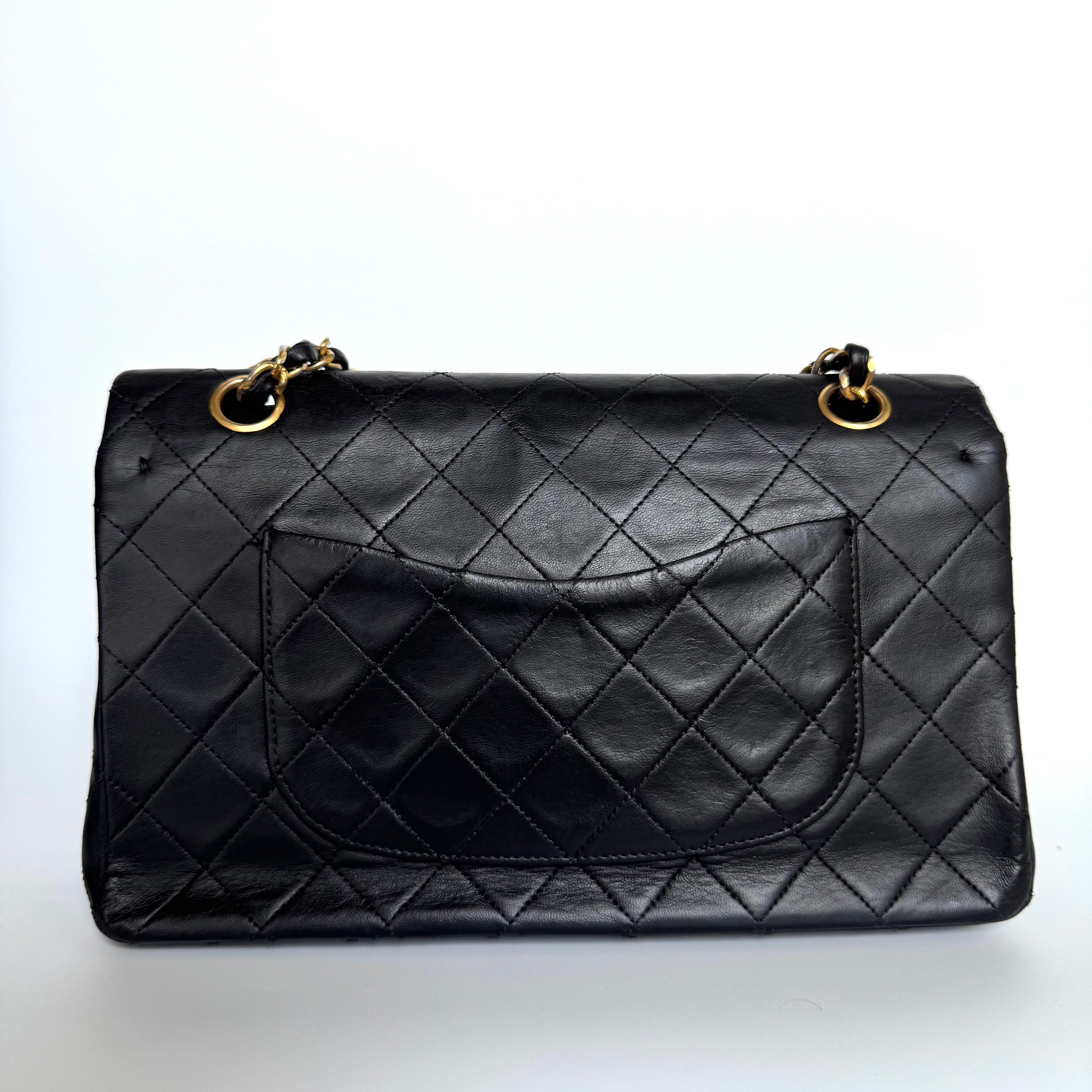 This one-of-a-kind Chanel Classic Flap Vintage bag exudes sophistication and timeless elegance. Crafted from luxurious black lambskin leather, it is adorned with 24k gold hardware. This bag is truly a piece of luxury worth cherishing.