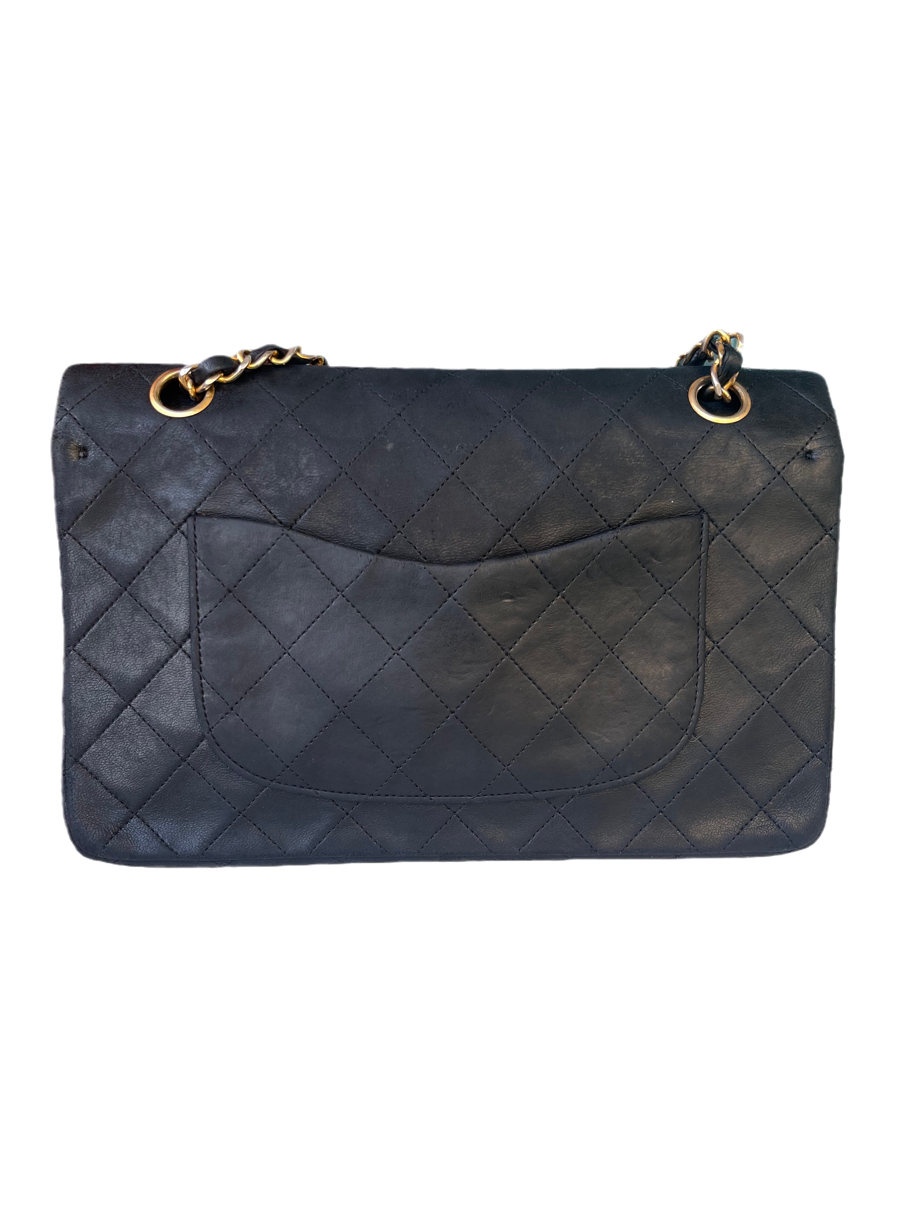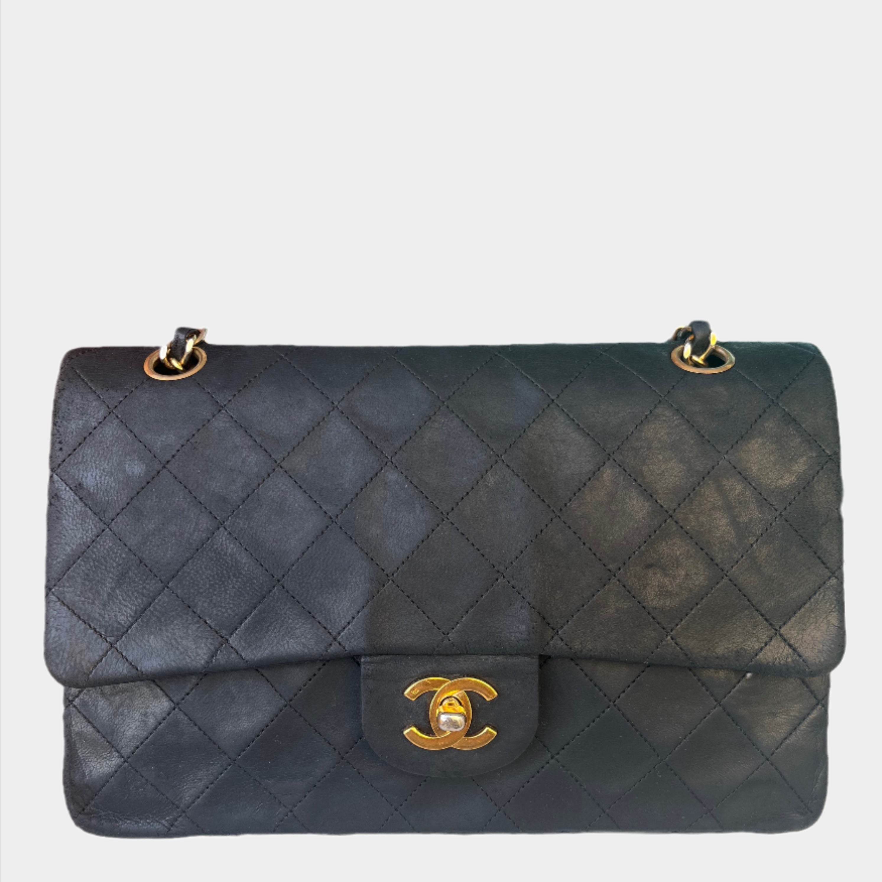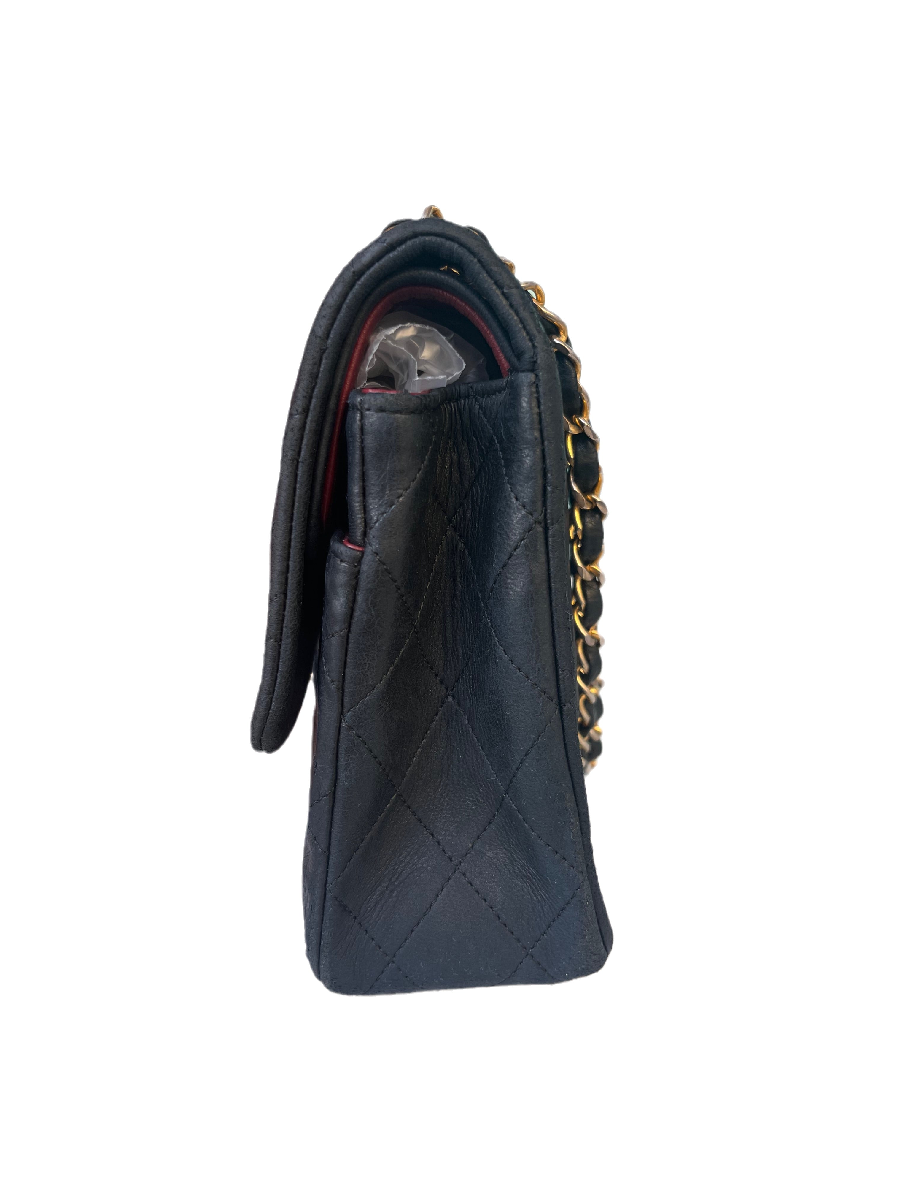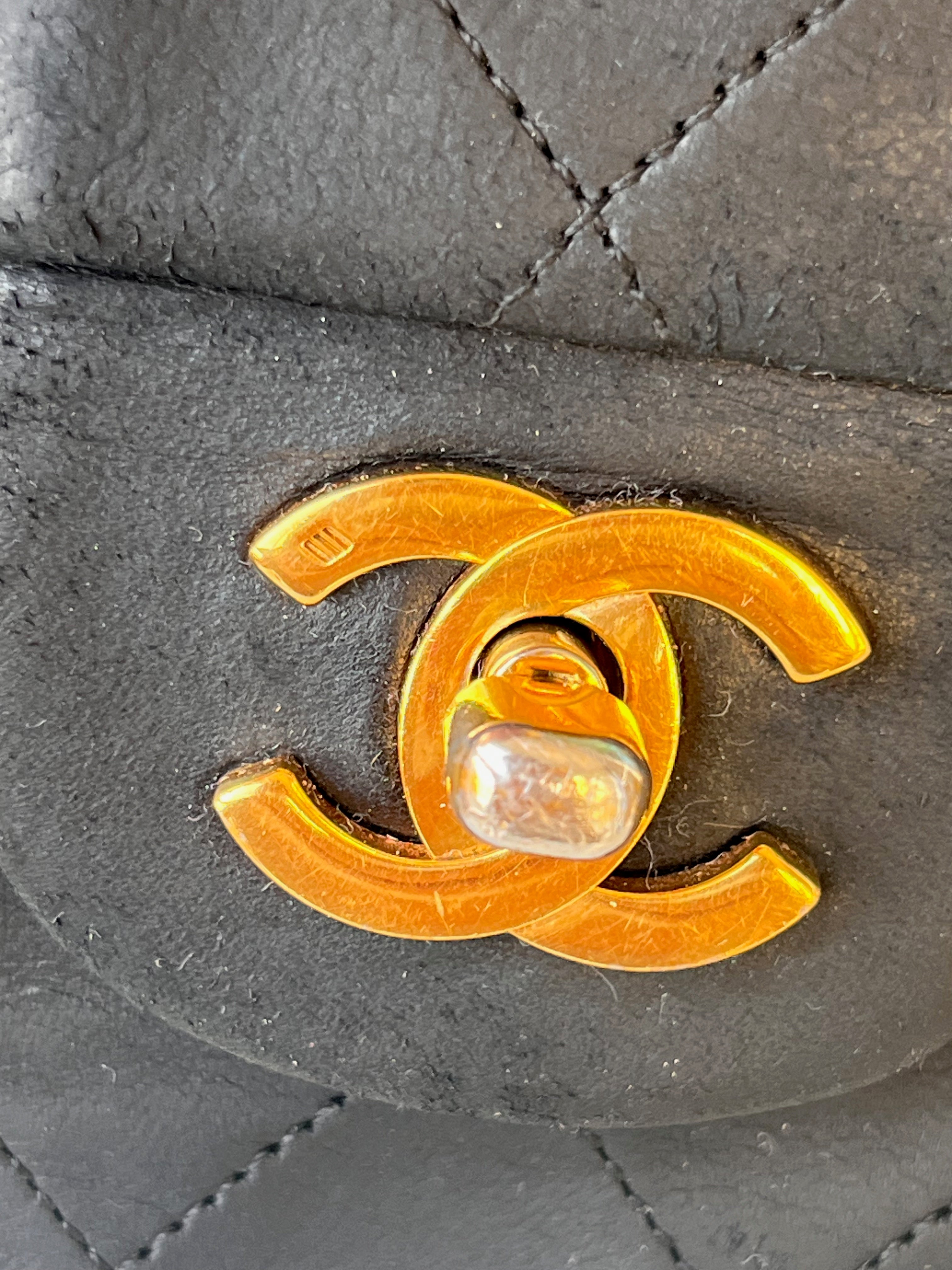 This one-of-a-kind Chanel Classic Flap Vintage bag exudes sophistication and timeless elegance. Crafted from luxurious black lambskin leather, it is adorned with 24k gold hardware. Made in between 1996-1997, this bag dates almost 30 years, remaining in remarkably pristine condition. Inside the bag, a soft interior houses a serial number seal that has broken, This bag is truly a piece of luxury worth cherishing.