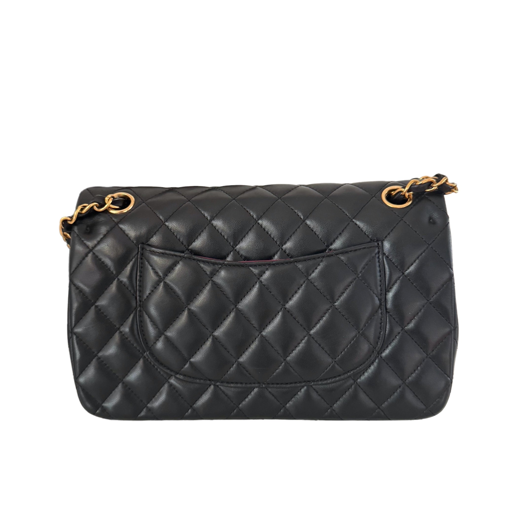 This one-of-a-kind Chanel Timeless Classic Flap Vintage bag exudes sophistication and timeless elegance. Crafted from luxurious black lambskin leather, it is adorned with 24k gold hardware.