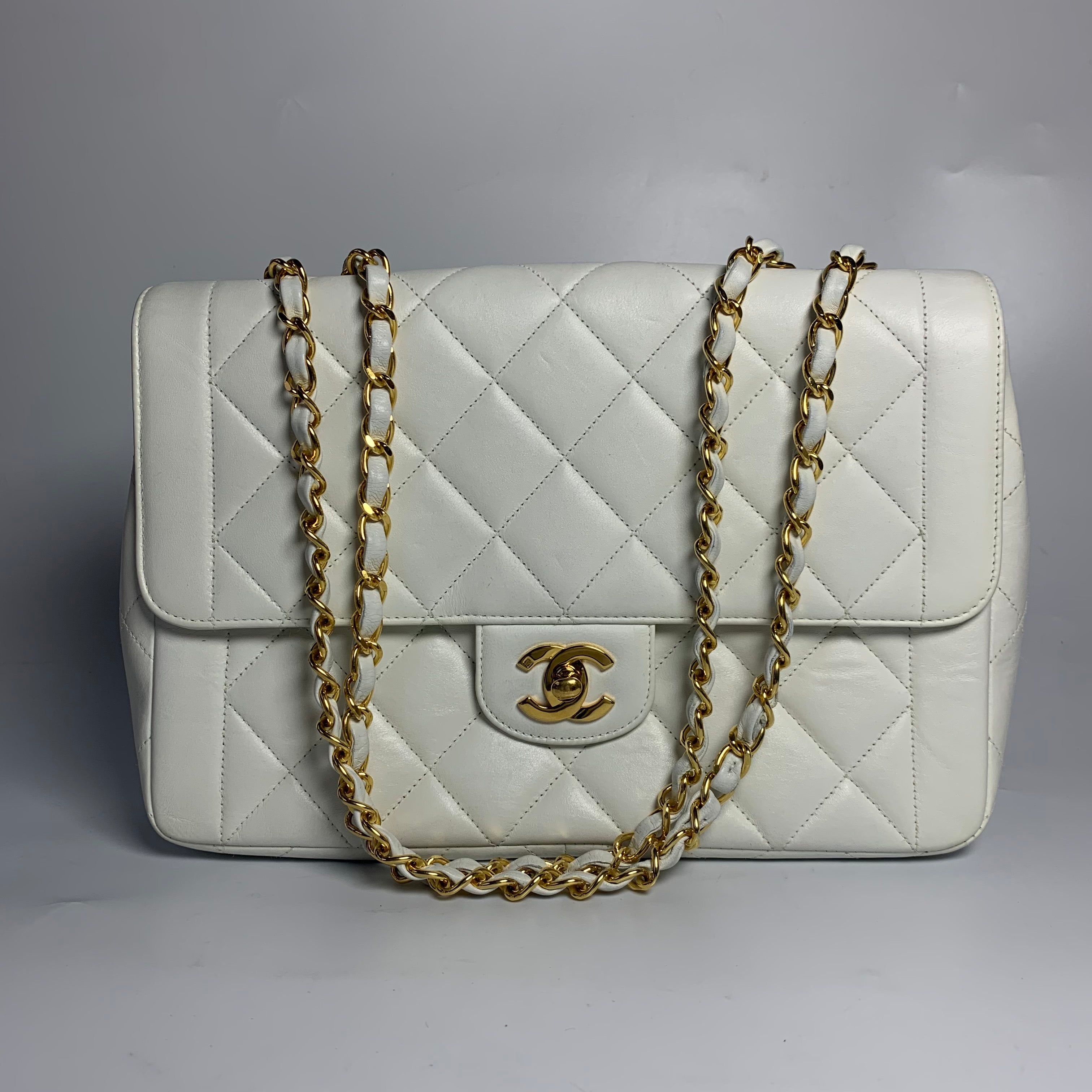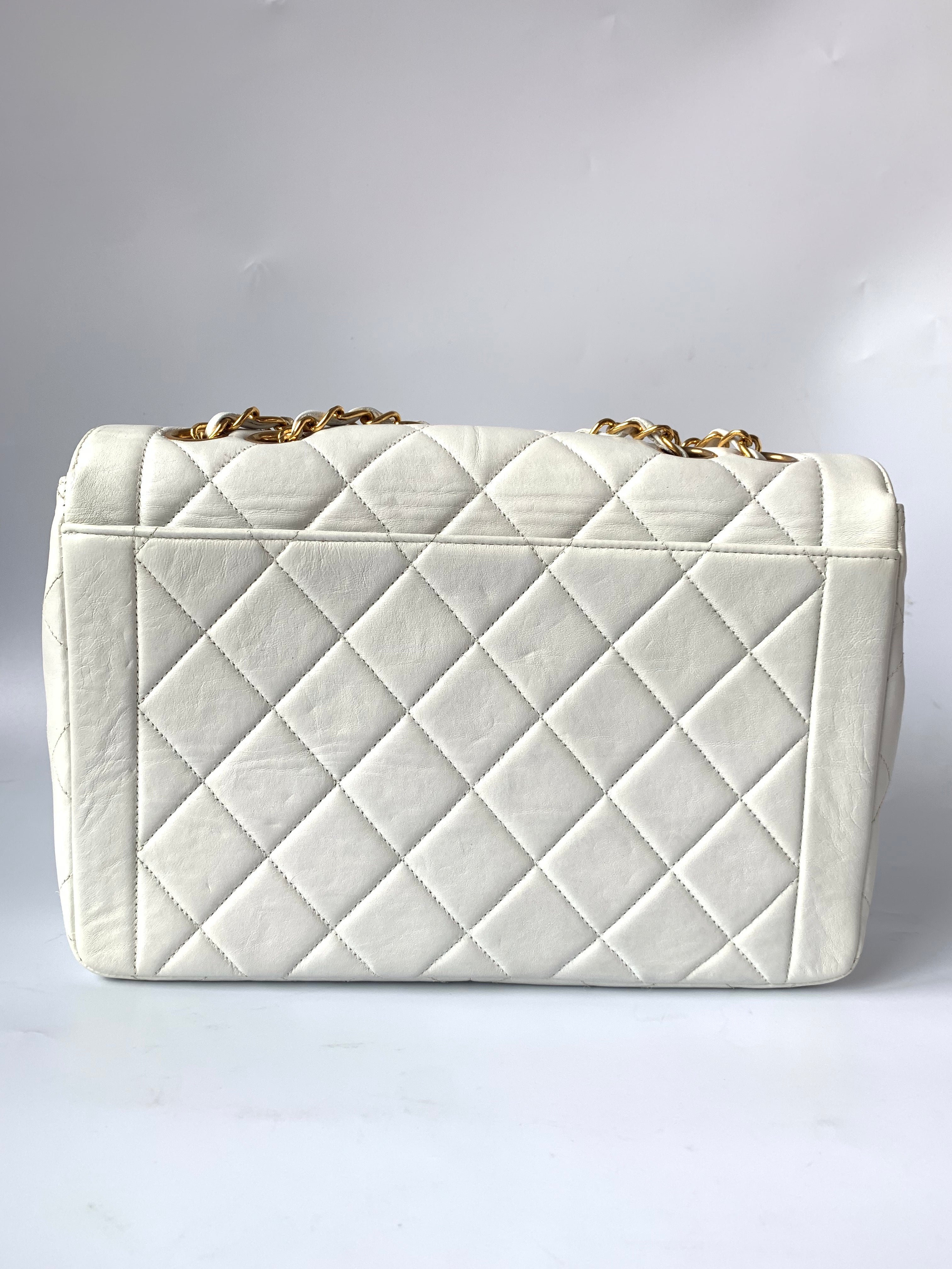Experience timeless elegance with the Chanel Vintage Classic Flap Square Shoulder Bag. Crafted with luxurious lambskin leather and 24k gold plated hardware, this stunning bag exudes sophistication. The iconic big CC logo stands out against the white color, making it a statement piece for any occasion.