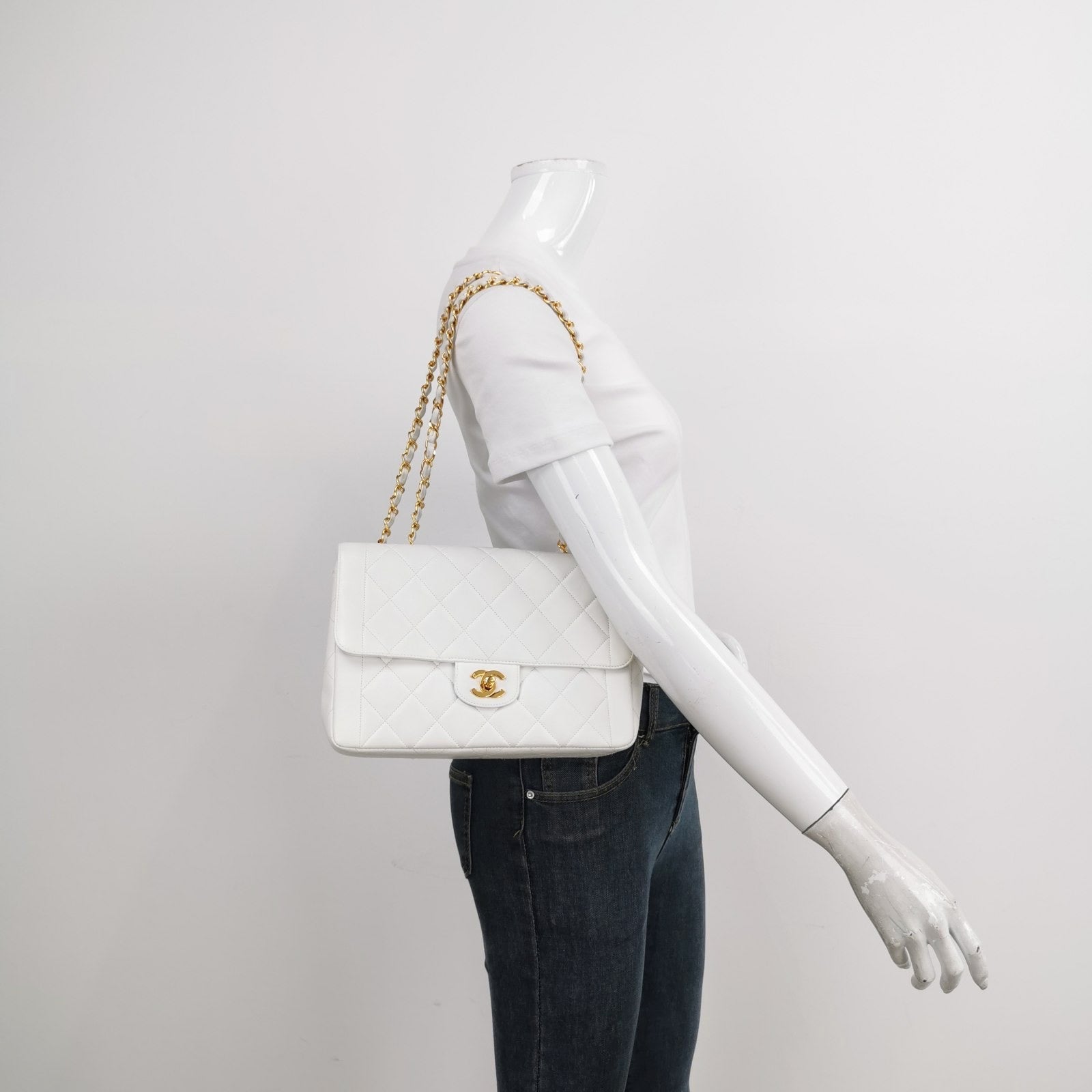 Chanel Classic Flap 1996 White Leather 24k Gold Plated Giant CC LogoChanel Classic Flap 1996 White Leather 24k Gold Plated Giant CC Logo